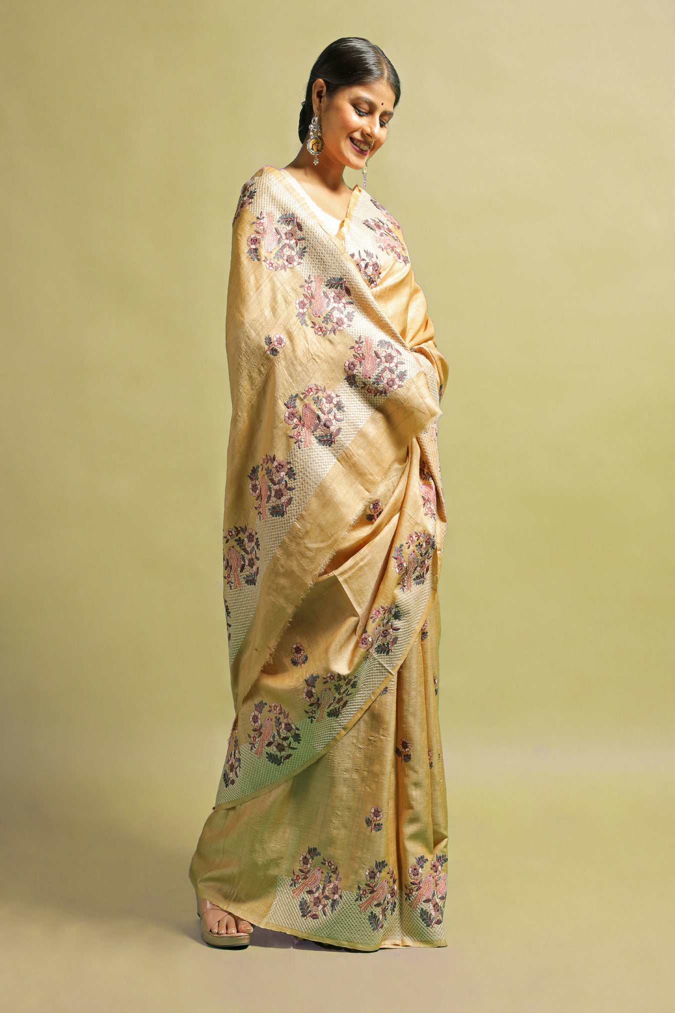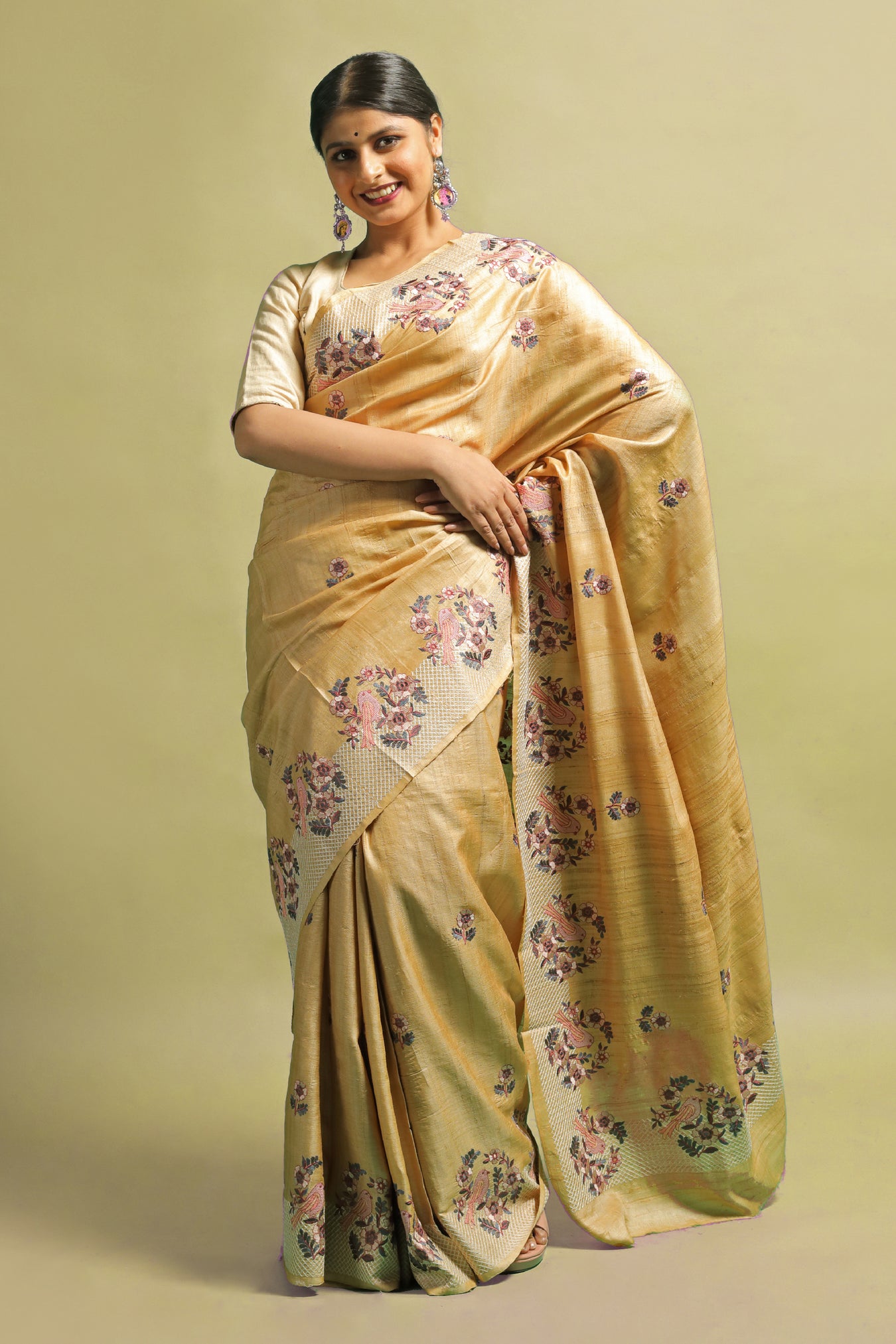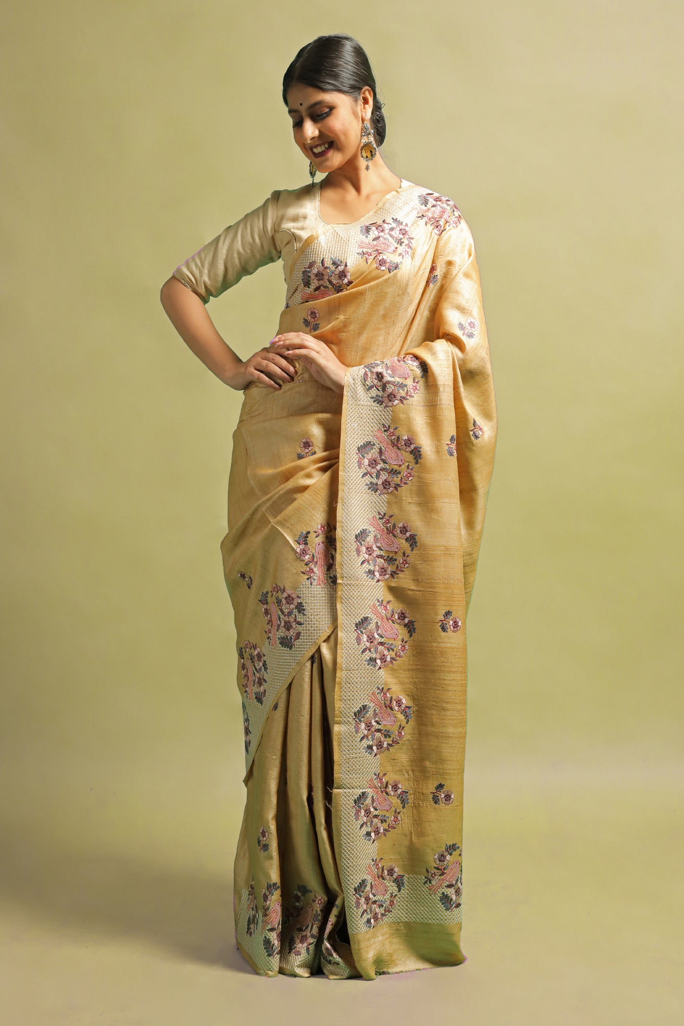 A Tussar silk saree adorned with intricate embroidered flower motifs on the borders, palla, and all over. The elegant design showcases the craftsmanship of the motifs, contrasting dark threads against a soft pastel earthy backdrop.
