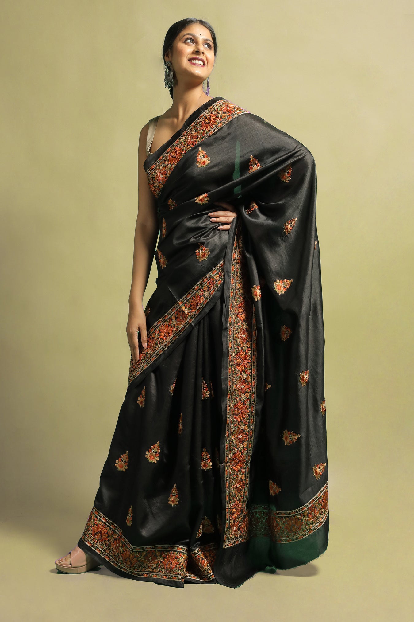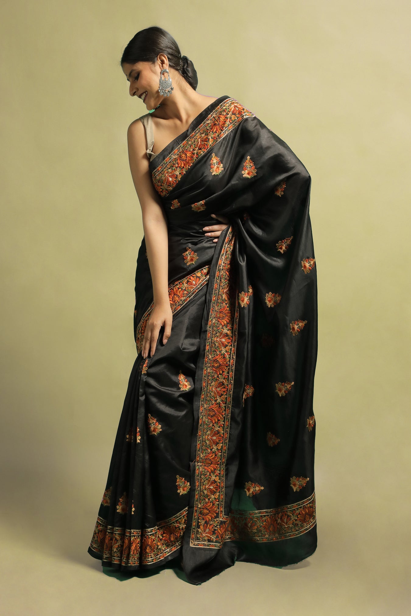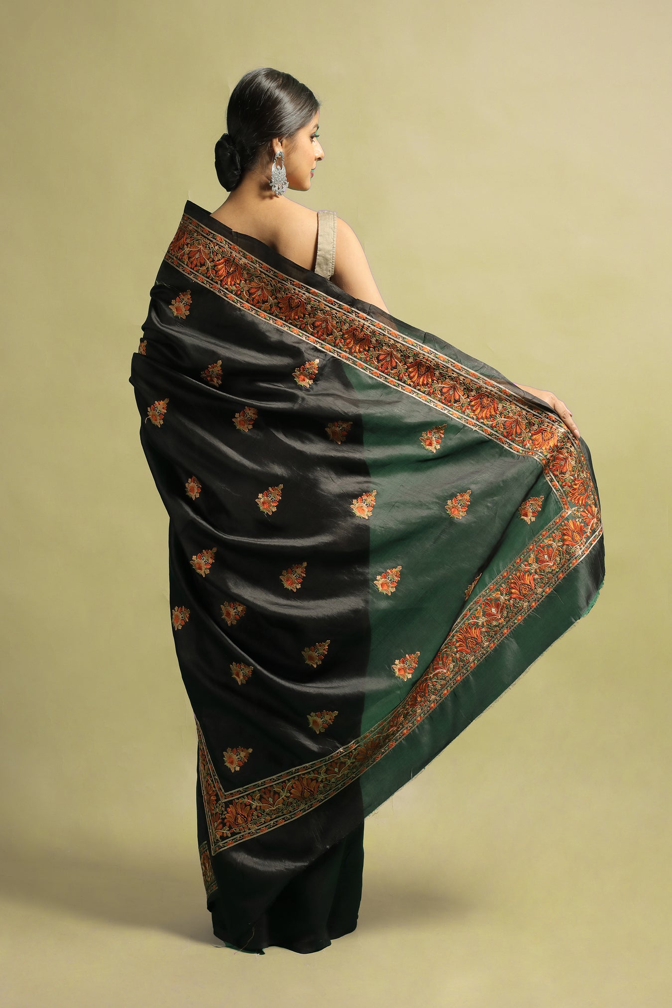 Indulge in timeless elegance with our embroidered Tussar Silk saree. Adorned with intricate flower motifs and contrasting threads, this saree captivates attention with its dark toned base.