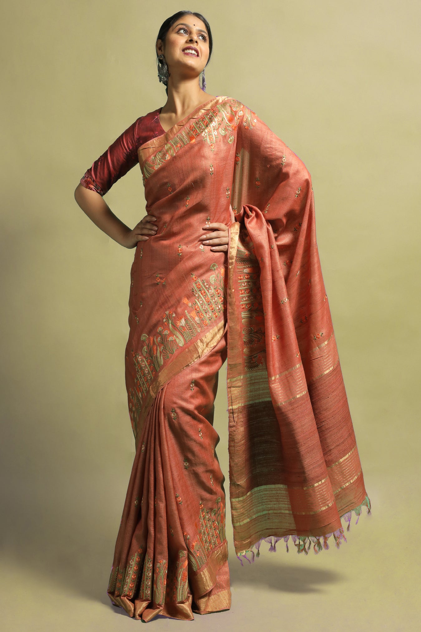 Tussar silk saree with lovely embroidered floral motifs all over the saree and elaborate embroidered stylized flower motifs around the borders. On an earthy toned saree, the design highlights the elegance of the stitched motifs with contrasting pastel colored threads, giving this piece a prominent point. A zari strip woven into the saree's border adds a touch of glitter to the overall look. Darker pastel colored wide strips paired with zari strips accentuate the saree's palla. While delicately draping around your curves, the saree complements your feminine attractiveness. This piece oozes elegance while highlighting feminine appeal.