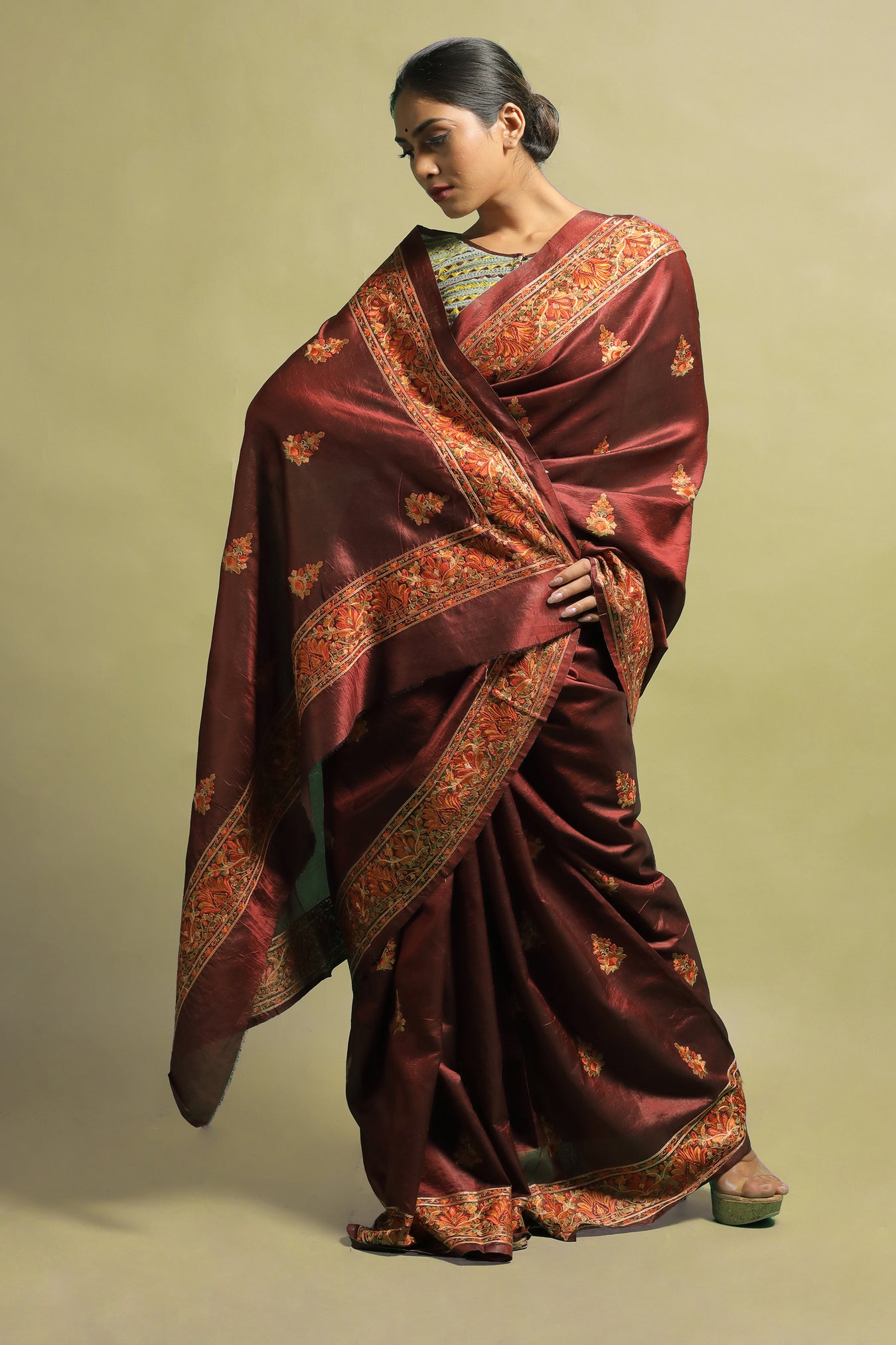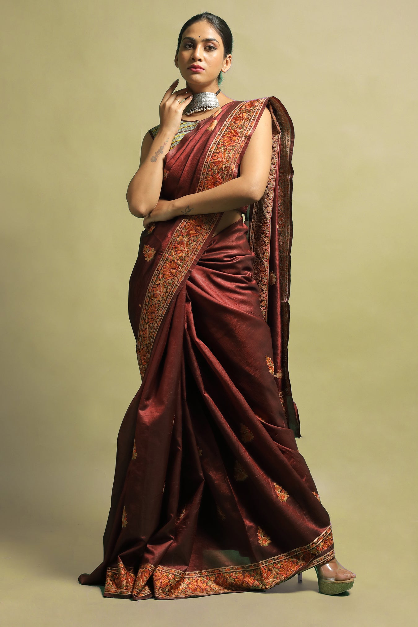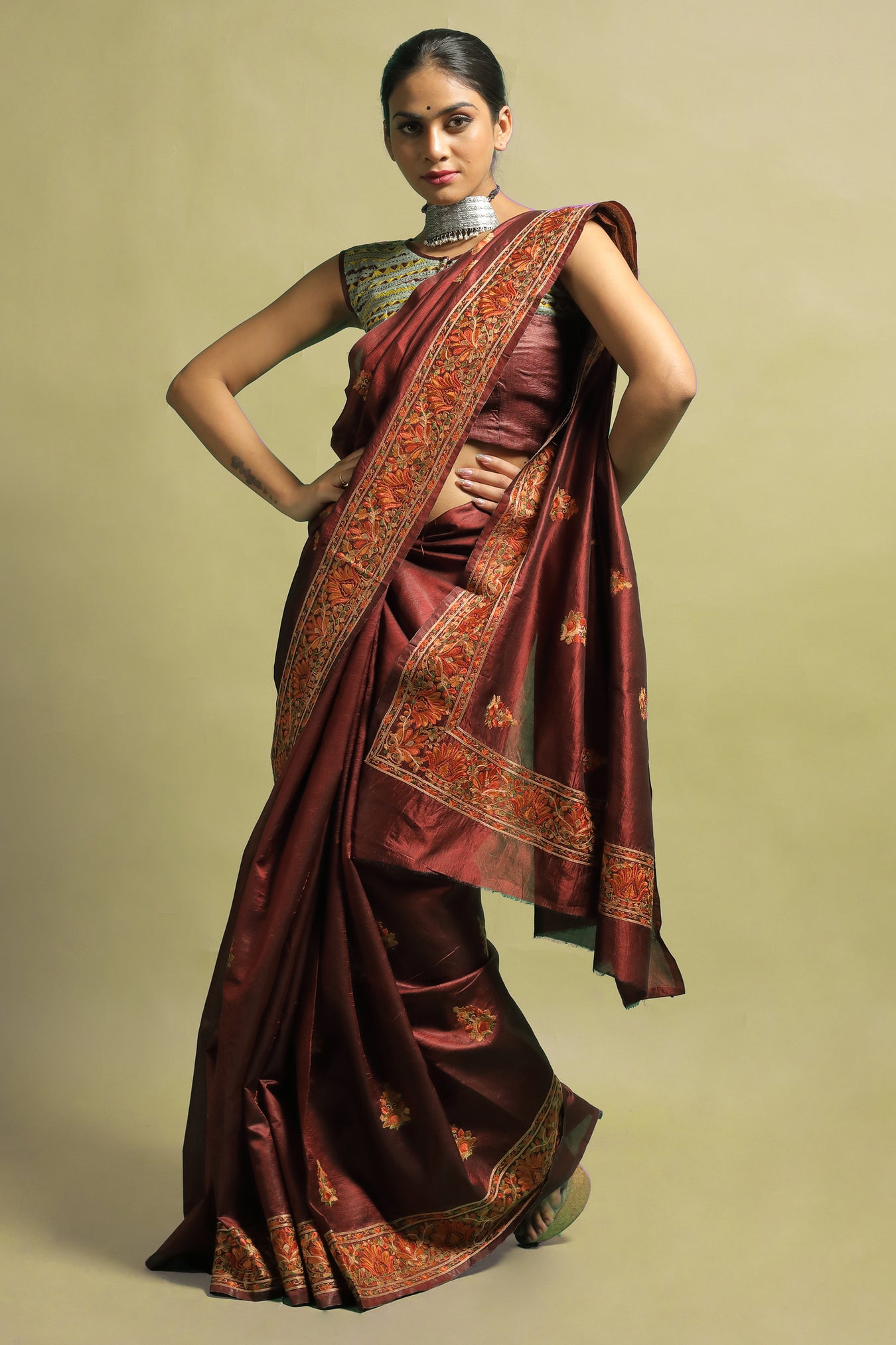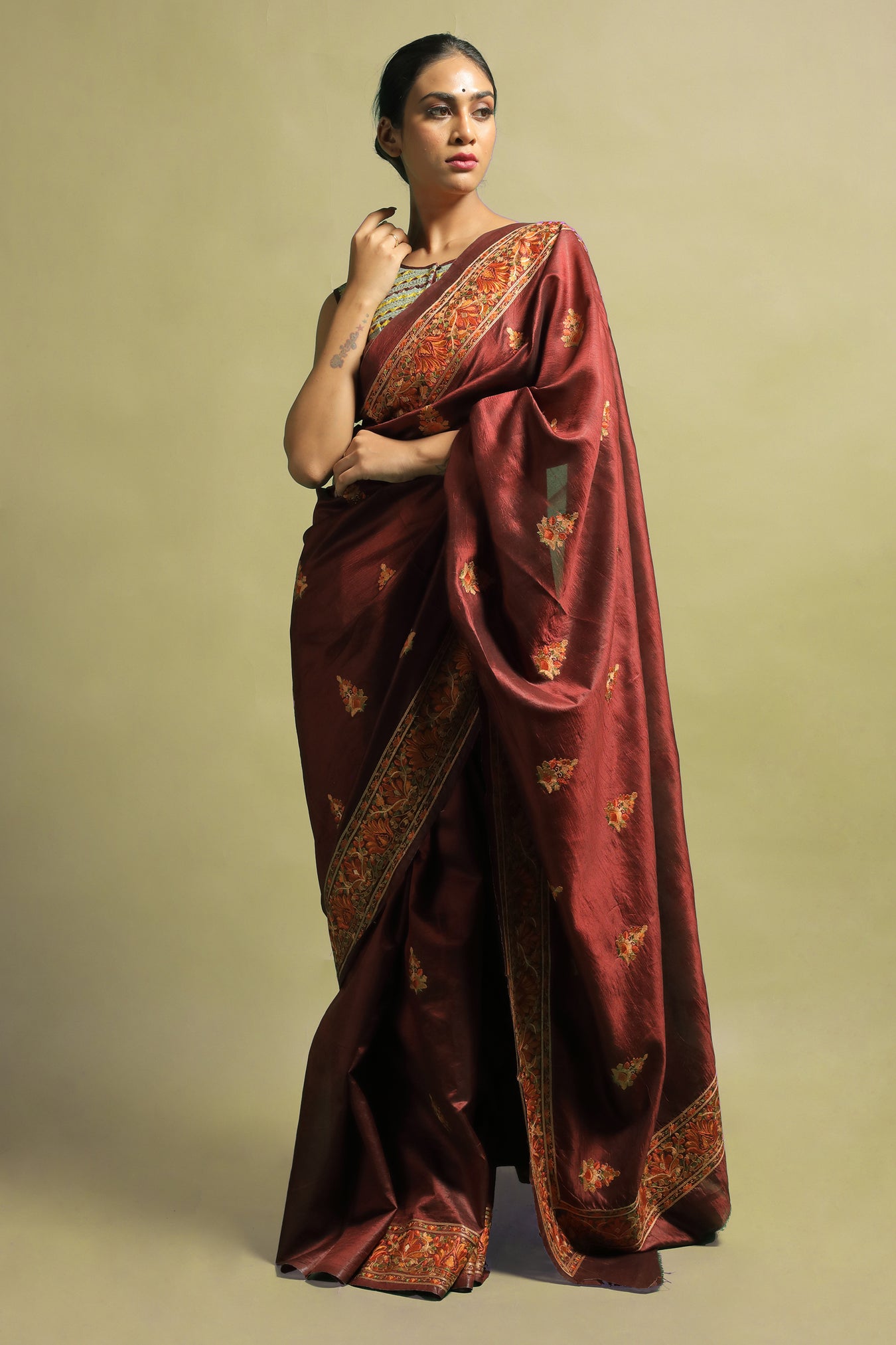 Tussar silk saree with detailed embroidered traditional floral motifs around the borders and lovely embroidered floral motifs all over. The design highlights the elegance of the embroidered motifs with contrasting bright and pastel toned threads on a dark toned saree, making this piece stand out. Its highlight is the intricacy of the delicate detailed motifs on a bold toned surface. The saree's subtle shine and luster add to its beauty. The saree draws attention to your feminine beauty while gently draping around your curves. This piece exudes elegance while emphasizing feminine beauty.