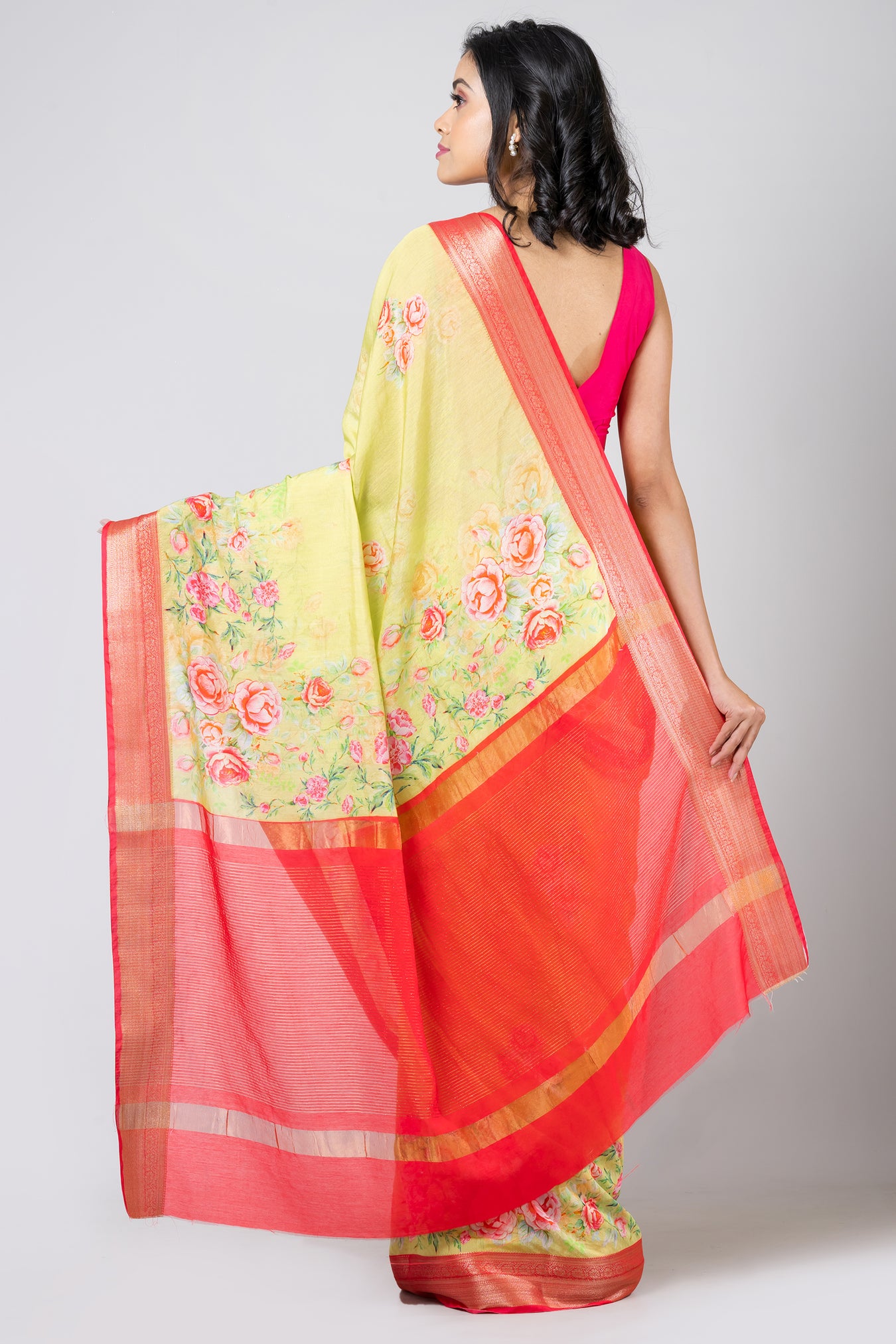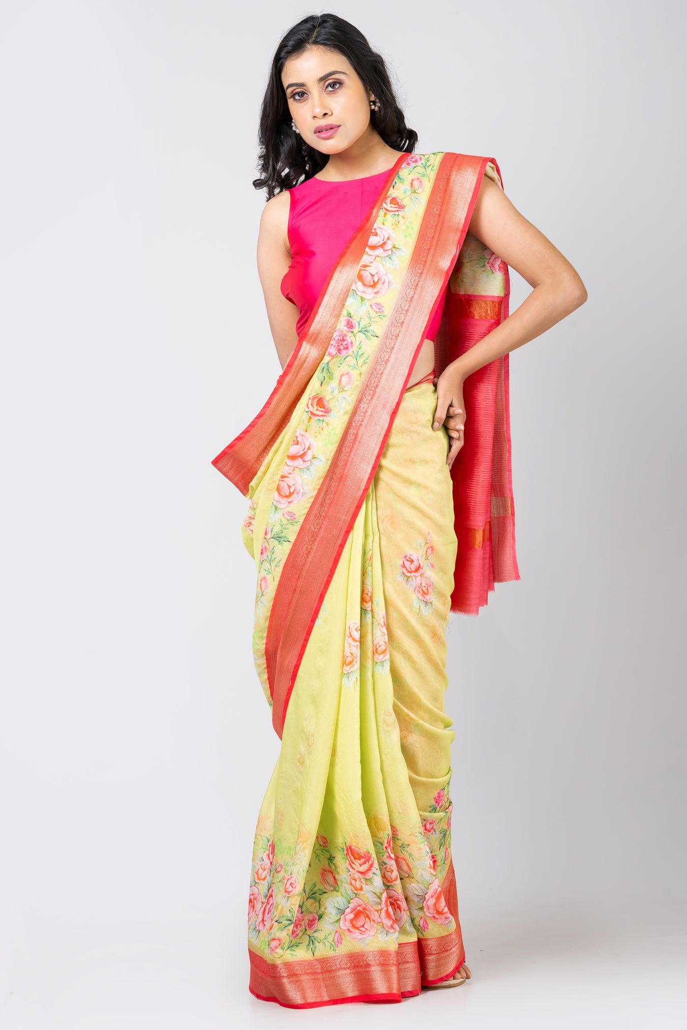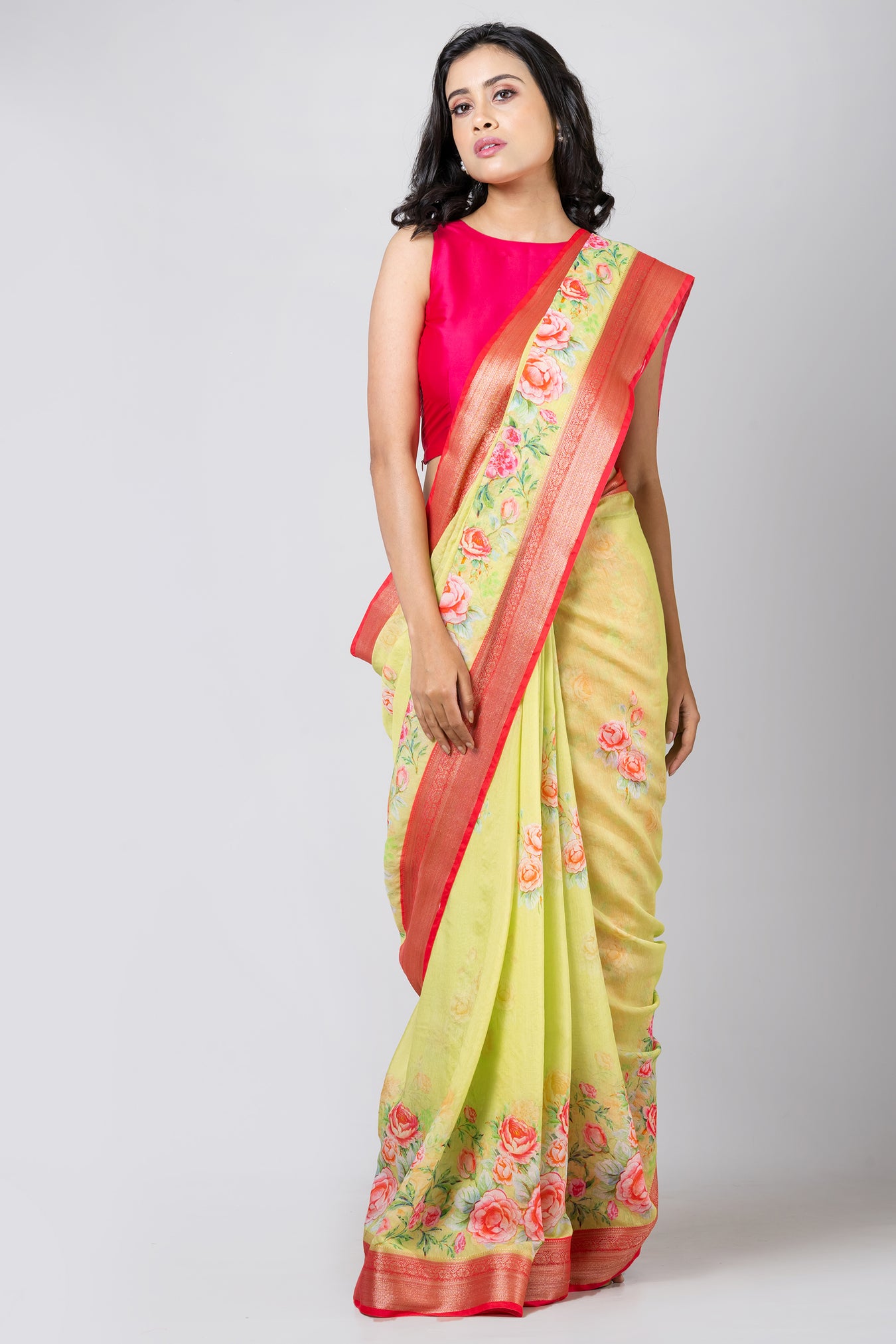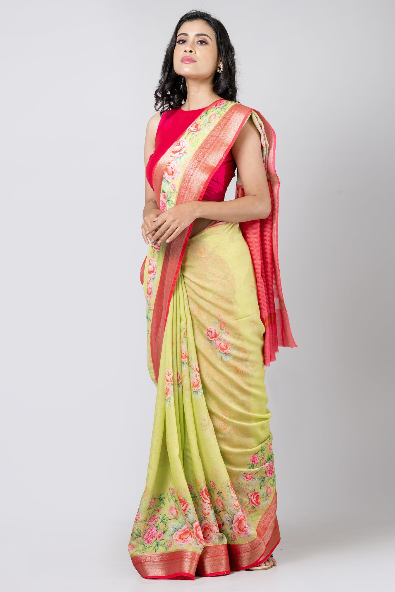 Size: 5.50Mtr B: 0.80MtrColour: LIME GREENFabric: CHANDERIPattern and print: This green saree with a red zari border and rose flower print would offer a delightful blend of colors.Pack contains: 1 Saree, 1 BlouseCare instructions: Dry wash