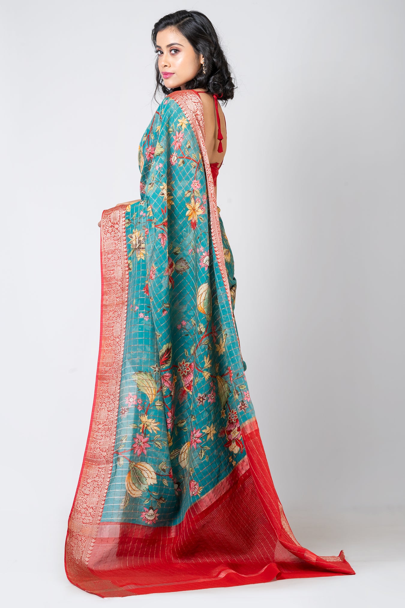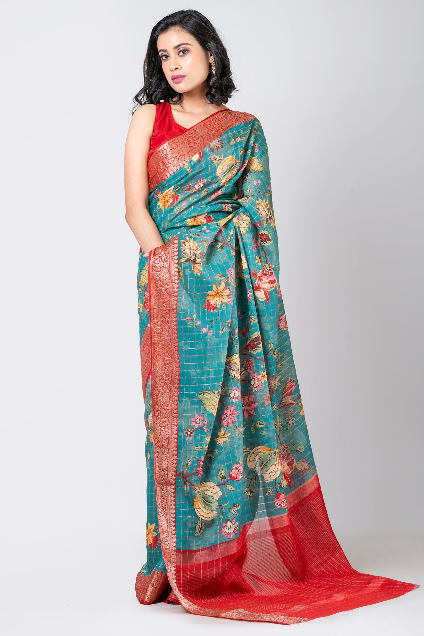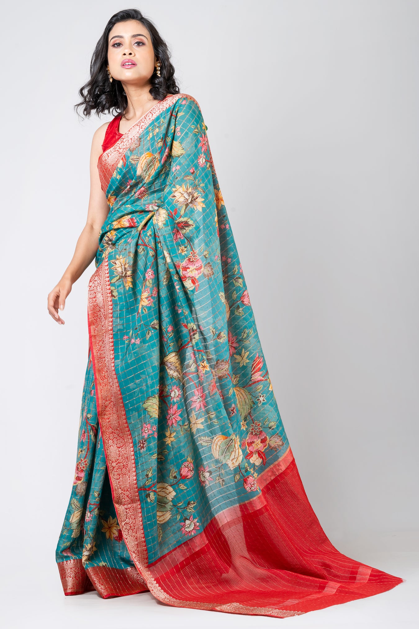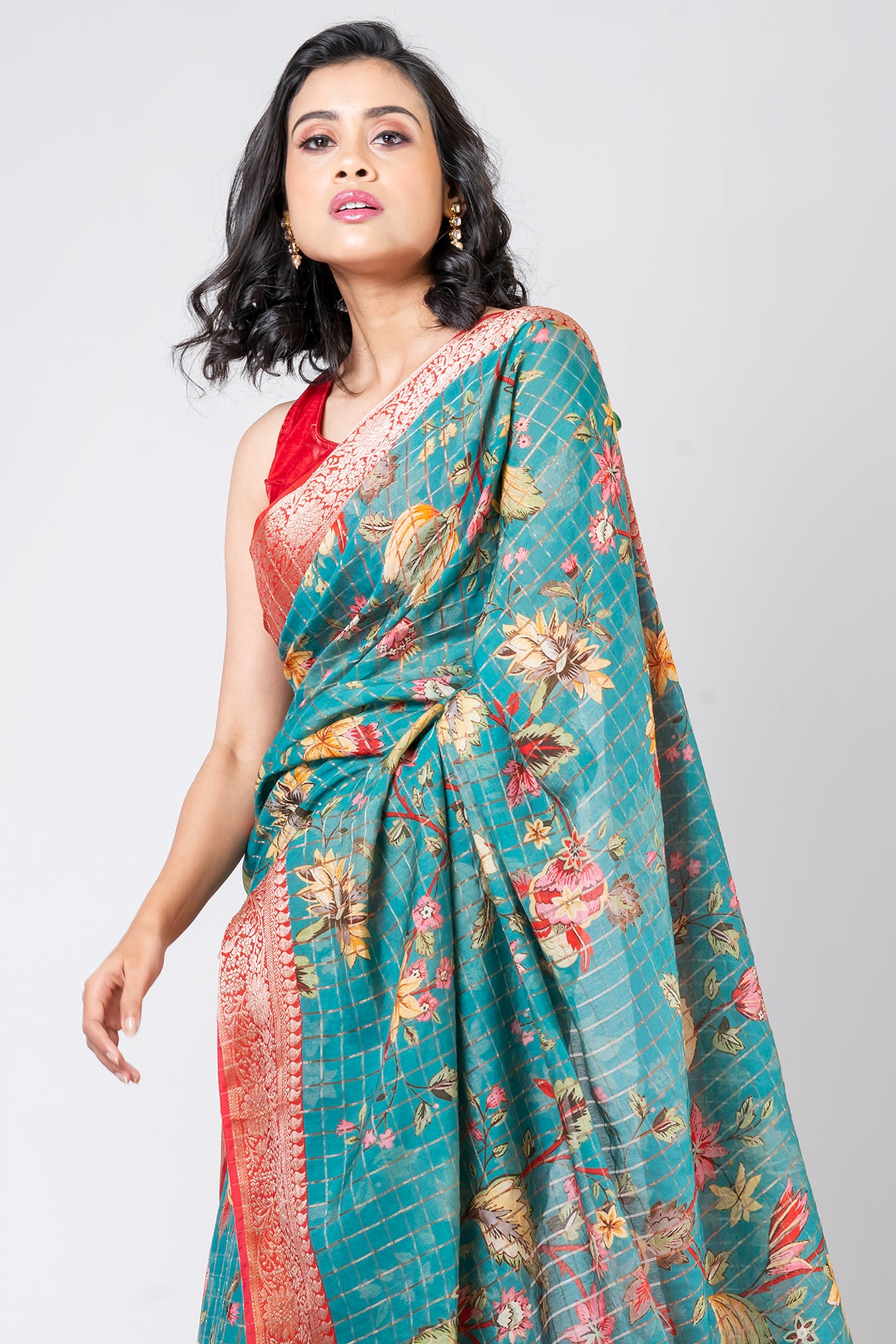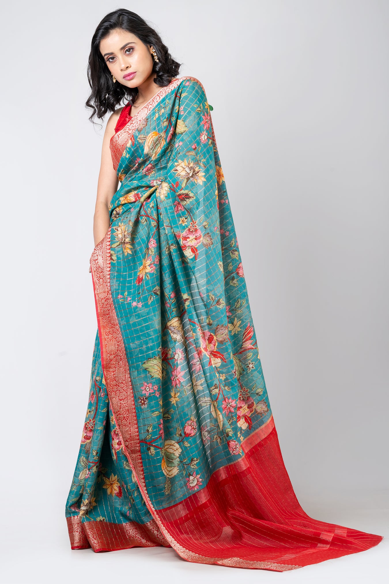 Size: 5.50Mtr B: 0.80MtrColour: DARK SEA GREENFabric: CHANDERI CHECKSPattern and print: This saree features a rich dark sea green hue complemented by a striking red zari border, adding a touch of elegance. Adorned with a vibrant array of digital flowers intricately designed throughout the saree, it exudes a captivating and lively charm, perfect for any special occasion.Silk purity: Pack contains: 1 Saree, 1 BlouseCare instructions: Dry wash