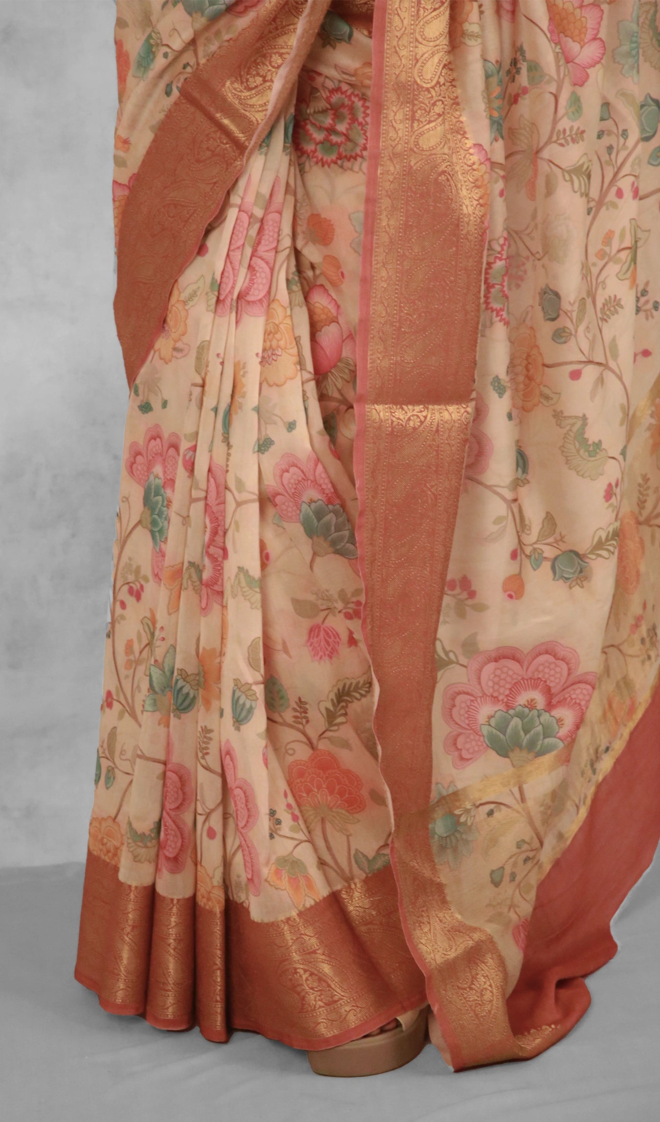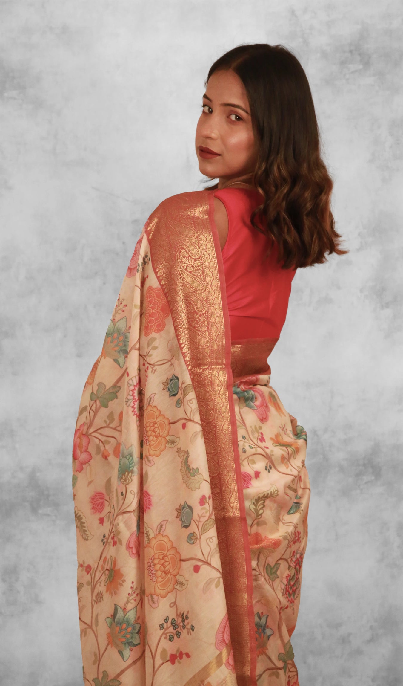 Welcome to a world of enchantment with our Chanderi Zari Woven saree. The light peach pink saree with an orange border creates a captivating contrast. Adorned with bright traditional floral prints and a matching border, this saree is a celebration of beauty and heritage.