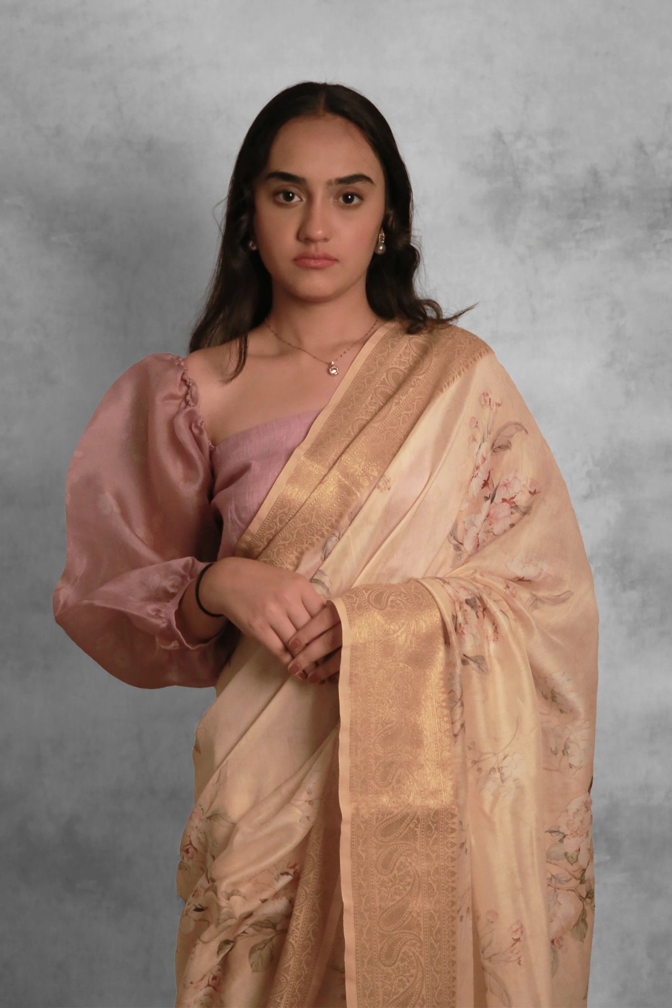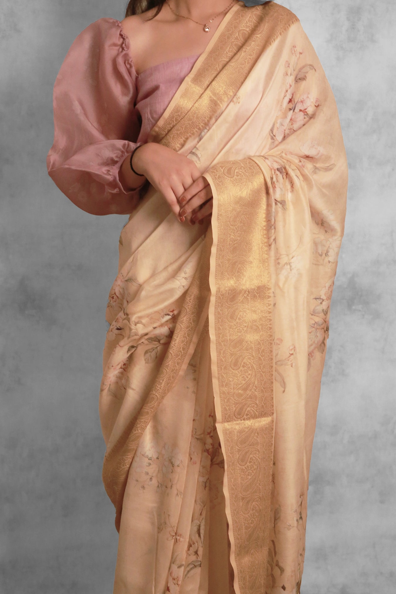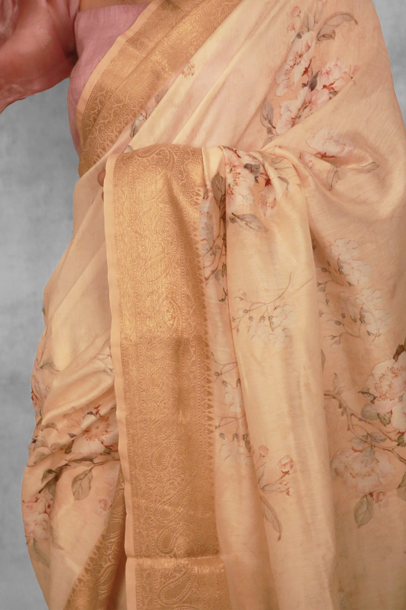 Fabric: Chanderi Zari Woven sareeColor: Coral Peach with golden borderPattern and Print: Drape yourself in the sheer elegance of this Coral peach-colored Chanderi saree, a quintessential embodiment of grace. Adorned with a zari border, it exudes sophistication and timeless appeal. The allover saree boasts delicate watercolor flower designs, adding a touch of ethereal beauty to this classic ensemble. Perfect for any occasion.Silk Purity: Pure ChanderiPack Contains: 1 Saree, 1 BlouseCare Instructions: Dry wash                  Â