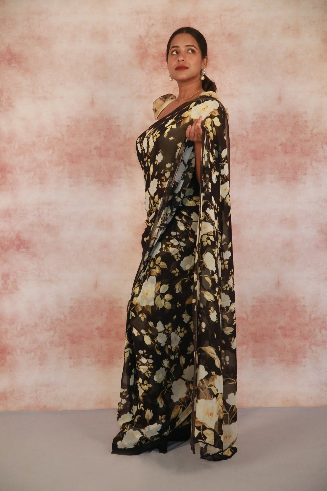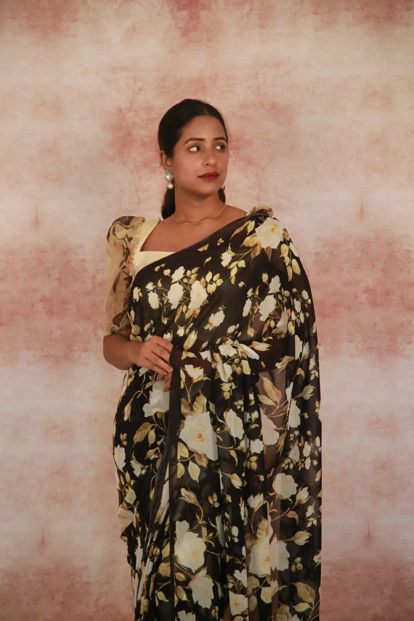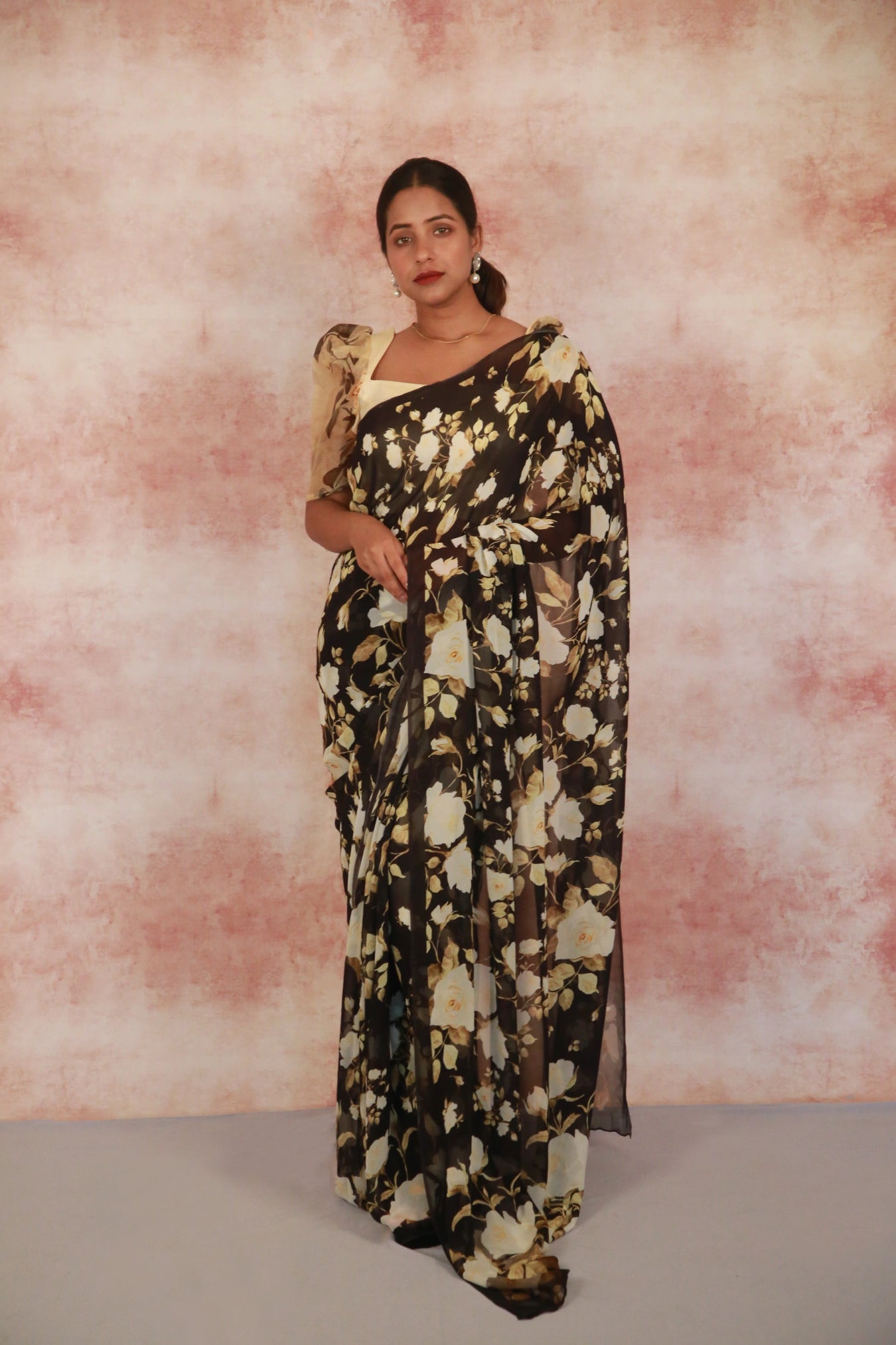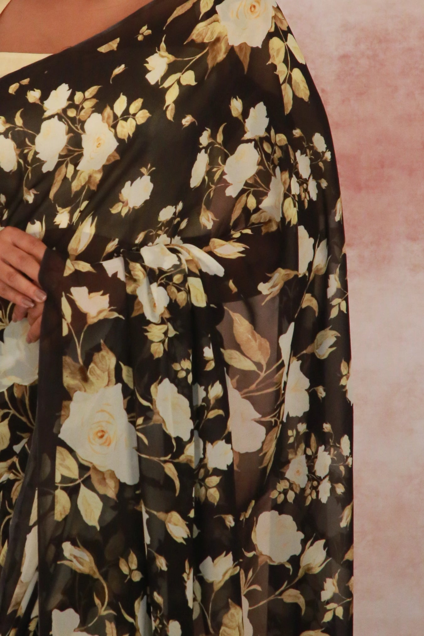 Size:Â S: 5.50Mtr B: 0.80MtrColour: BlackFabric: GeorgetteAttributes:Â Pattern and print: Elevate your elegance with our Black Color Georgette Saree, graced with a delicate print pattern featuring golden rose flower . Crafted from soft and lightweight georgette fabric, this saree drapes effortlessly, enhancing your ensemble with an ethereal touch of beauty.Purity:Pack contains:Â 1 Saree, 1 BlouseCare instructions: Cold hand wash