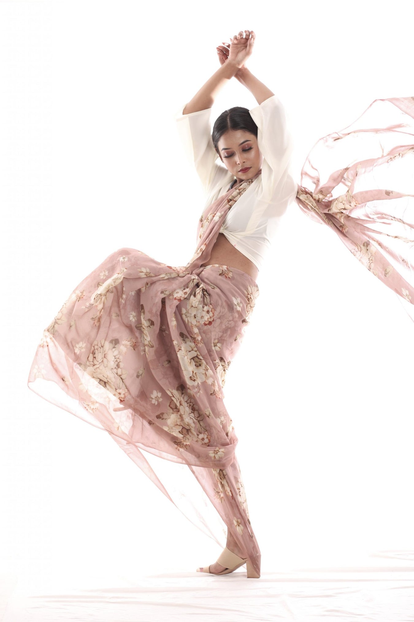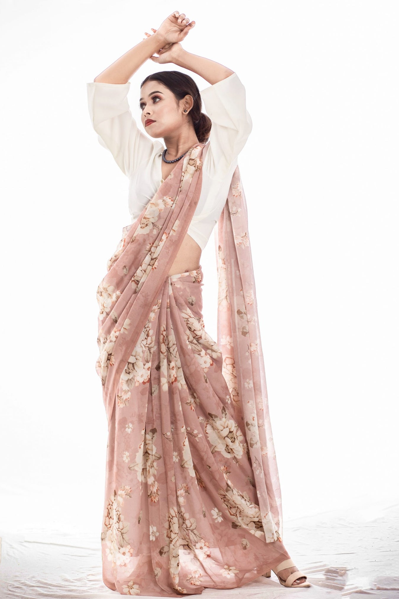 Size:Â S: 5.50Mtr B: 0.80MtrColour: brownFabric: GeorgettePattern and print: Subtle blooms printed on pale brown Georgette saree. The saree is soft, flowing and accentuates the feminine figure with the subtle earthy colors and prints makes it a everyday favorite.