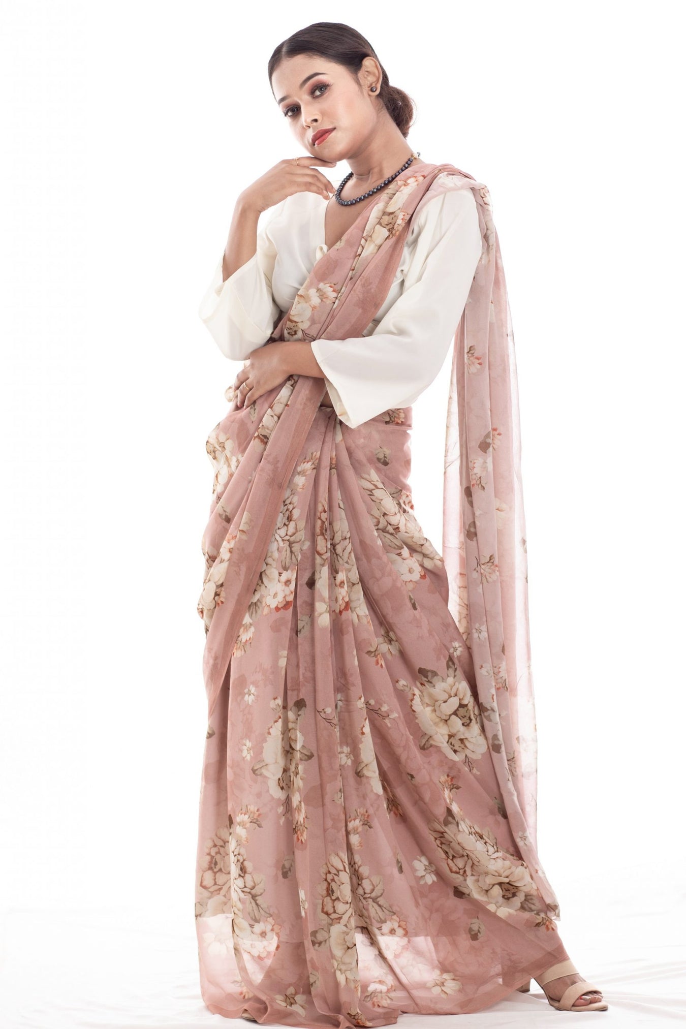 Feel feminine with this pale brown georgette saree. Donning a beautiful color with flowers that accentuate its look and the georgette fabric makes it super light to wear for everyday use.