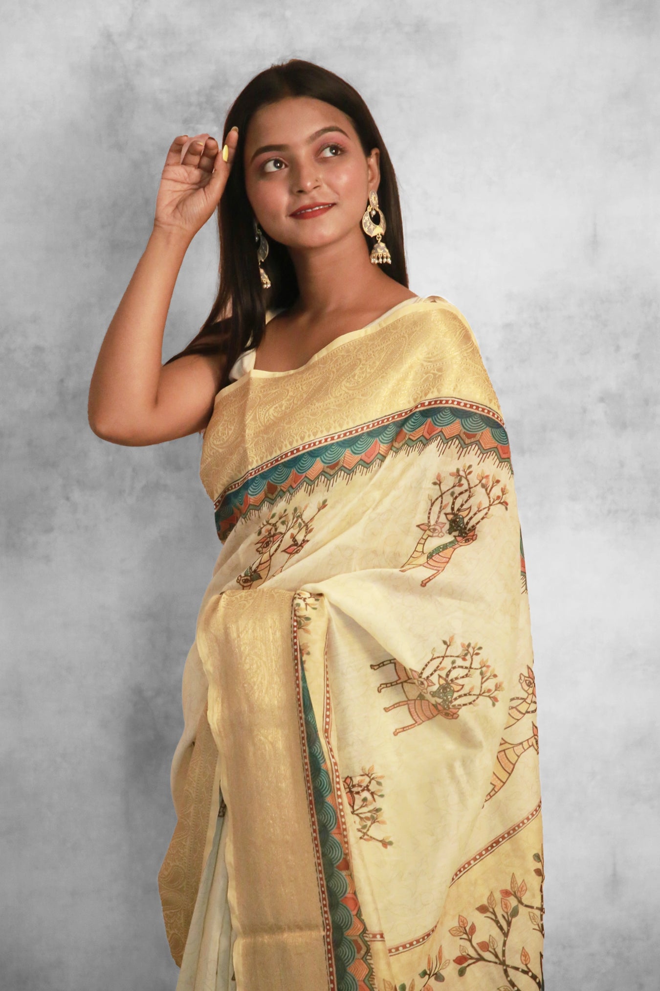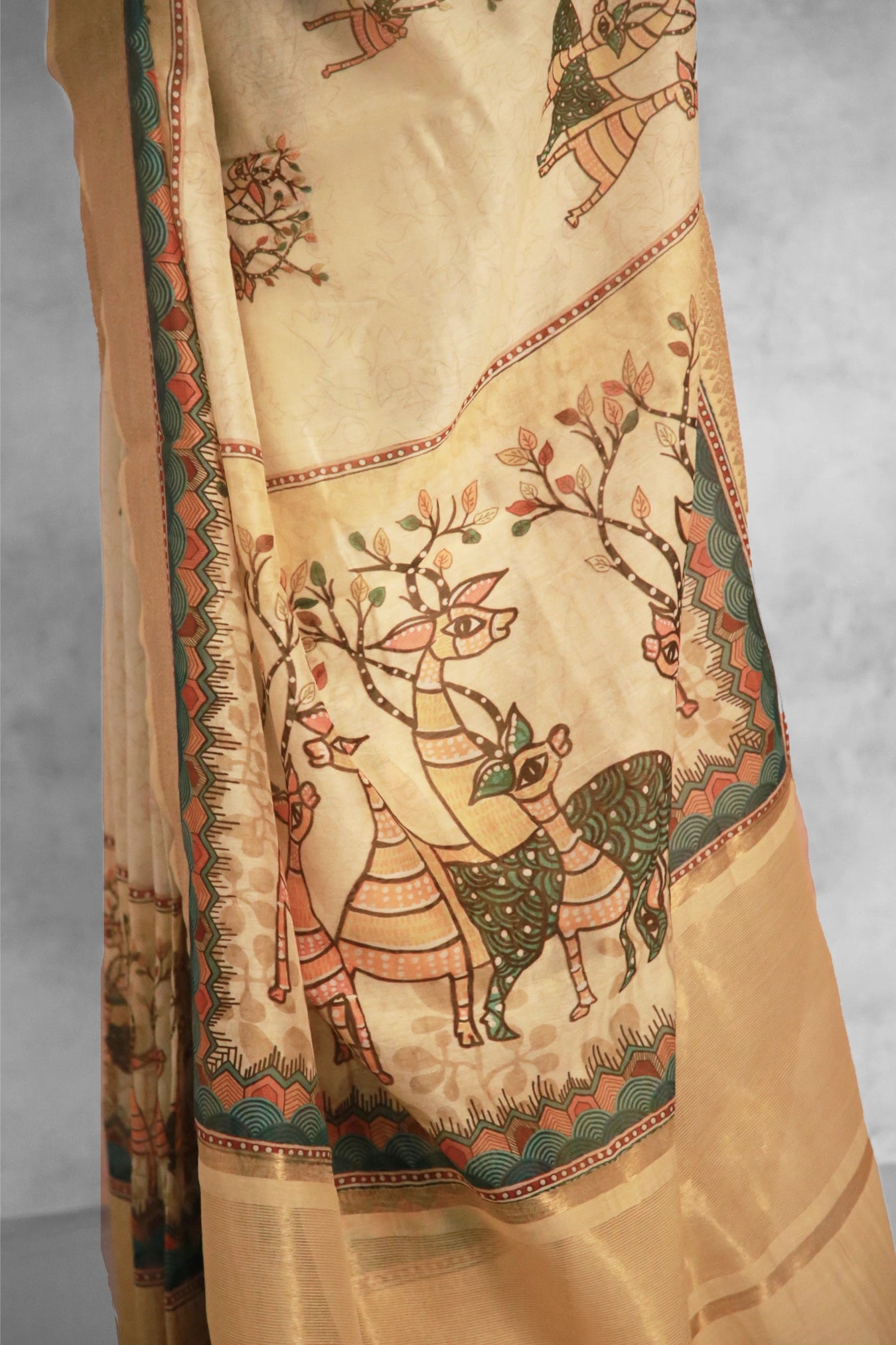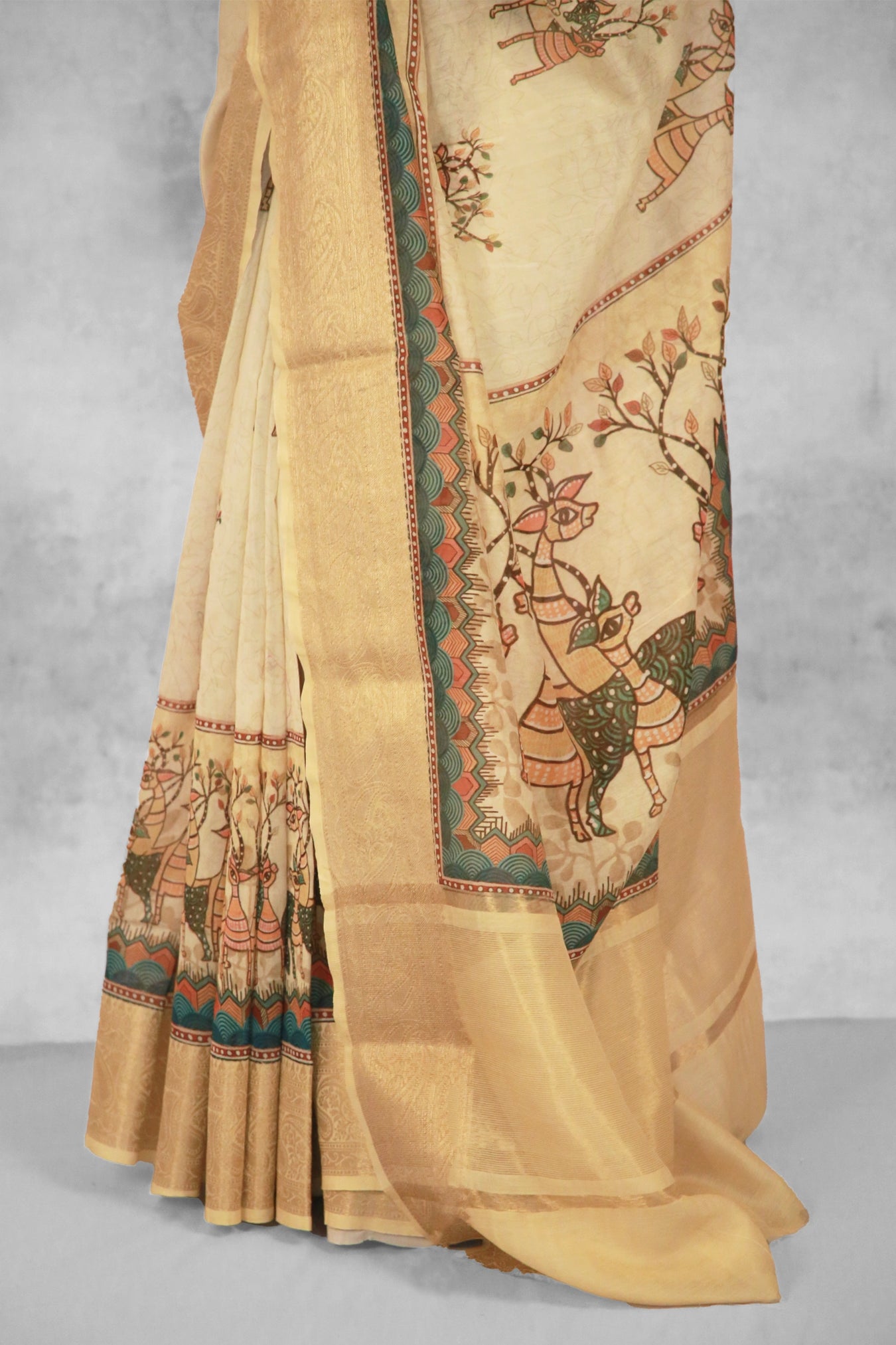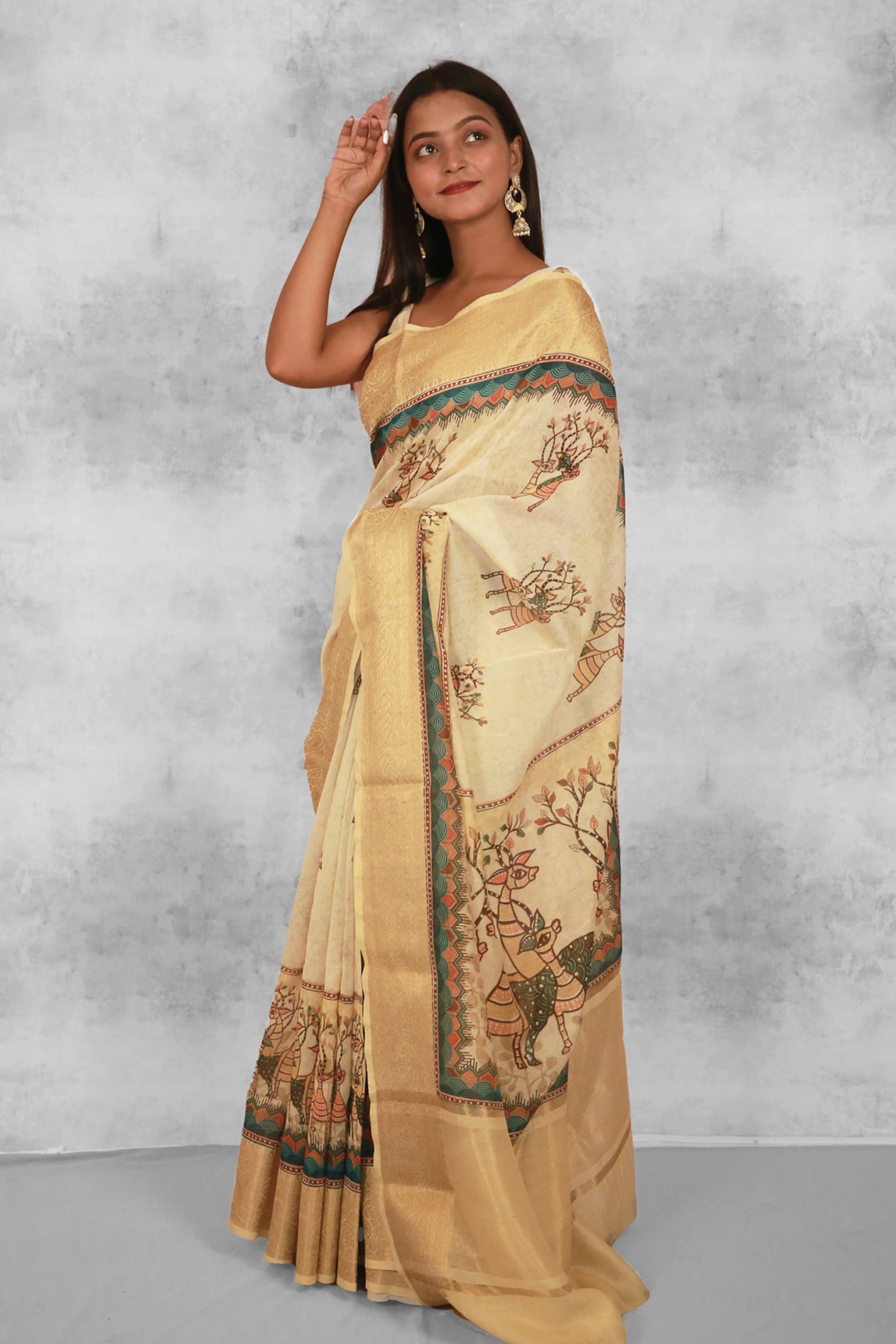Fabric: Chanderi Zari Woven sareeColor: Mustard yellowPattern and Print: Elevate your elegance with the enchanting Chanderi Silk Saree. Adorned with a captivating Foliage pattern against an Mustard yellow backdrop, it exudes a dreamy allure that accentuates feminine grace. Enhanced with a delicate zari strip border and inspired by the intricate strokes of Gond art painting, this saree emanates a timeless charm. Its natural sheen adds a luminous touch, creating an aura of mesmerizing beauty. Wear it with poise and panache, and let its true splendor unfold."Silk Purity: Pure ChanderiPack Contains: 1 Saree, 1 BlouseCare Instructions: Dry wash                  Â