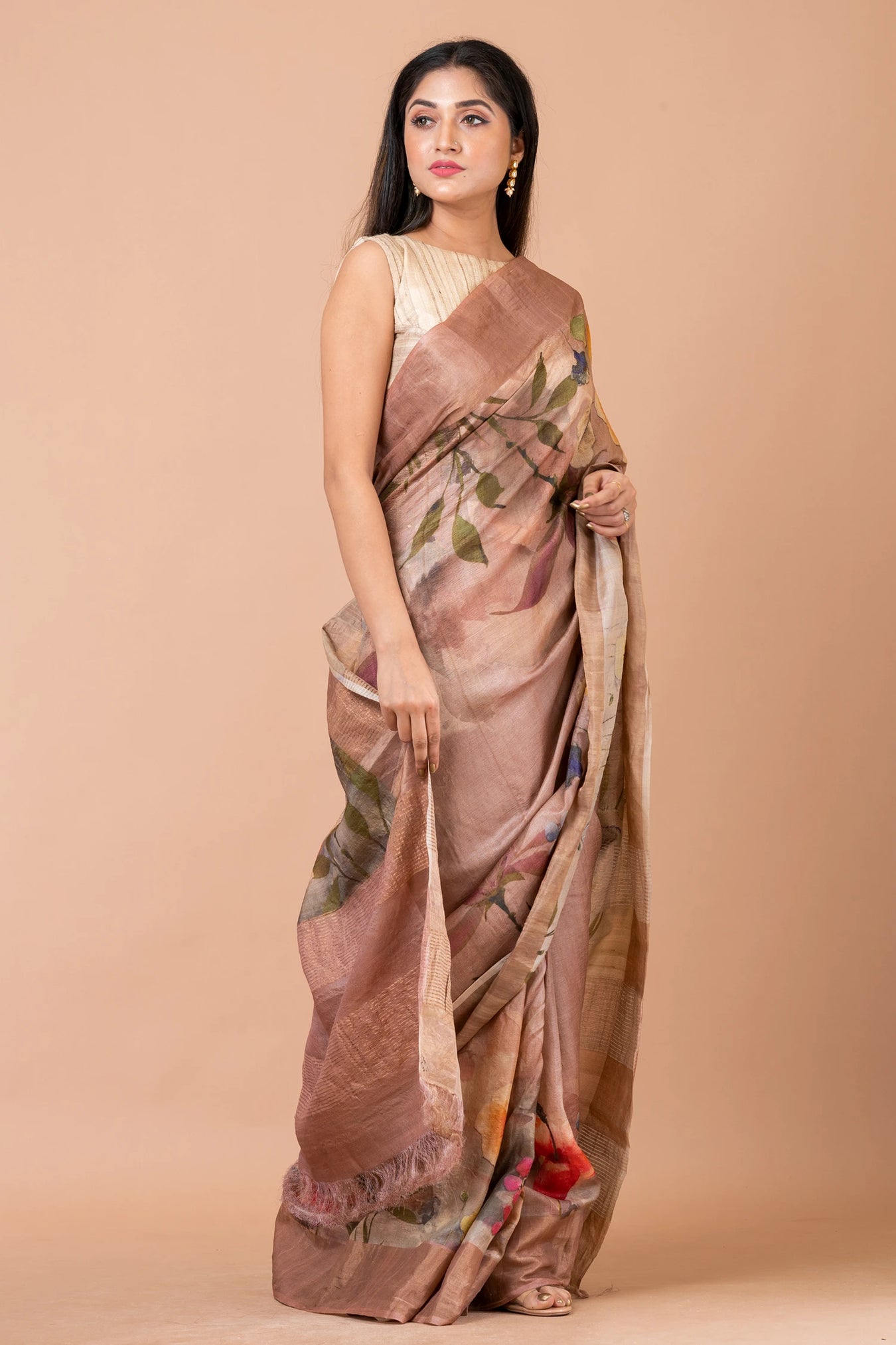 Size: S: 5.50Mtr B: 0.80MtrColour: BeigeFabric: Tussar silkPattern and print: Indulge in timeless elegance with this exquisite beige tussar silk saree featuring a delicate zari border. Adorned with an enchanting watercolor flower digital print, this saree effortlessly merges traditional charm with modern sophistication, making it a captivating choice for any special occasion.Silk purity: Pure Tussar SilkPack contains: 1 Saree, 1 BlouseCare instructions: Dry wash