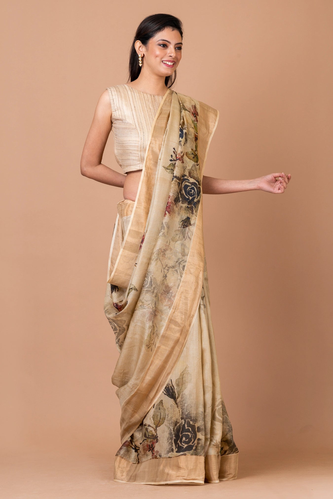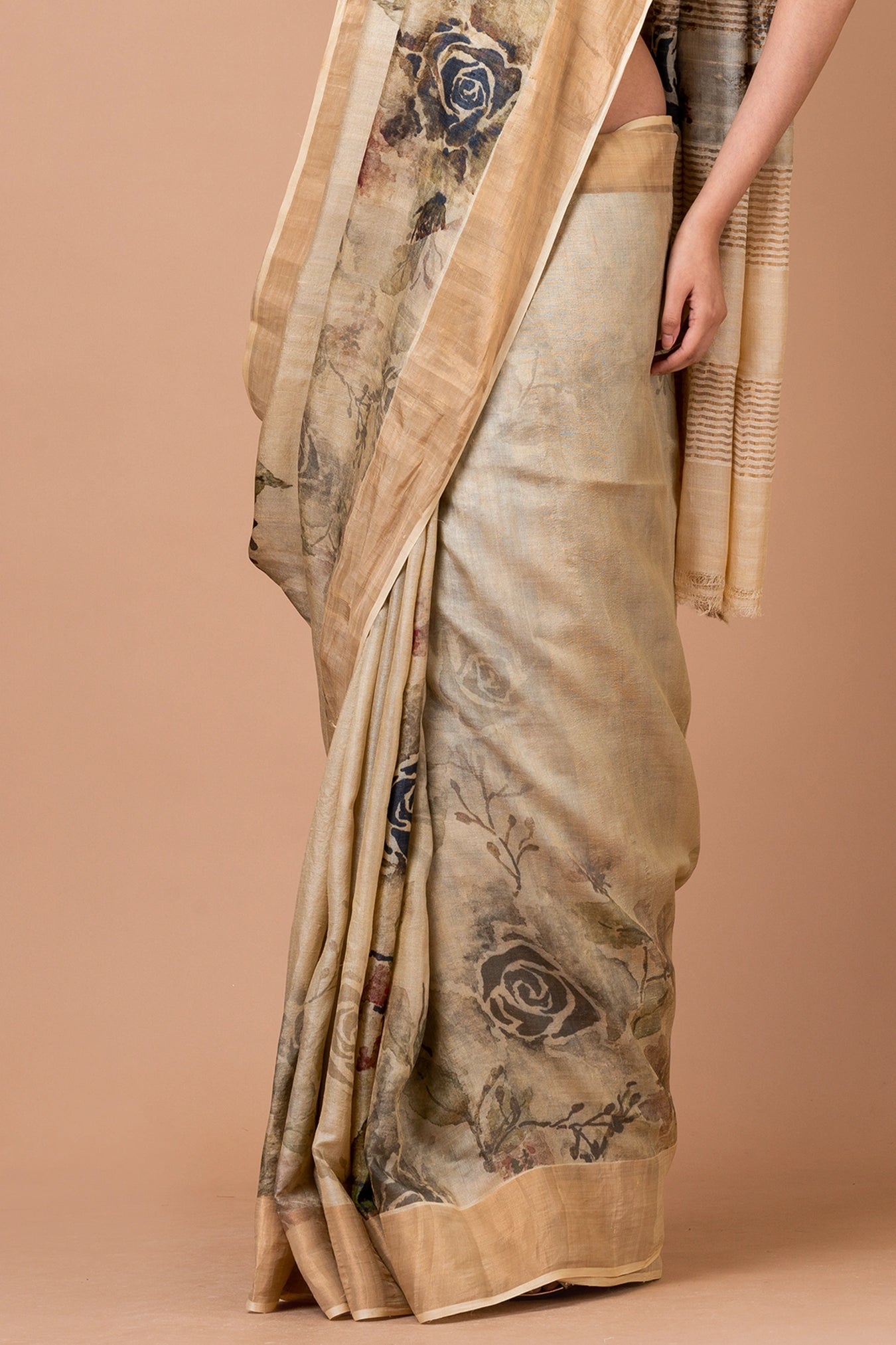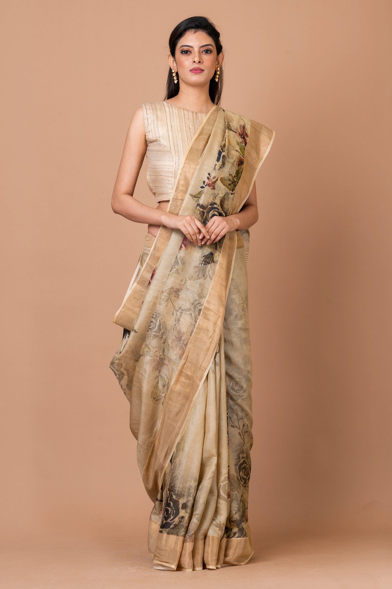 Size: S: 5.50Mtr B: 0.80MtrColour: BeigeFabric: Tussar silkPattern and print: Elegant beige Tassar saree with traditional floral prints. Timeless beauty with a touch of sophistication.Silk purity: Pure Tasar SilkPack contains: 1 Saree, 1 BlouseCare instructions: Dry wash