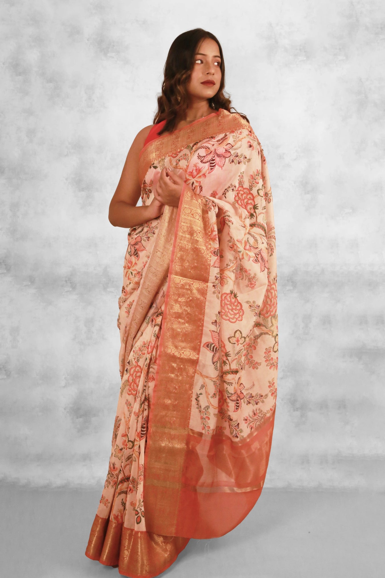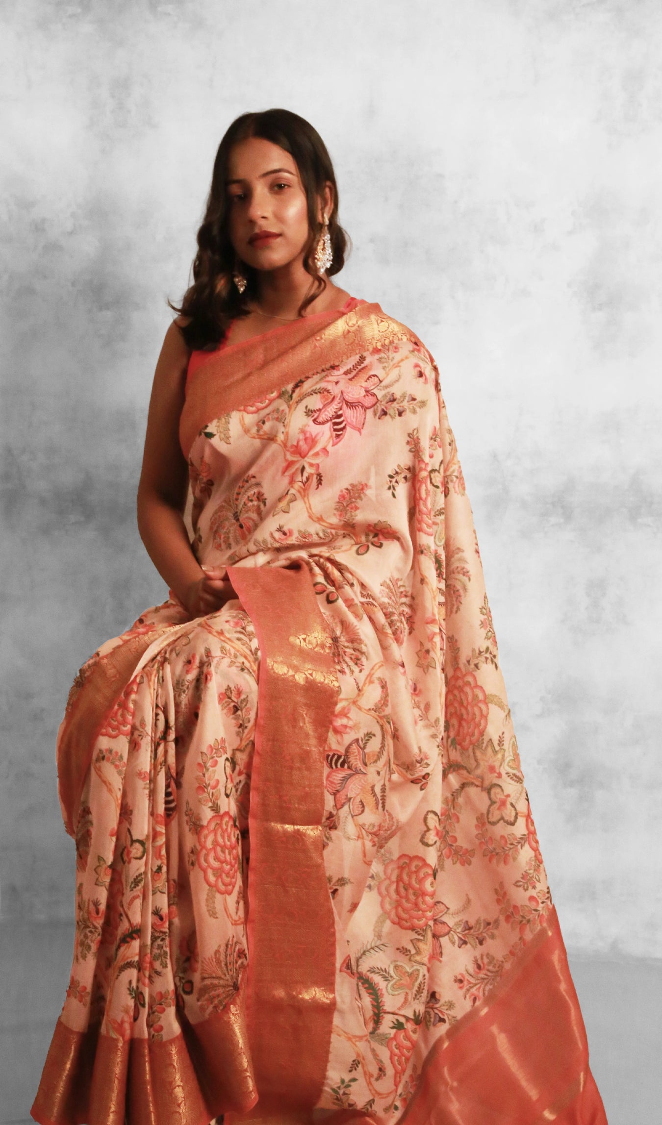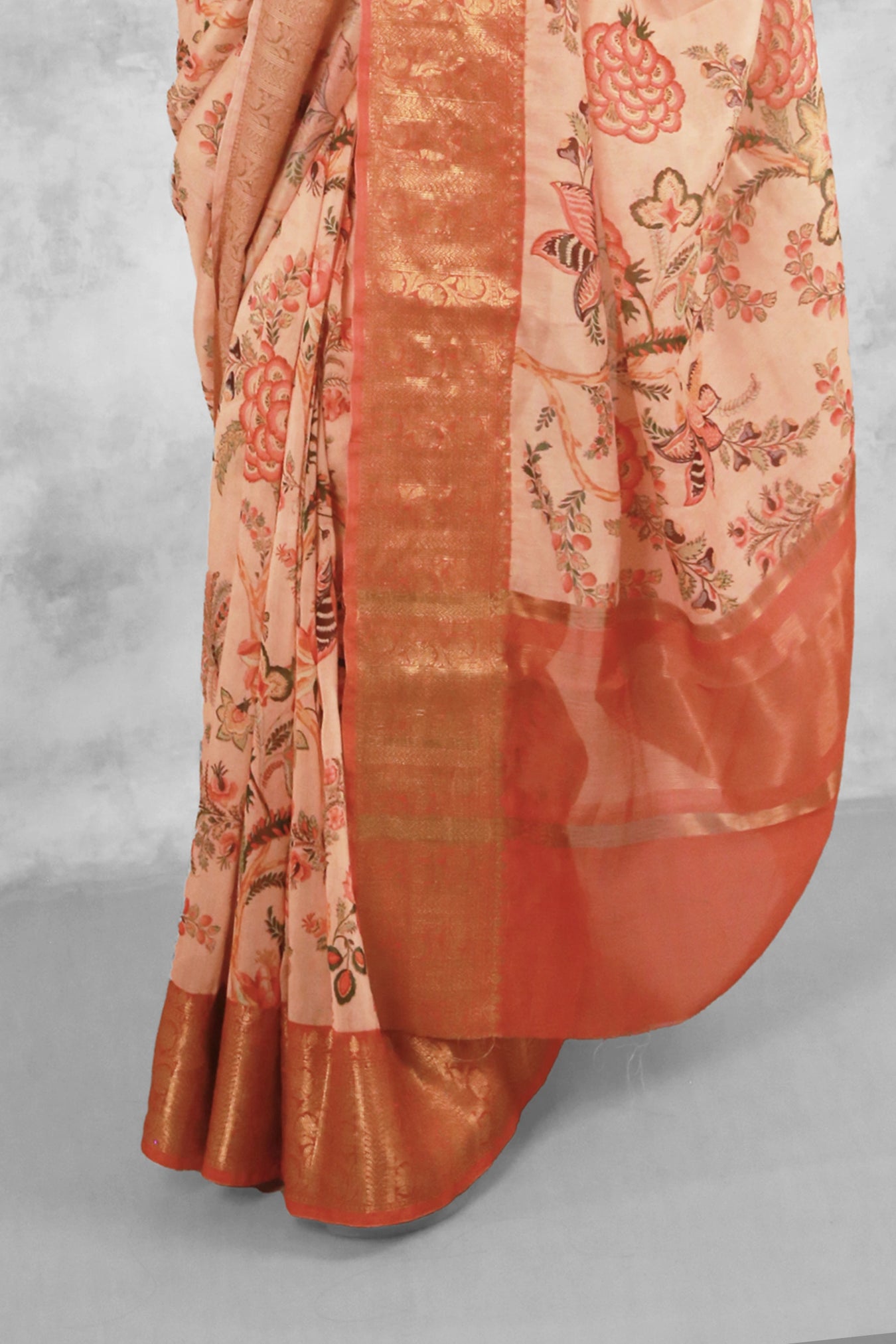 Step into a world of floral majesty with our Chanderi Zari Woven saree in a lovely light peach pink hue. Adorned with a captivating digital floral print and complemented by an orange border with woven golden details