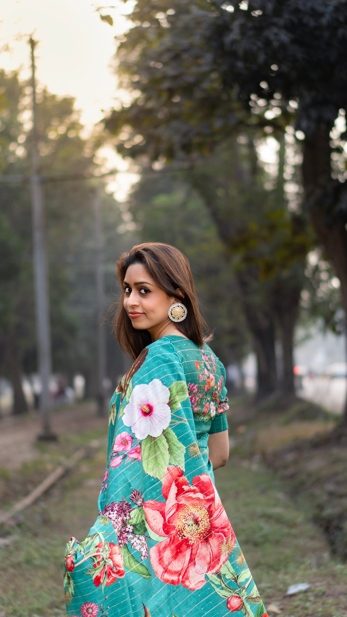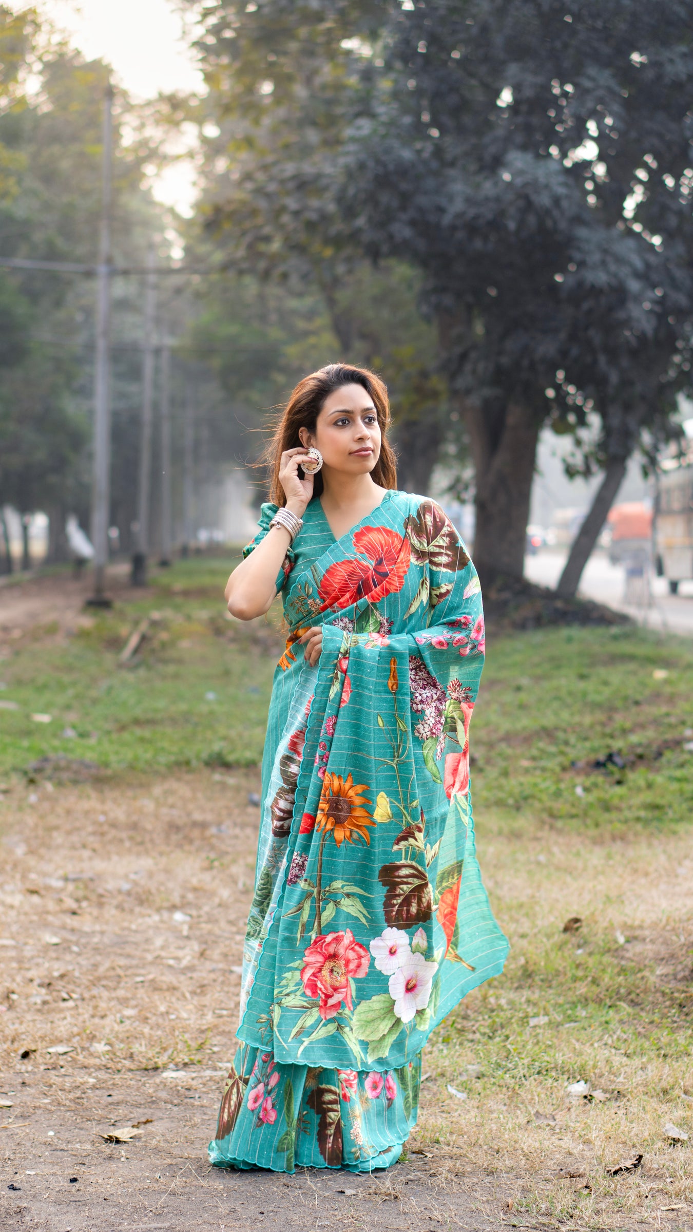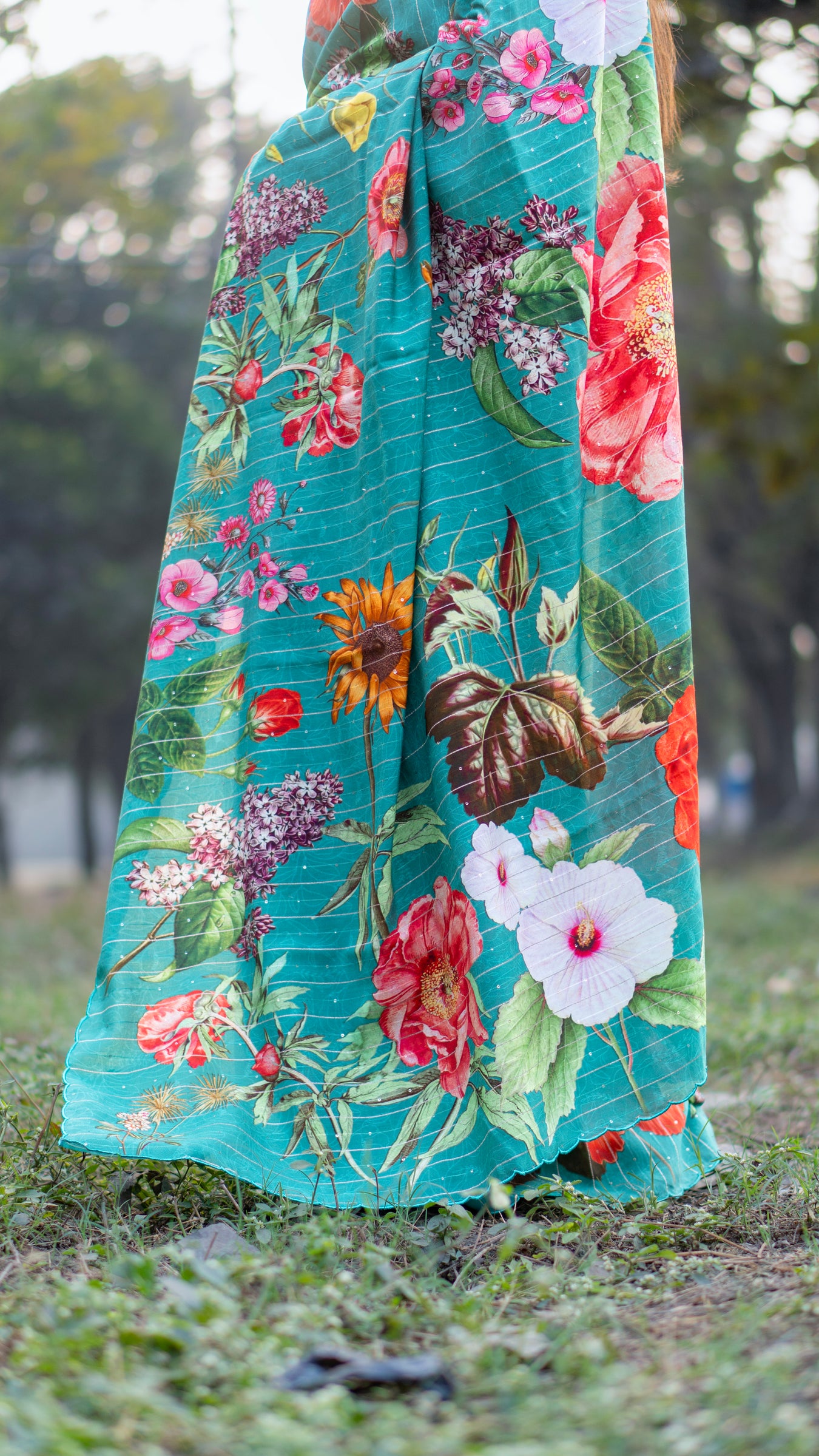 Size: S: 5.50Mtr B: 0.80MtrColour: GreenFabric: Woven Sequence CrepePattern and print: Embrace the untamed beauty of our wild floral print saree, adorned with mesmerizing woven sequins. The bold and dynamic floral patterns exude a sense of freedom and liveliness, while the woven sequins add a touch of dazzling allure. Step into the spirit of nature and style with this captivating ensemble, perfect for making a statement and celebrating your unique individuality.Purity: Natural fabricCare instructions: Dry wash
