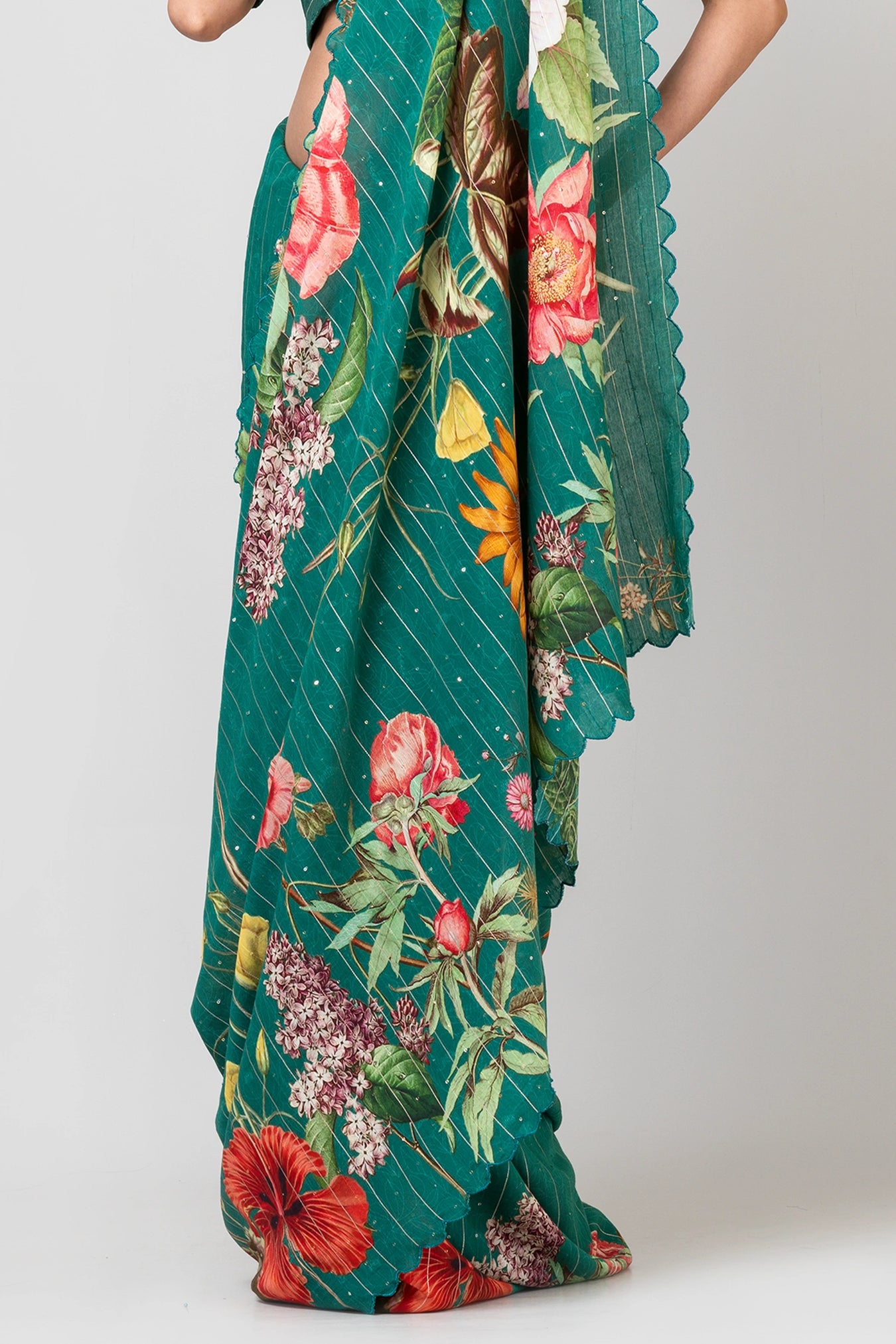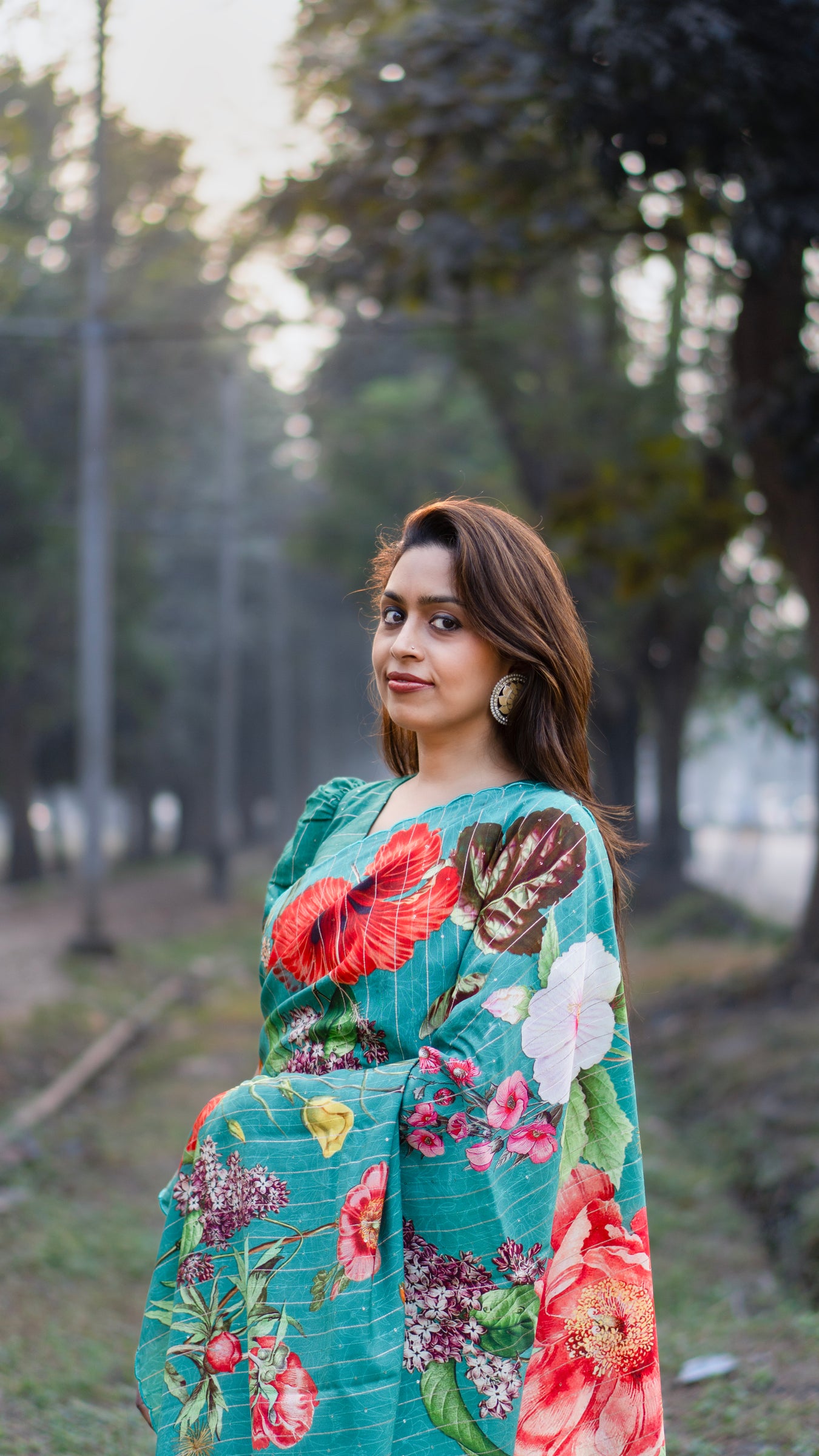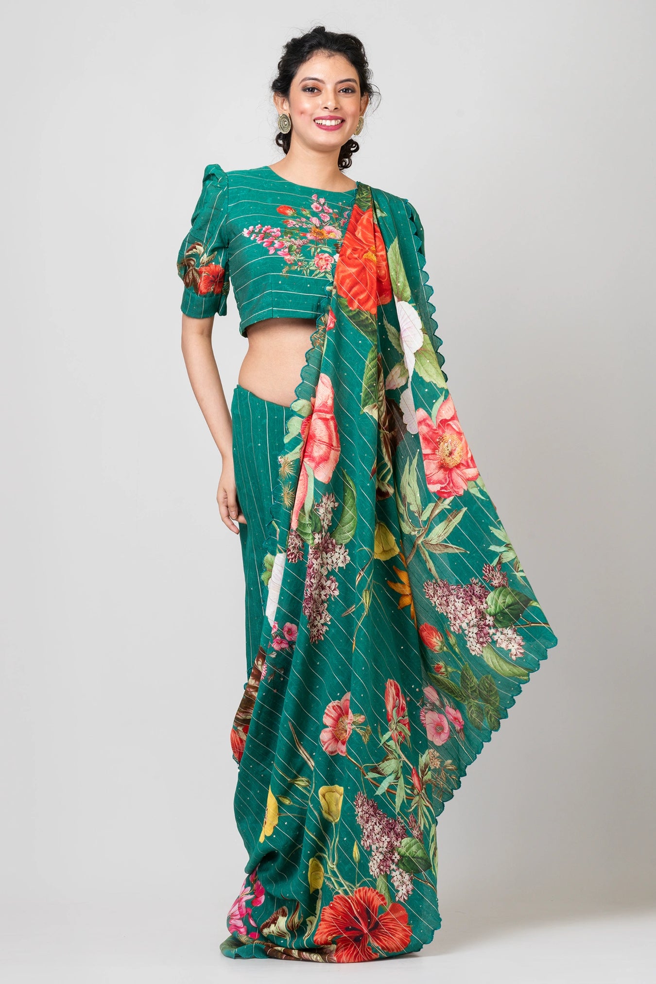 Size: S: 5.50Mtr B: 0.80MtrColour: GreenFabric: Woven Sequence CrepePattern and print: Embrace the untamed beauty of our wild floral print saree, adorned with mesmerizing woven sequins. The bold and dynamic floral patterns exude a sense of freedom and liveliness, while the woven sequins add a touch of dazzling allure. Step into the spirit of nature and style with this captivating ensemble, perfect for making a statement and celebrating your unique individuality.Purity: Natural fabricCare instructions: Dry wash