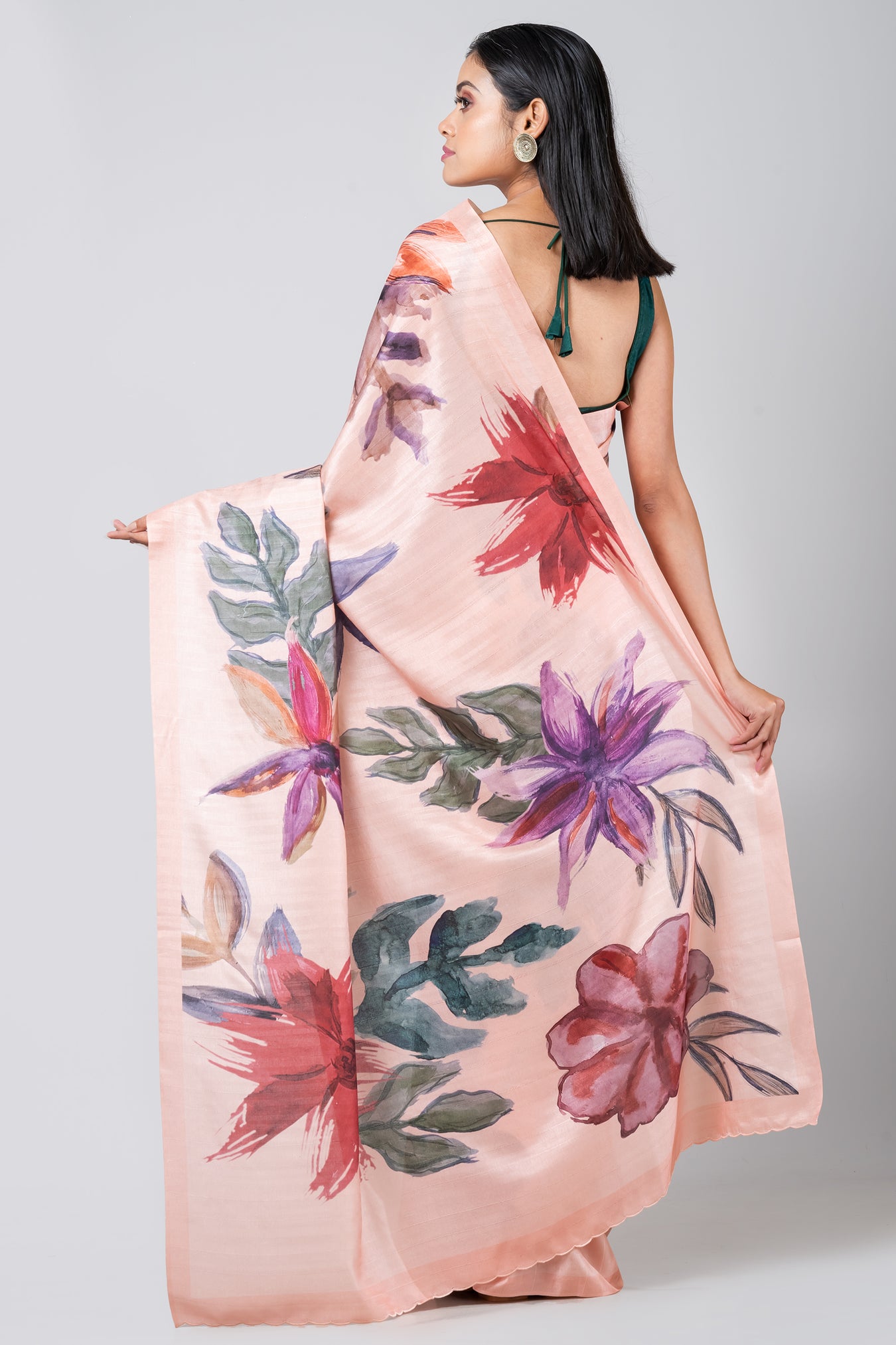 Size: 5.50Mtr B: 0.80MtrColour: BEIGEFabric: SEMI TUSSARPattern and print: The beige saree exudes sophistication with its subtle color. Embellished with a colorful large floral design spread all over, making the saree vibrant and eye-catching.Pack contains: 1 Saree, 1 BlouseCare instructions: Dry wash