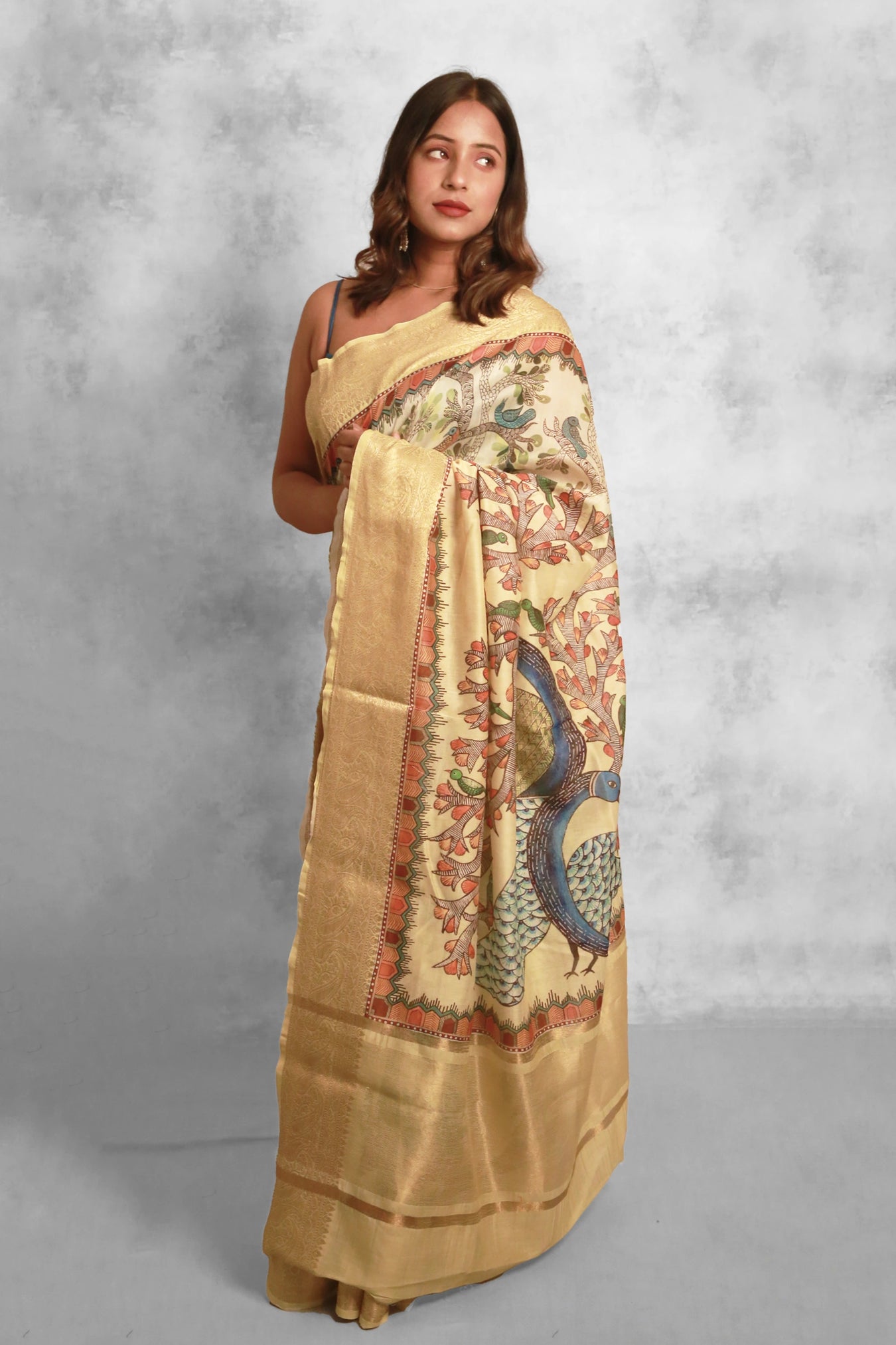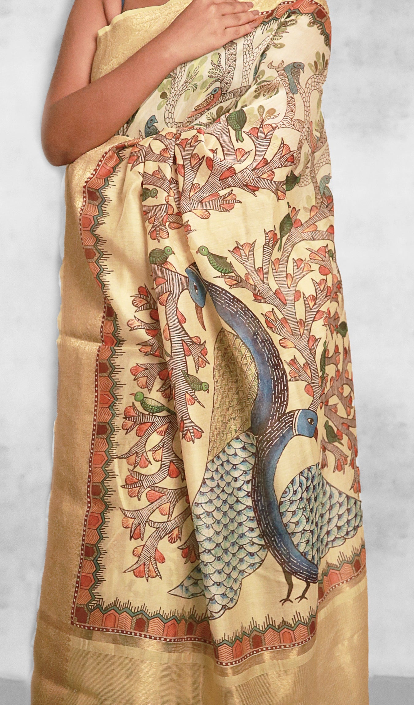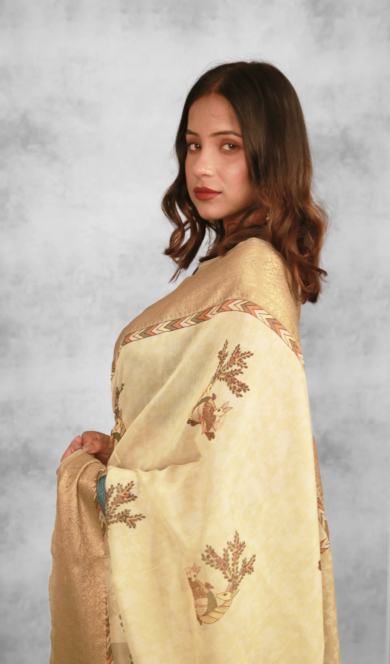 Made from pure Chanderi fabric, this saree features a light yellow base with a captivating golden border. The highlight of this piece is the intricate Gond Art print, which beautifully depicts the wonders of nature.
