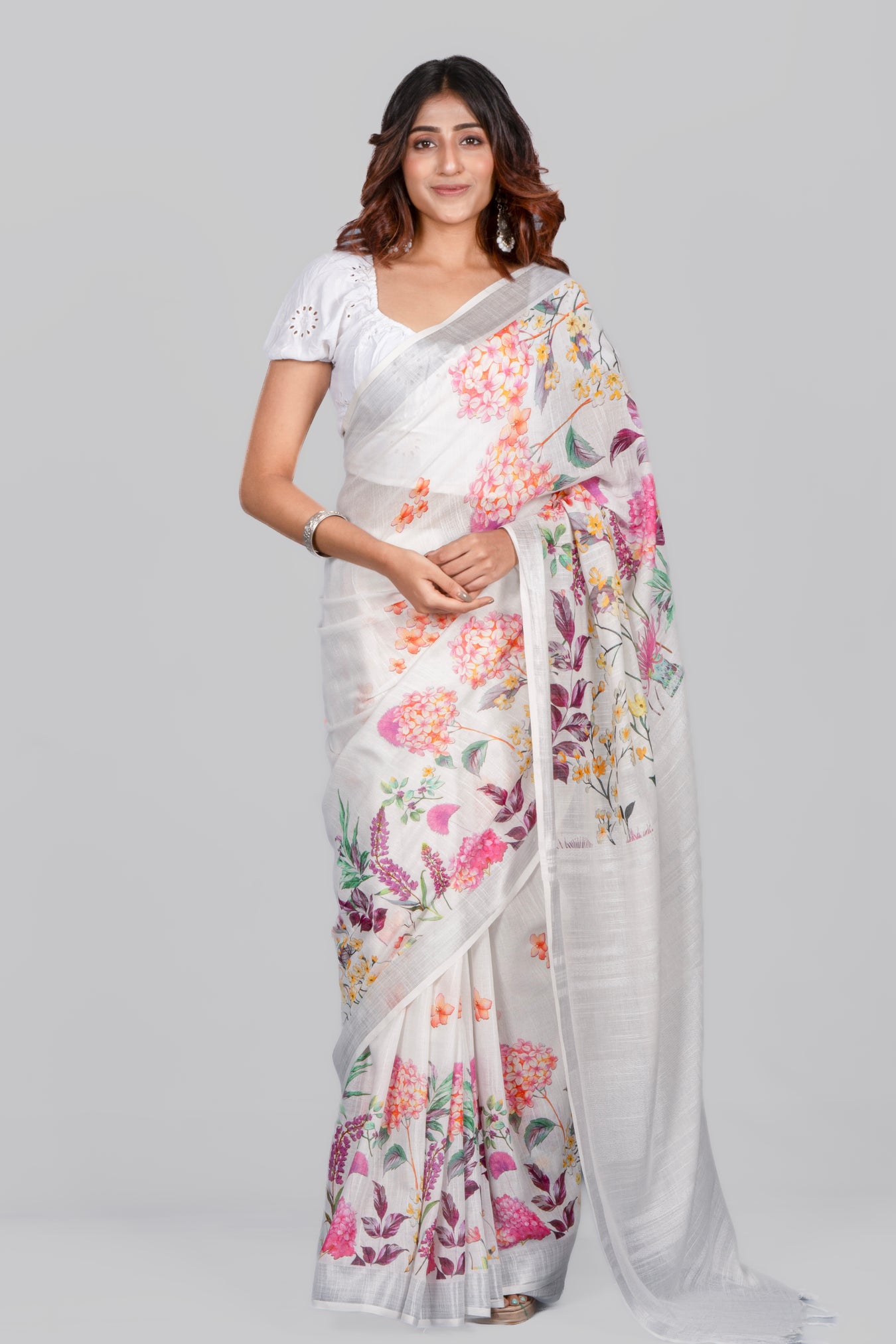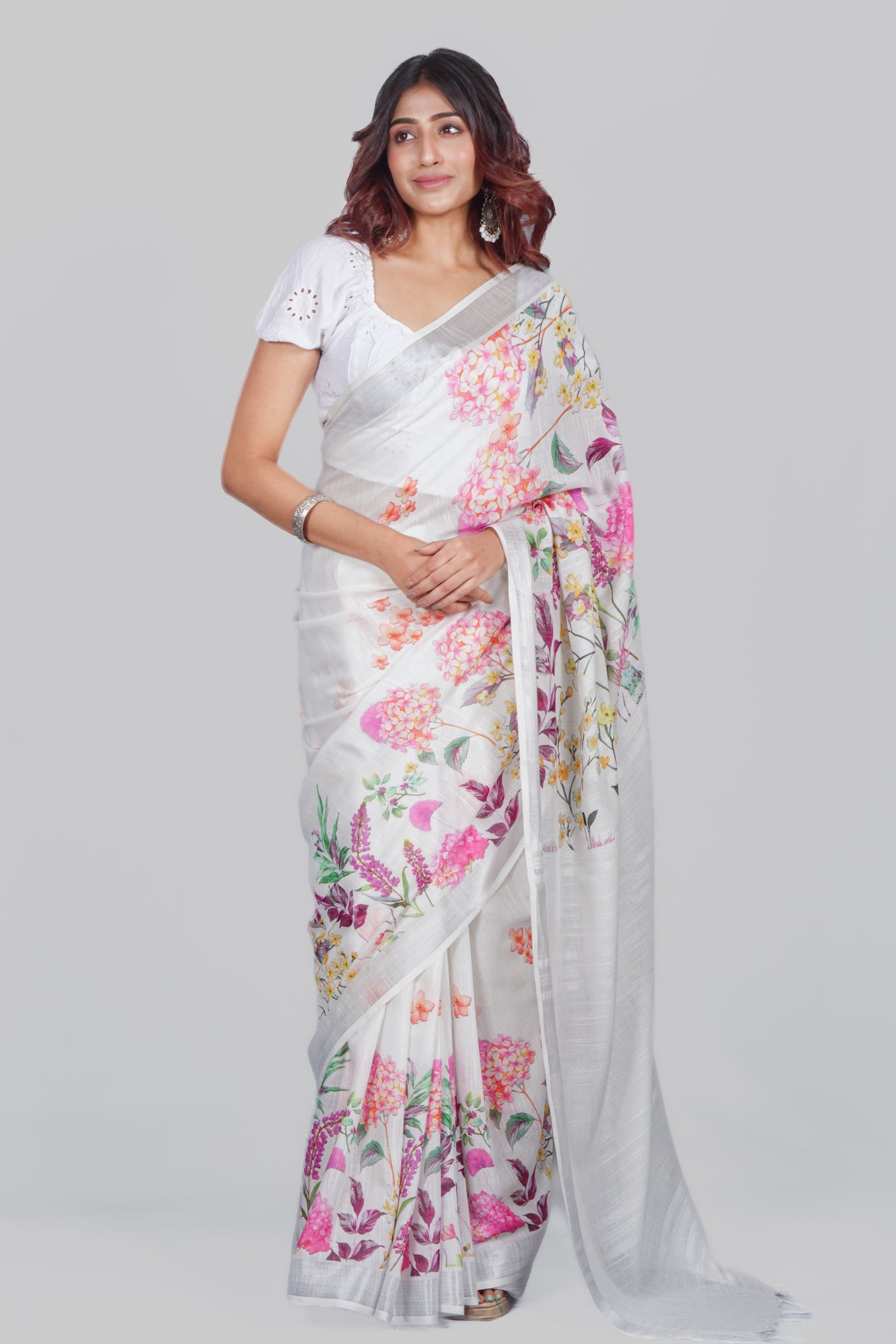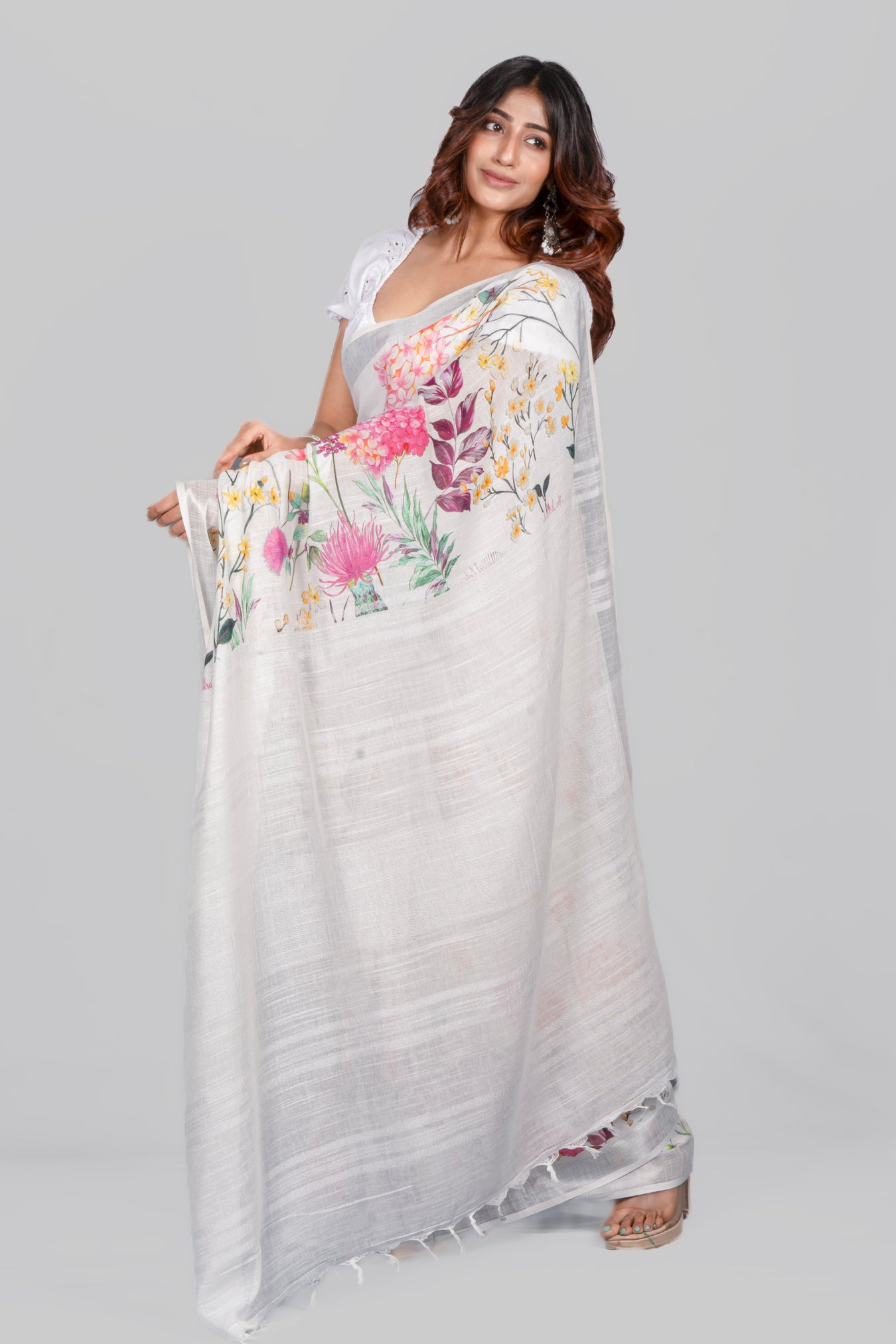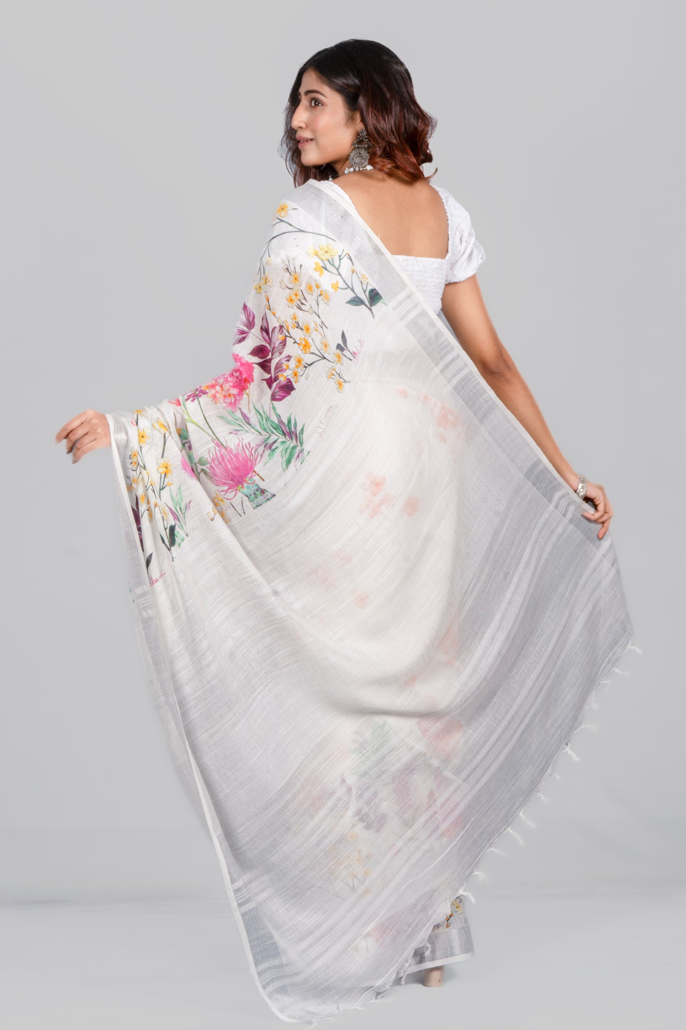Size: 5.50Mtr B: 0.80MtrColor: White Fabric: LINENPattern and print: This light linen saree with a subtle zari border and floral print offers a delightful contrast, blending elegance with a touch of vibrancy. It's a charming choice for those seeking a refreshing yet classic look.Pack contains: 1 Saree, 1 BlouseCare instructions: Dry wash
