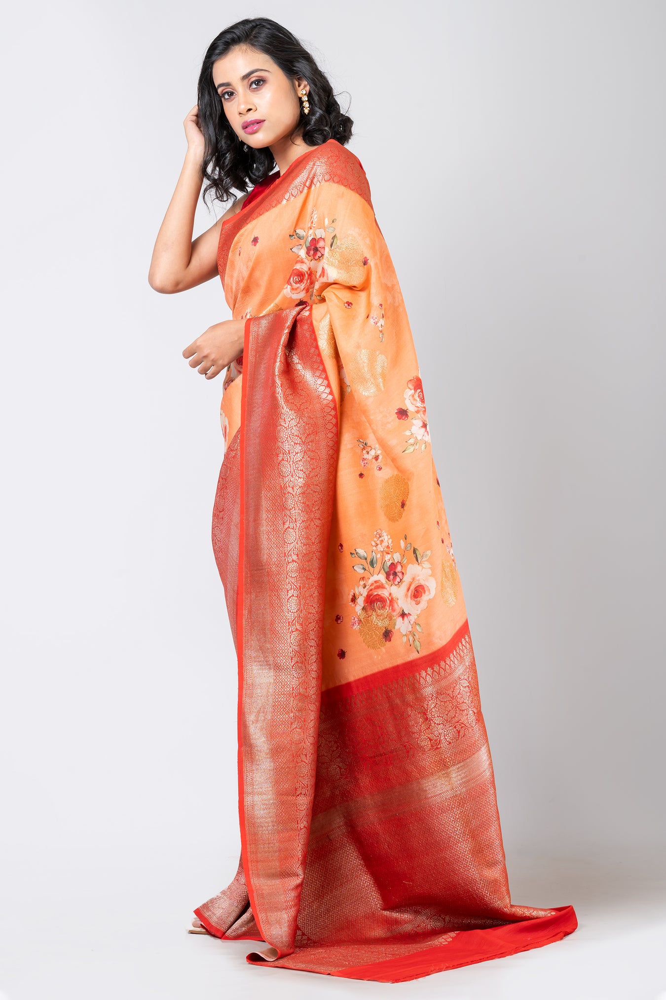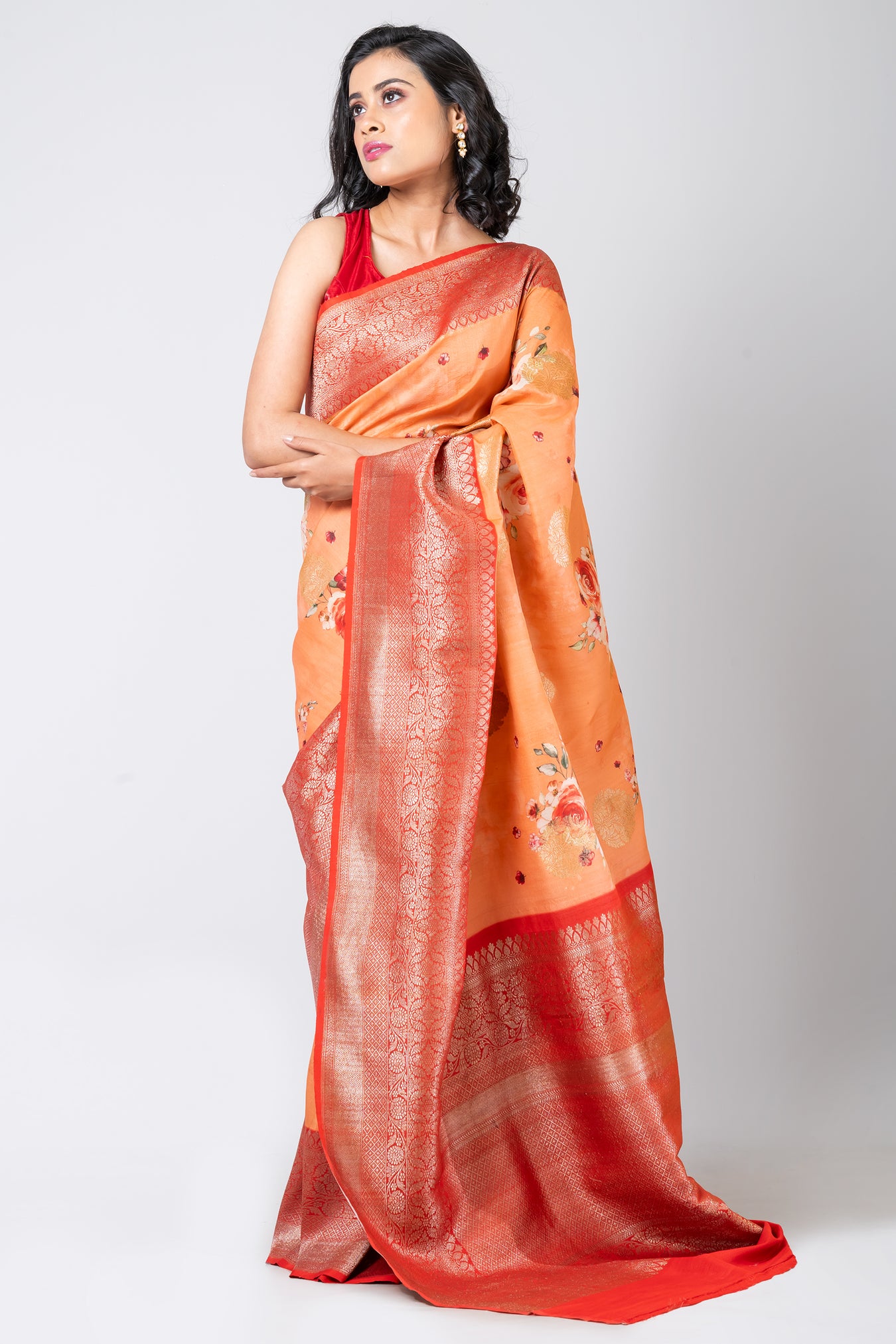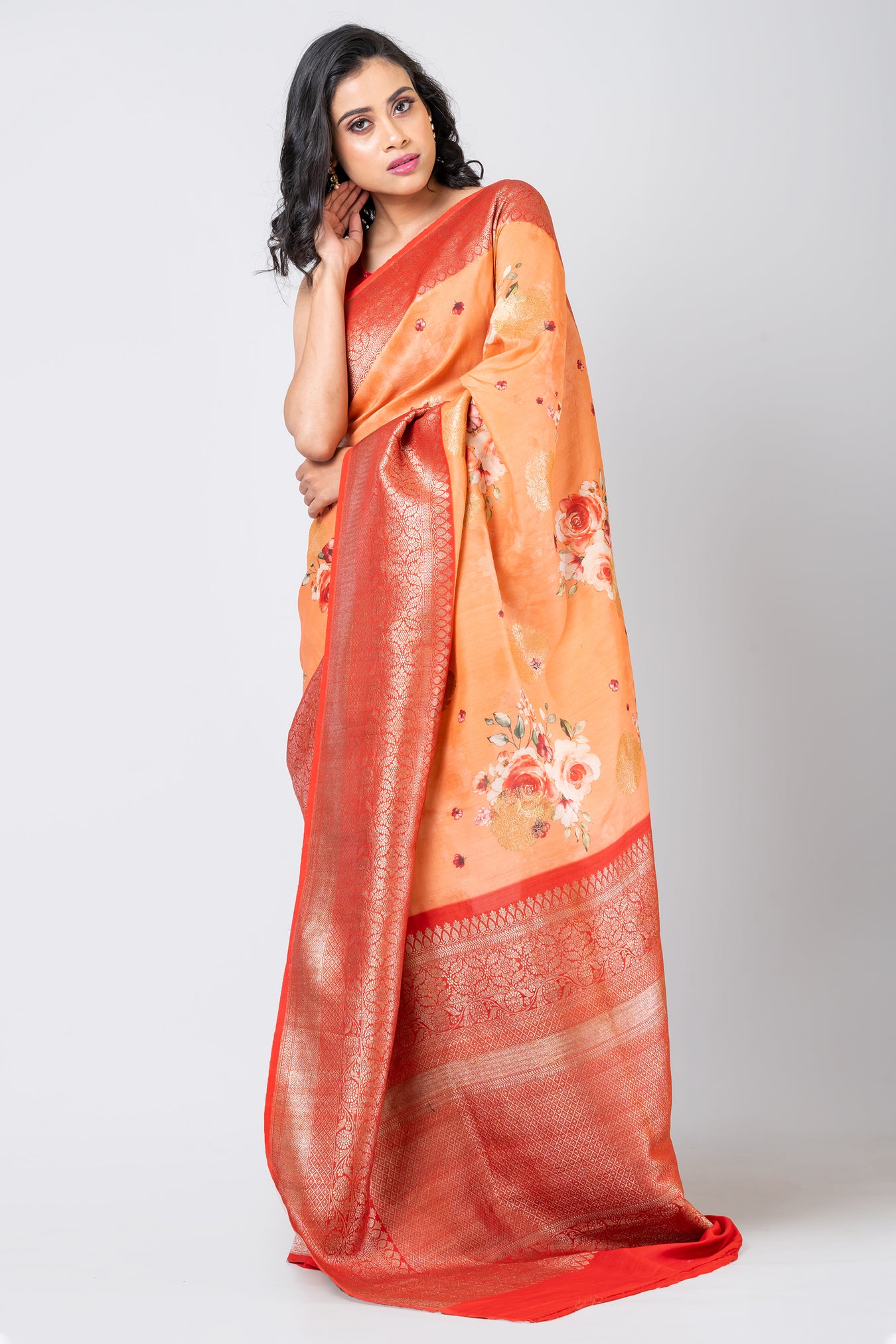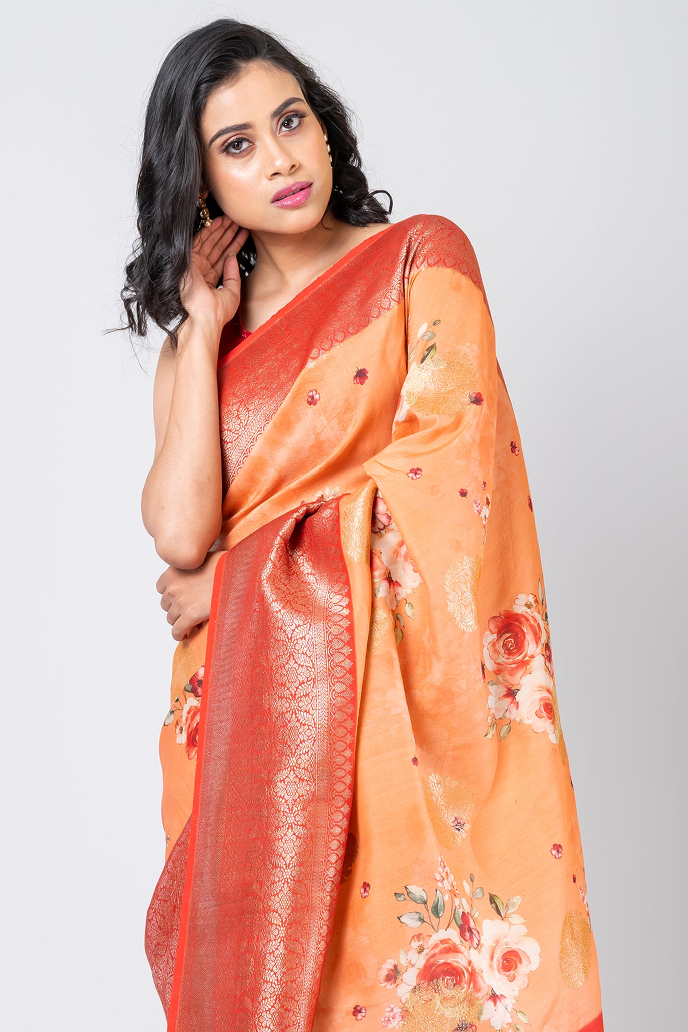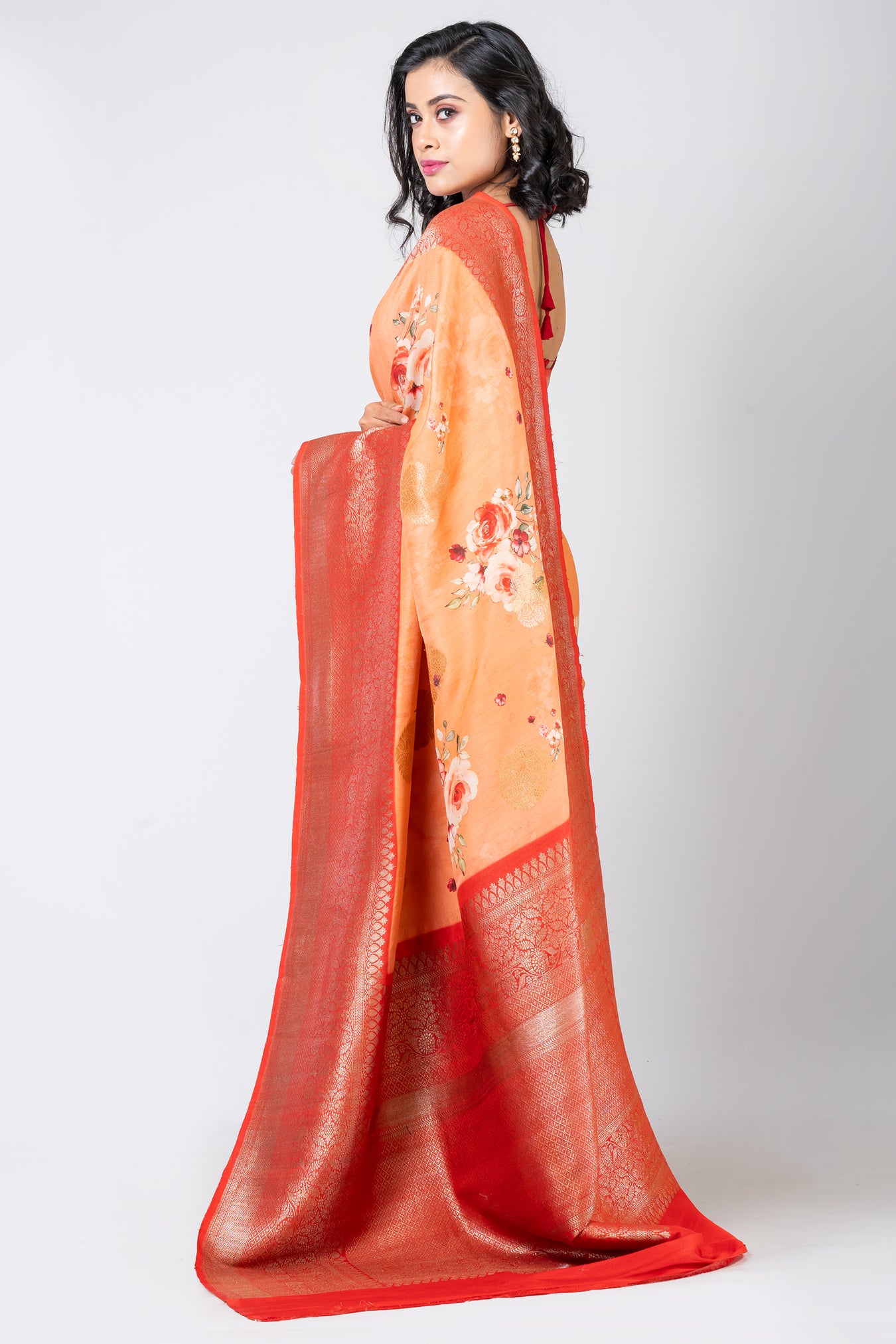 Size: S: 5.50Mtr B: 0.80MtrColour: ORANGEFabric: TUSSAR BENARASIPattern and print: An exquisite saree in vibrant orange, adorned with a striking red border and intricate flower buta design. Perfect for those seeking a fusion of tradition and modernity.Silk purity: Pack contains: 1 Saree, 1 BlouseCare instructions: Dry wash