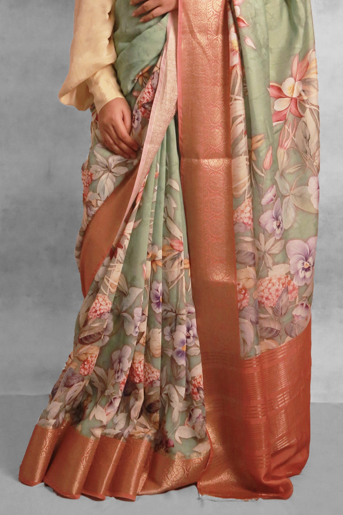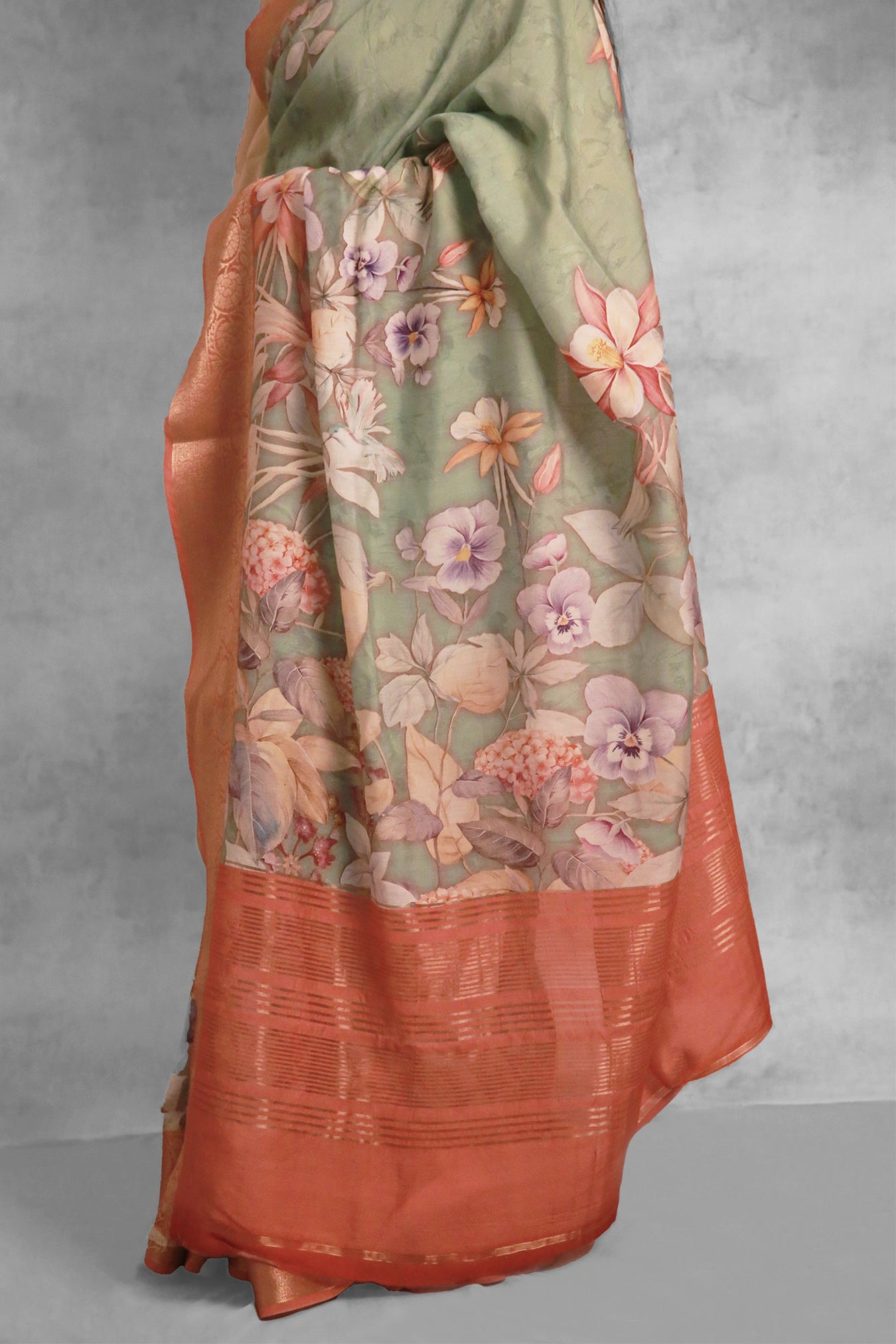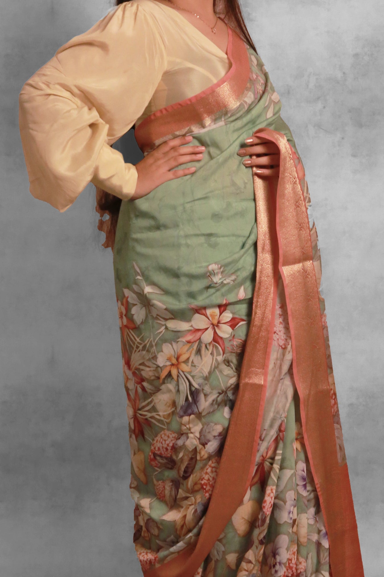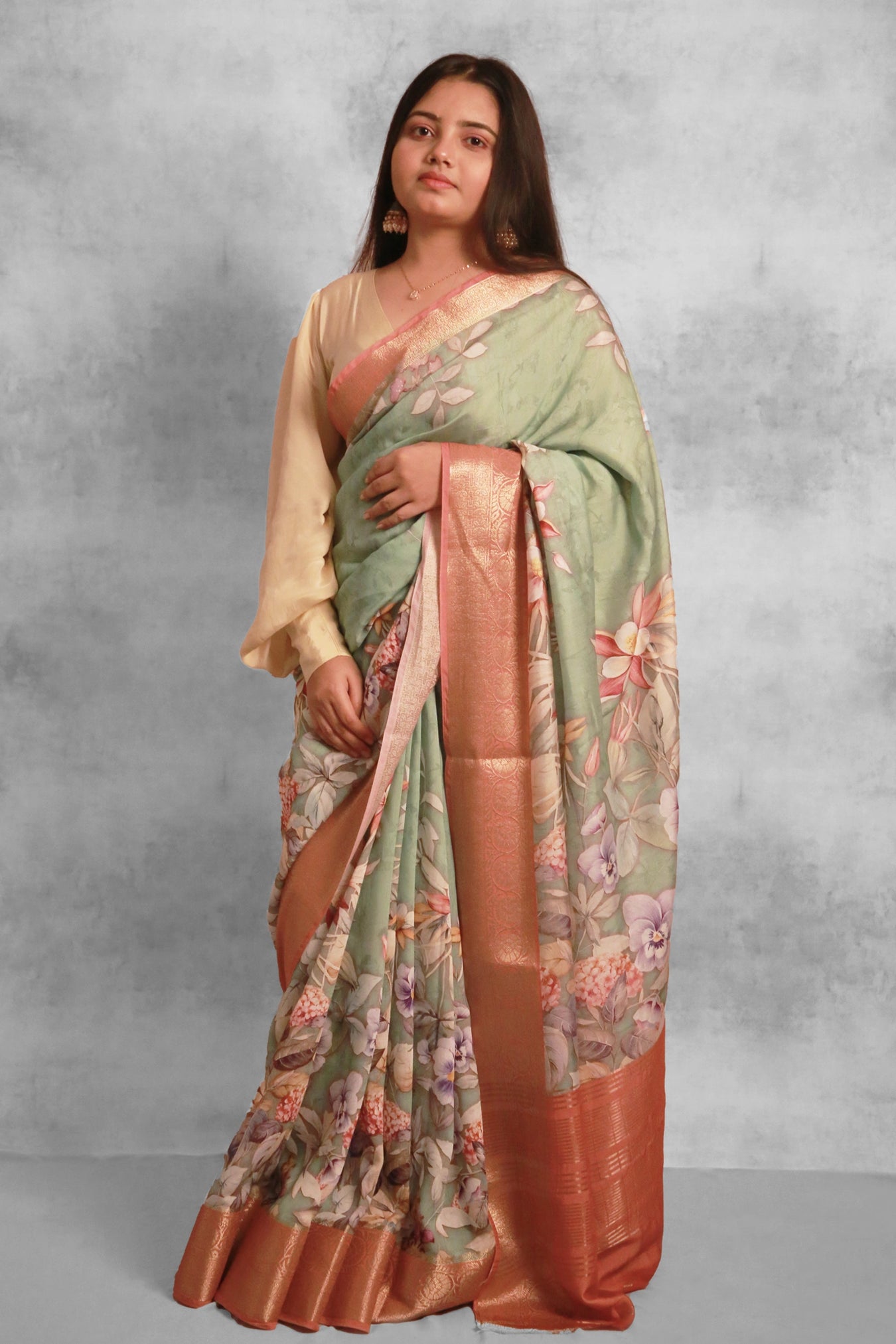 Fabric: Chanderi Zari Woven sareeColor: Pista green and red borderPattern and Print: Drape yourself in the sheer elegance of this Pista green-colored Chanderi saree, a quintessential embodiment of grace. Adorned with a bold red zari border, it exudes sophistication and timeless appeal. The allover saree boasts delicate watercolor flower designs, adding a touch of ethereal beauty to this classic ensemble. Perfect for any occasion.Silk Purity: Pure ChanderiPack Contains: 1 Saree, 1 BlouseCare Instructions: Dry wash                  Â