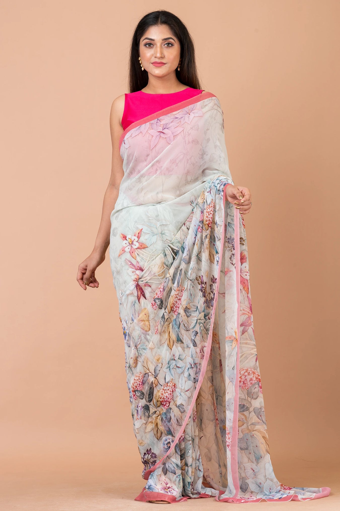 Size: S: 5.50Mtr B: 0.80MtrColour: White and pink borderFabric: GeorgetteAttributes: Highlighting sequence emblishment Pattern and print: Step into a world of vibrant charm with our multicolor wild watercolor flowers saree, where nature's exuberance is beautifully captured in every brushstroke, creating an enchanting and lively ensemble that radiates elegance and joy.Purity: Natural FabricPack contains: 1 Saree, 1 BlouseCare instructions: Dry wash