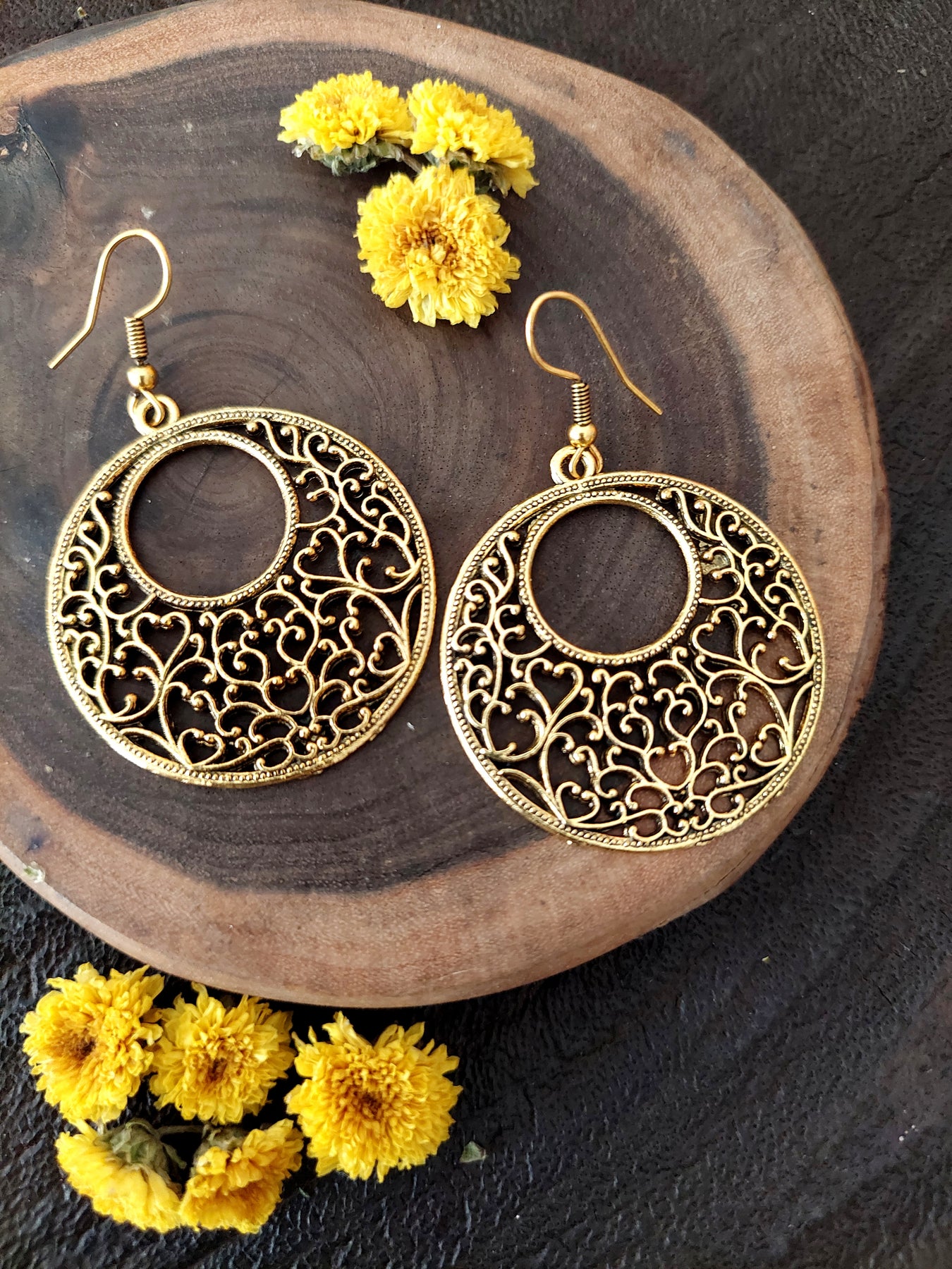 Golden jaal circular earring with a rusted finish. Simple yet fashionable, it may be worn with any traditional outfit to enhance your beauty.