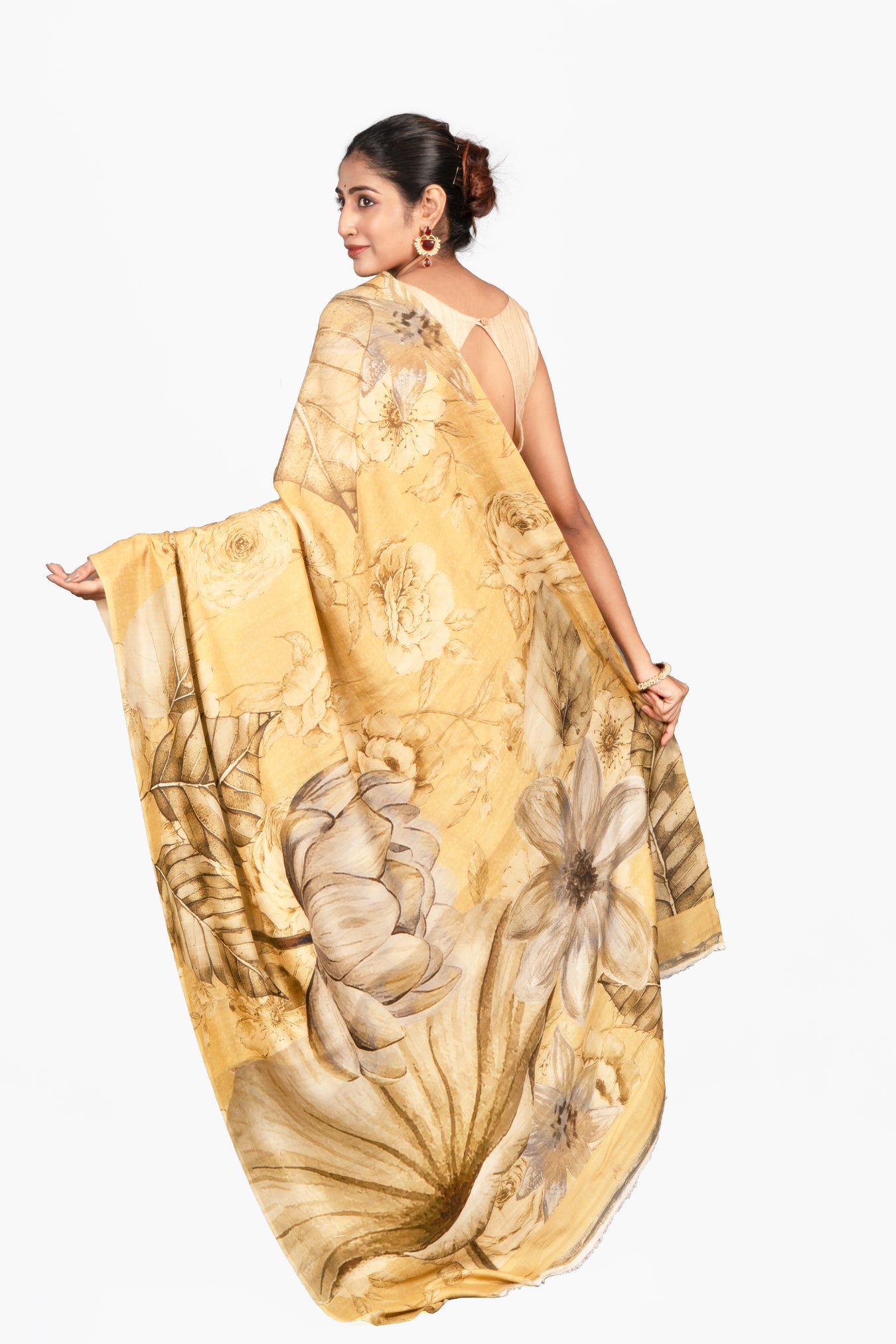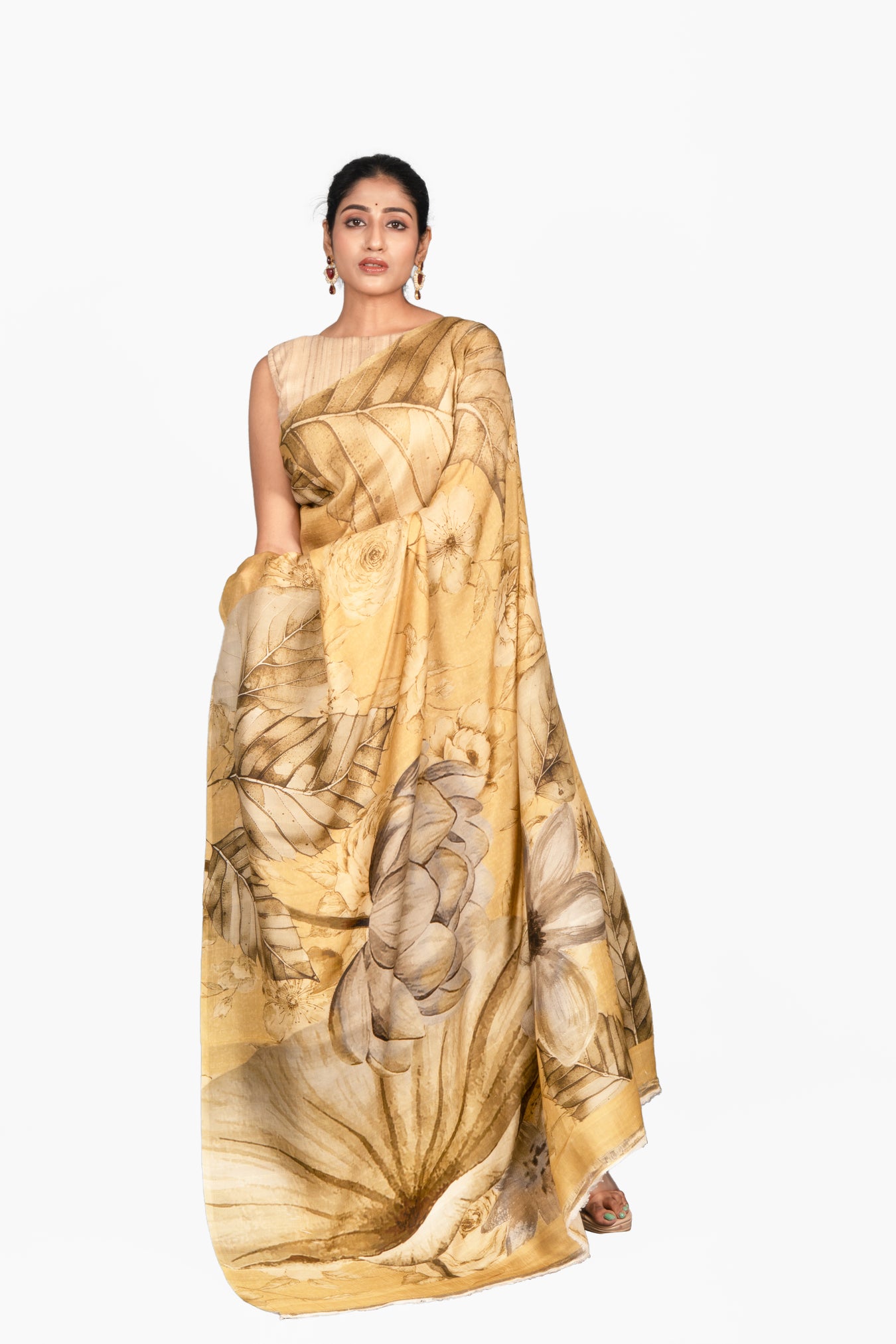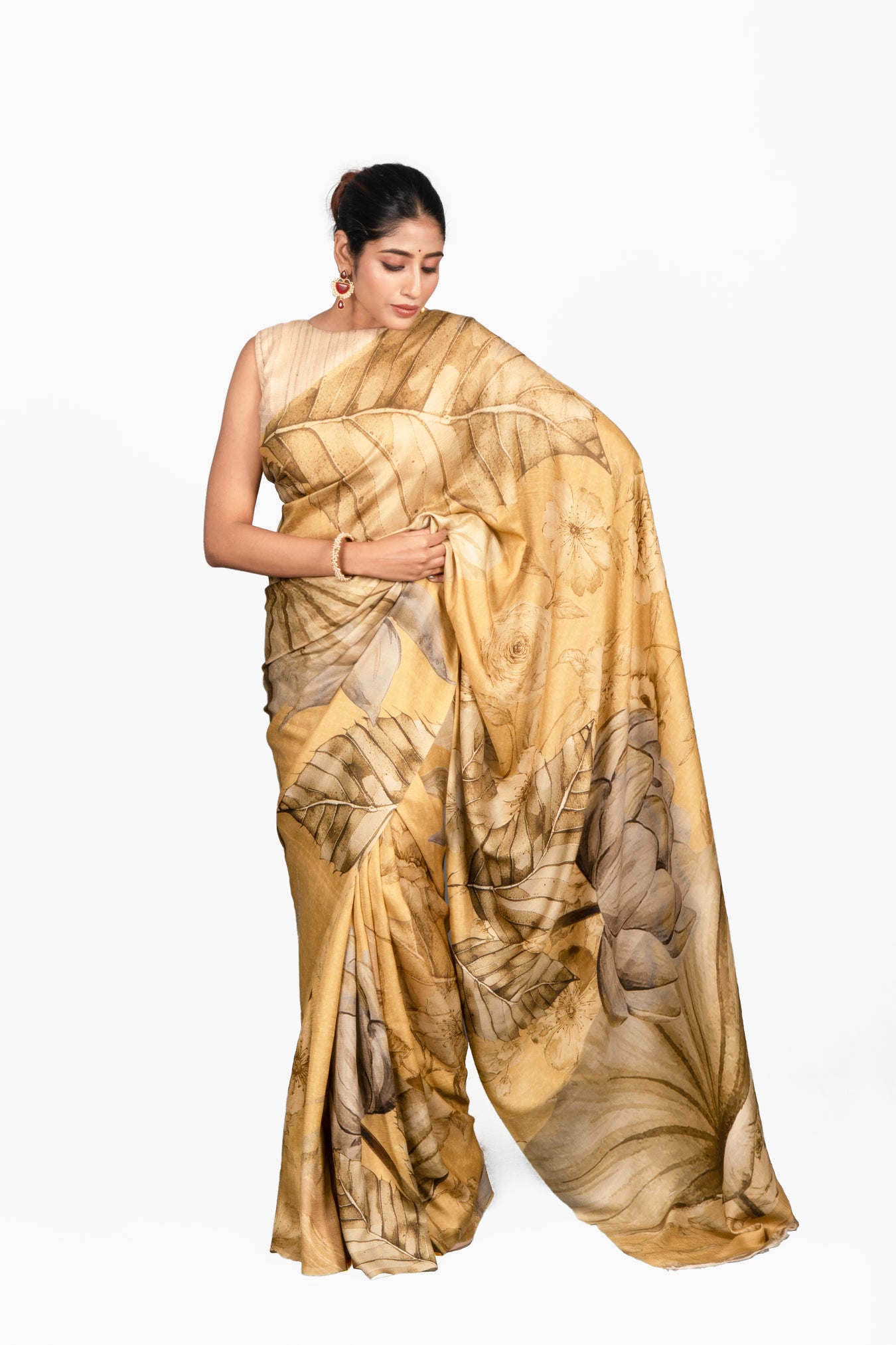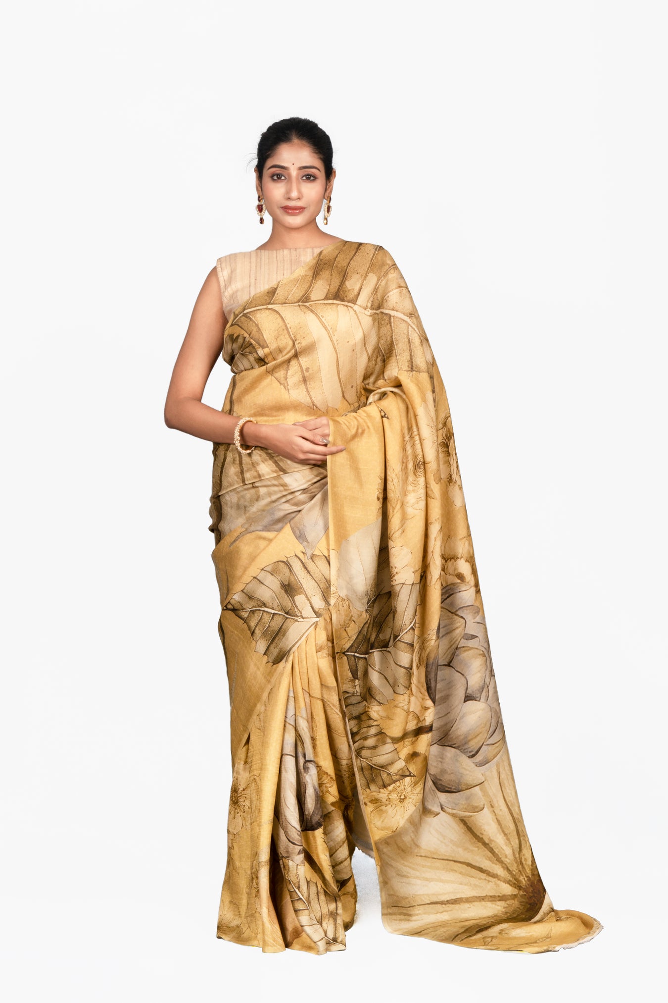 Size: 5.50Mtr B: 0.80MtrColor: Golden yellowFabric: Mulberry SilkPattern and print: A rich mustard-gold saree featuring artistic leaf motifs in earthy tones, blending natural elegance with timeless sophistication. Purity: Natural fabricCare instructions: Dry wash