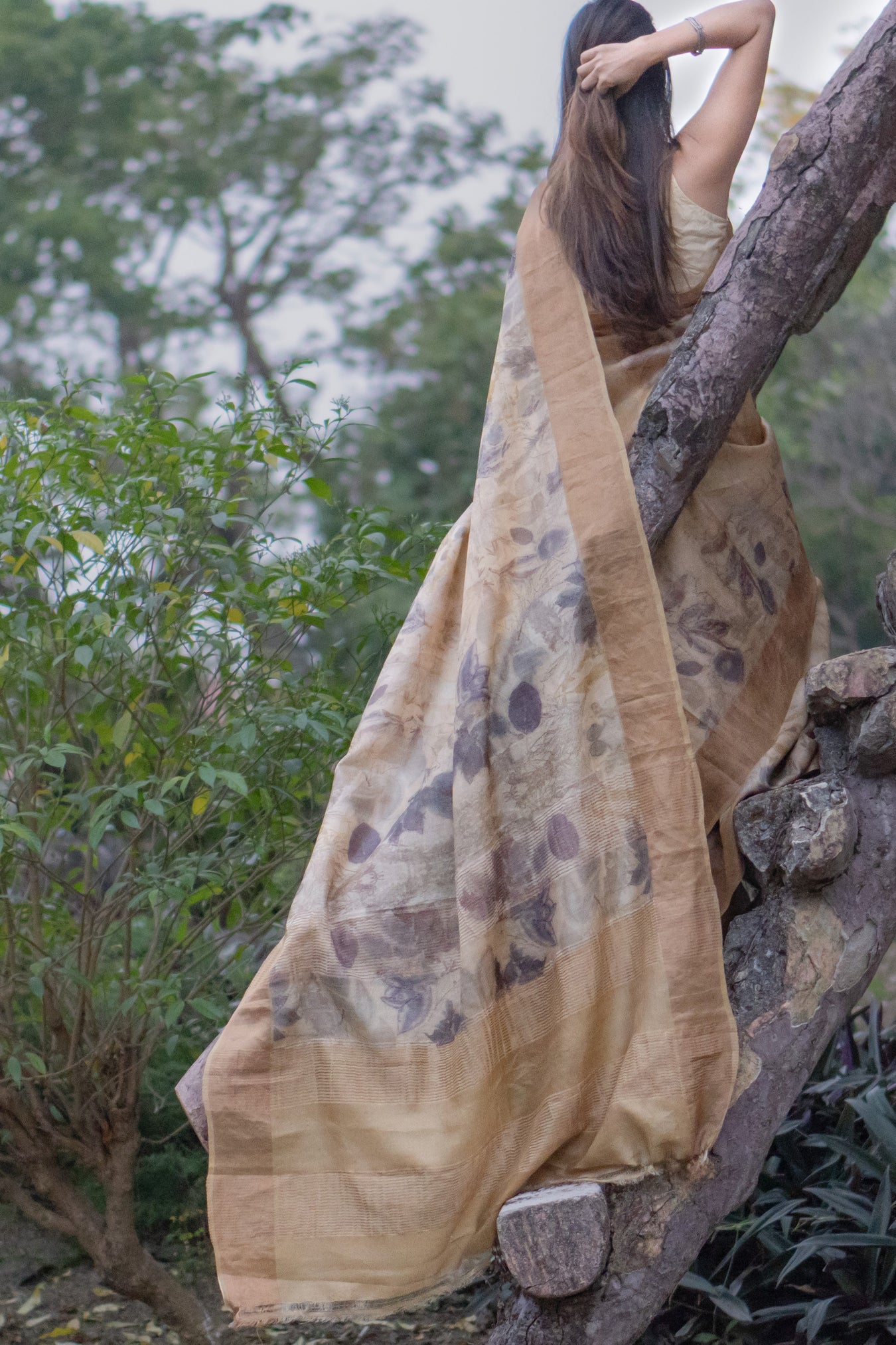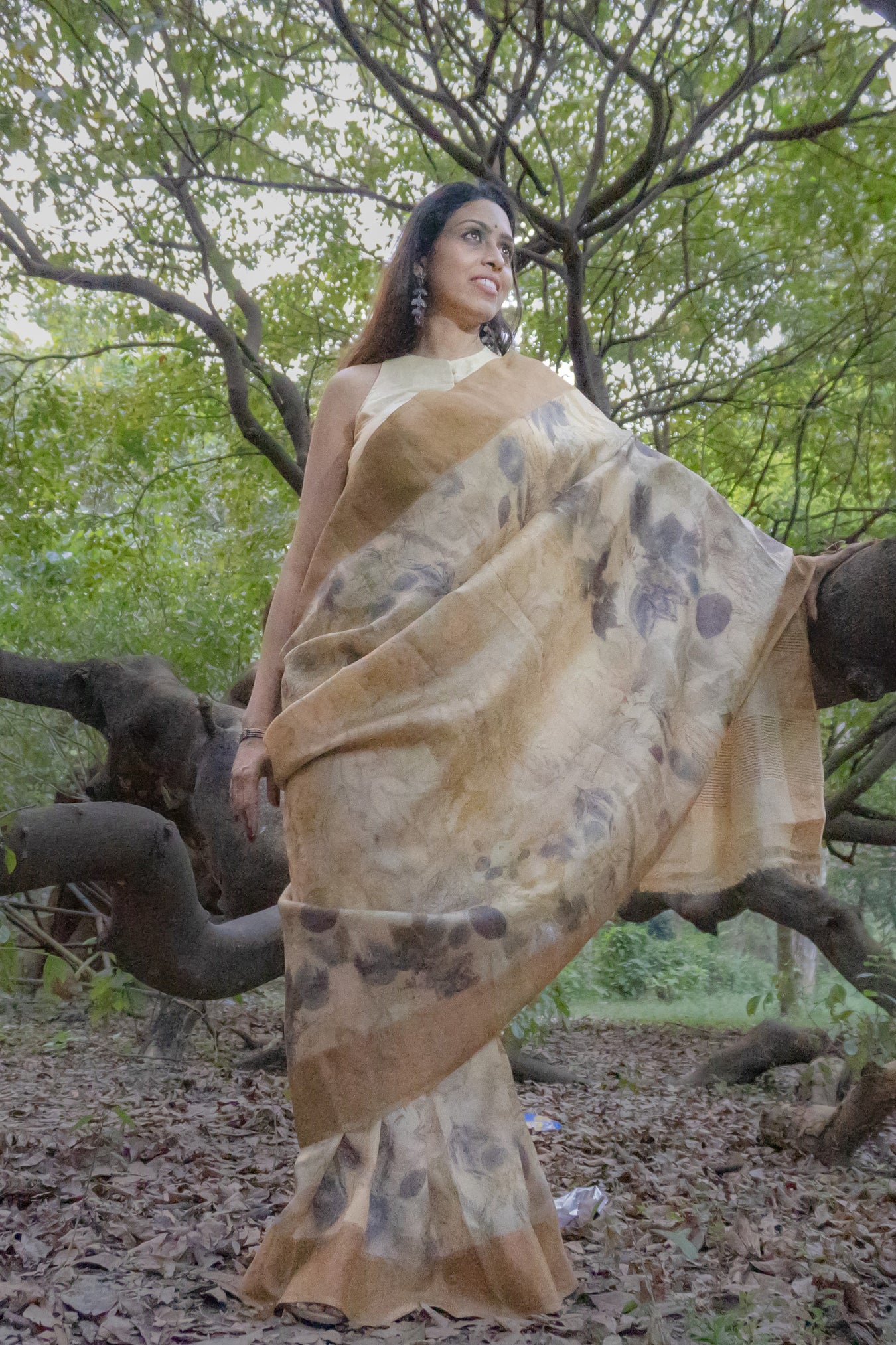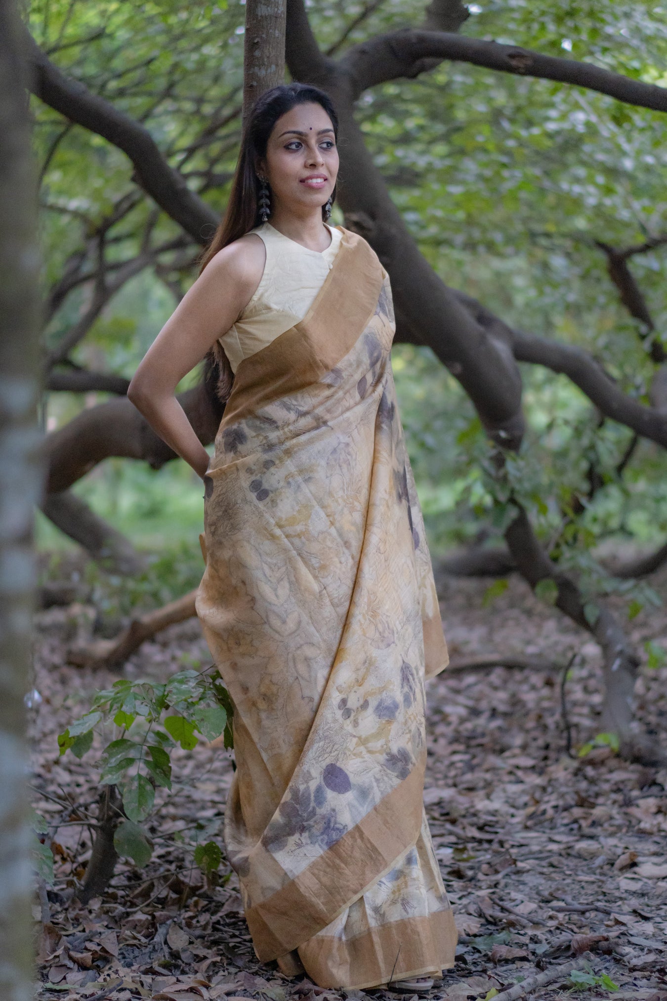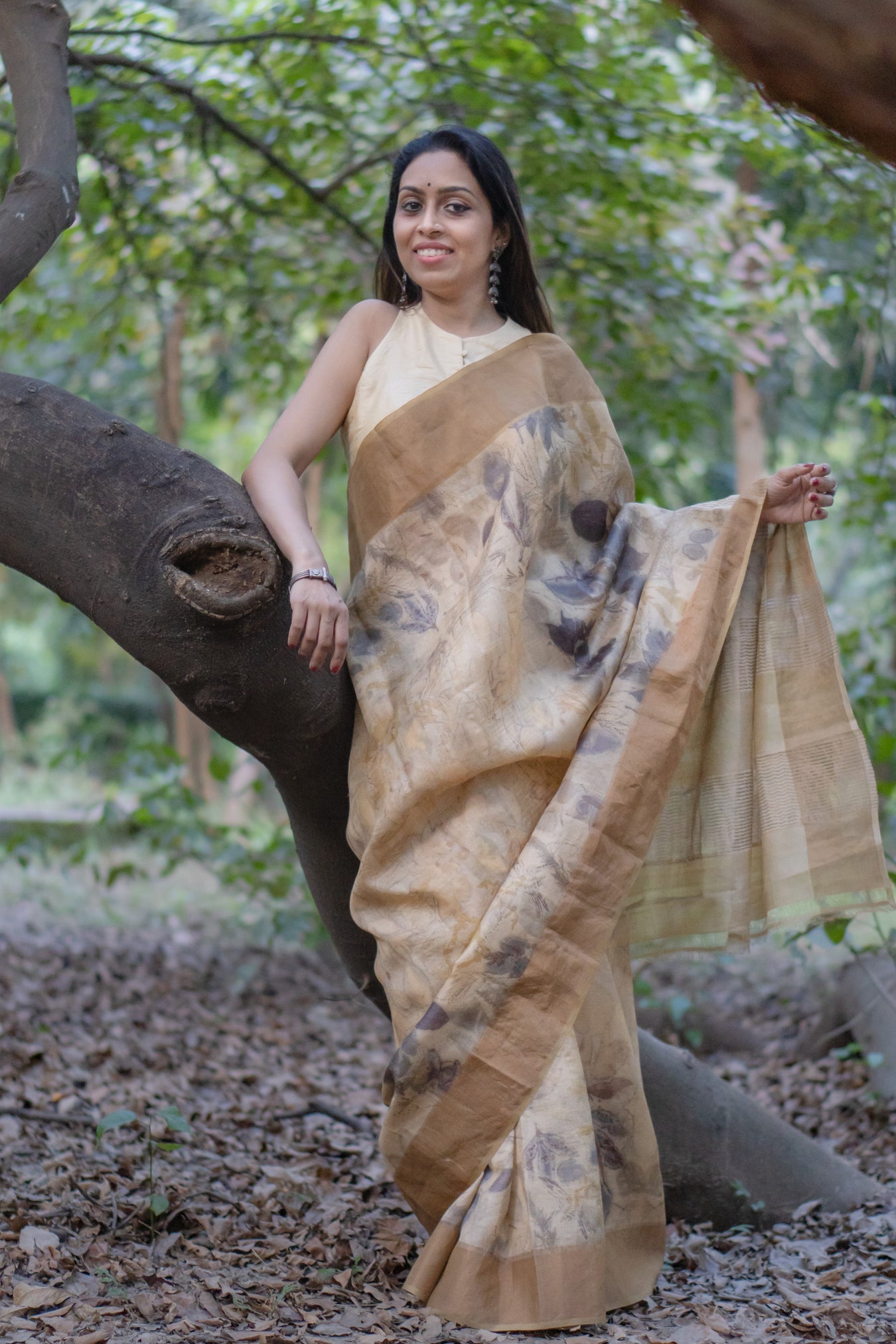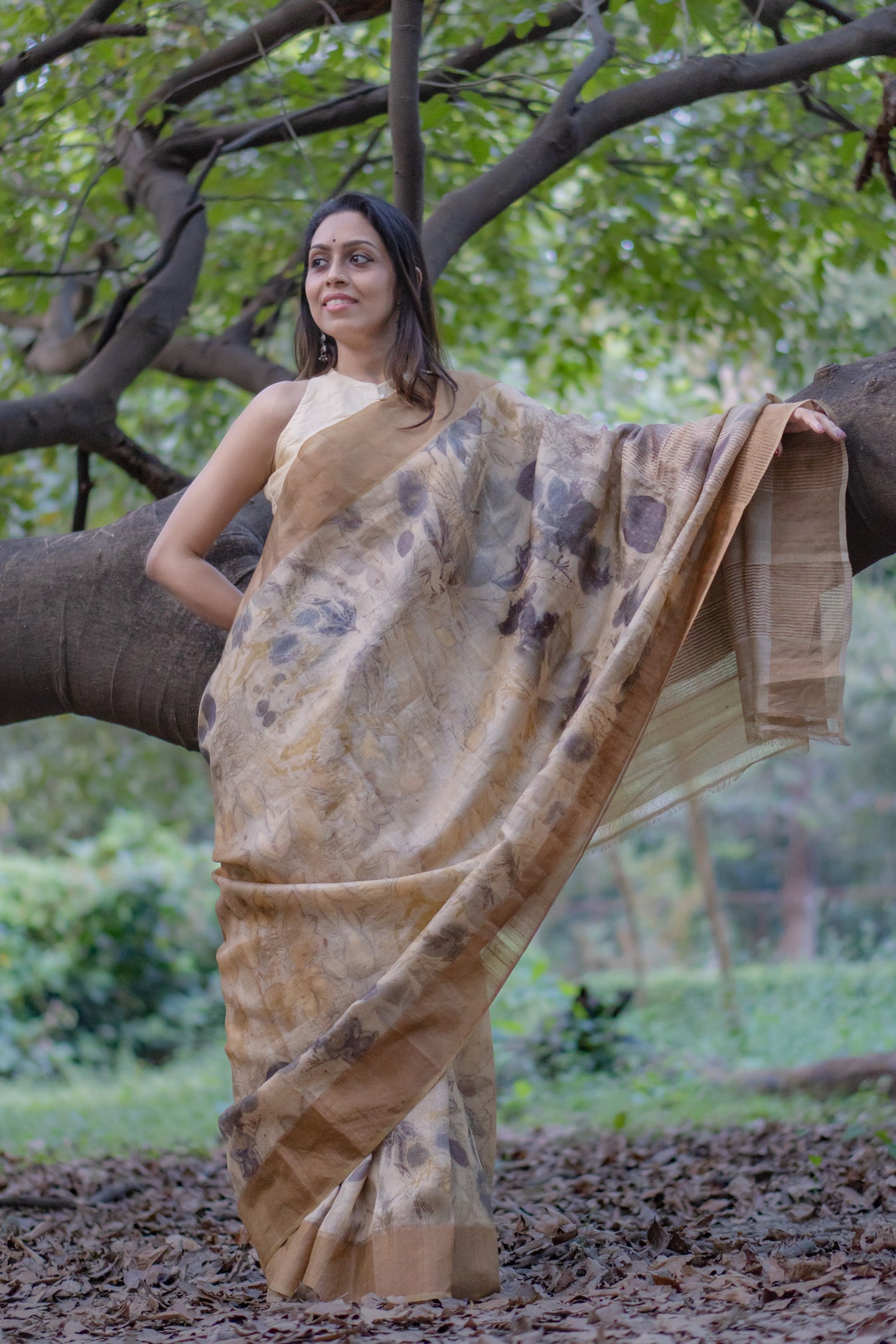 Pattern and print: The Elegant Beige tussar saree featuring a stunning golden zari border. The entire saree is adorned with large grey flower prints and prominent leaves, creating a graceful and sophisticated look.