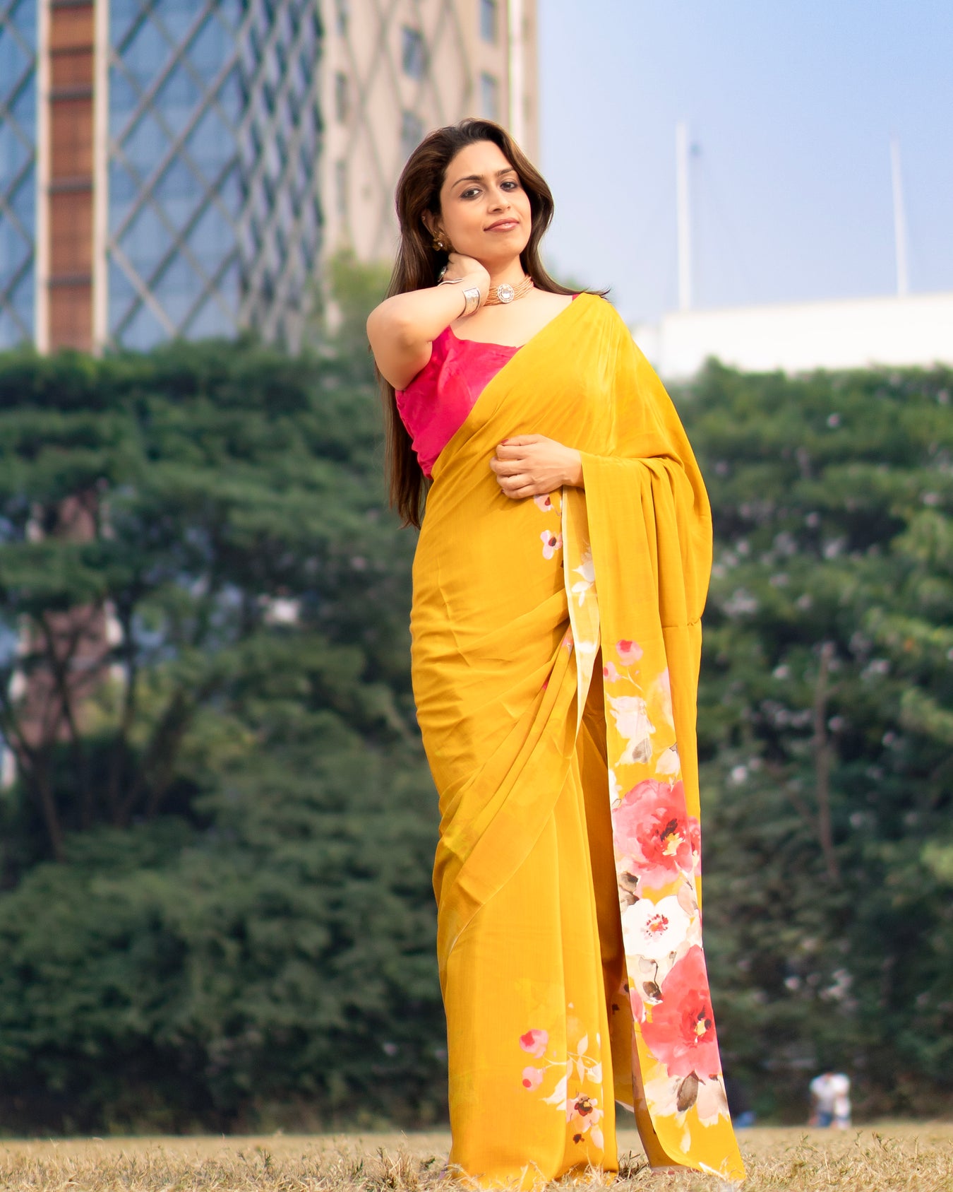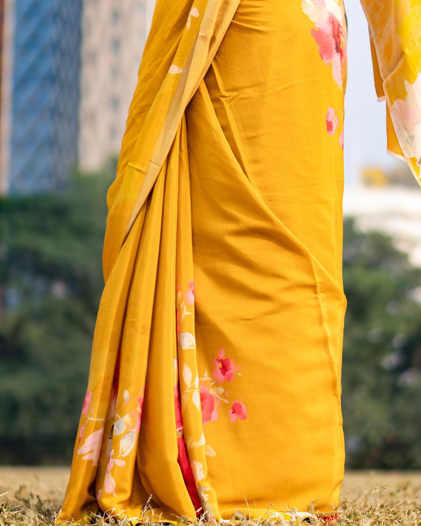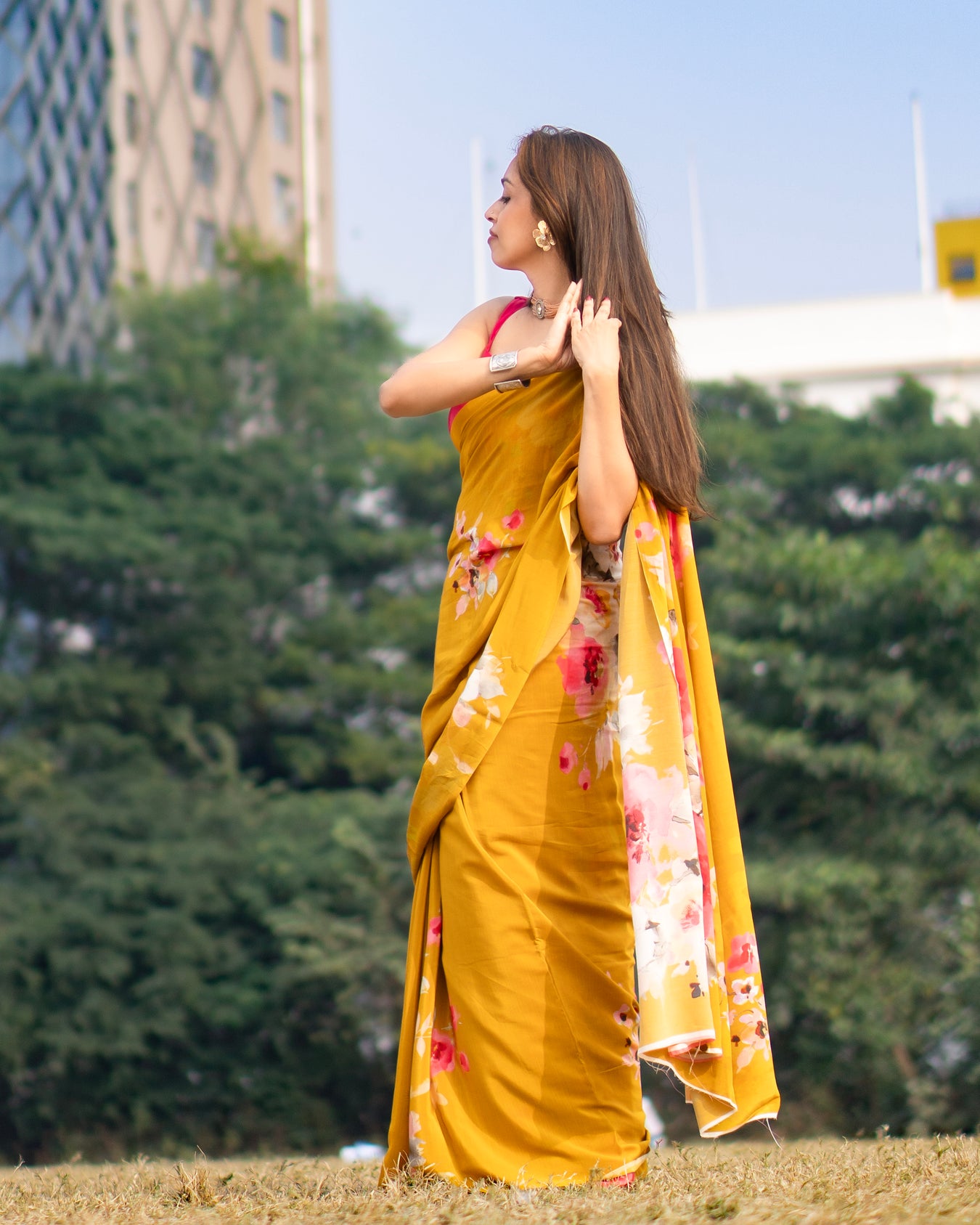Size:Â S: 5.50Mtr B: 0.80MtrColor: yellowFabric: Crepe ViscousPattern and print: The mustard yellow saree adorned with a captivating design featuring floral motifs throughout the fabric. The crepe material lends a lightweight and flowing quality to the saree, making it both elegant and comfortable to wear. The vibrant yellow color serves as a cheerful backdrop, while the intricate floral pattern adds a touch of femininity and grace.Care instructions:Â Dry wash