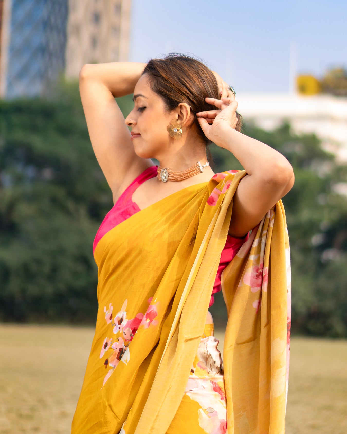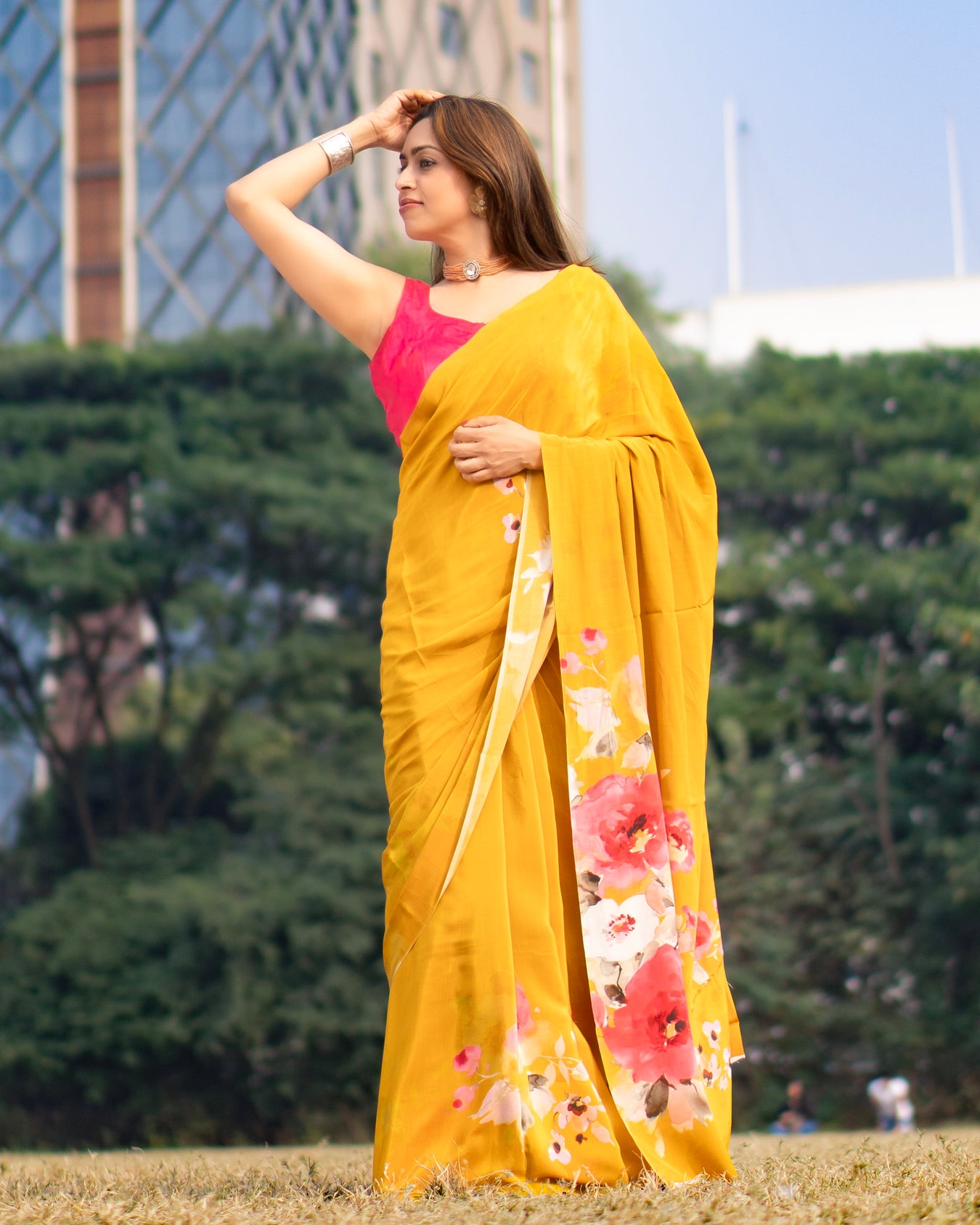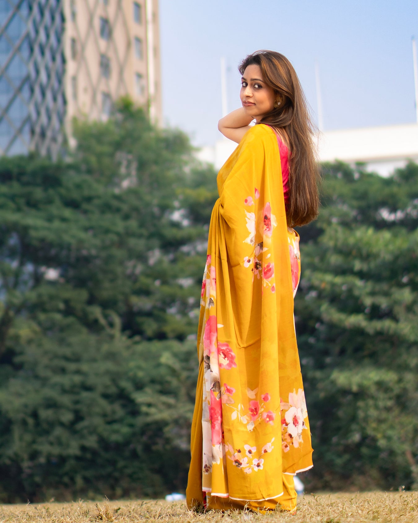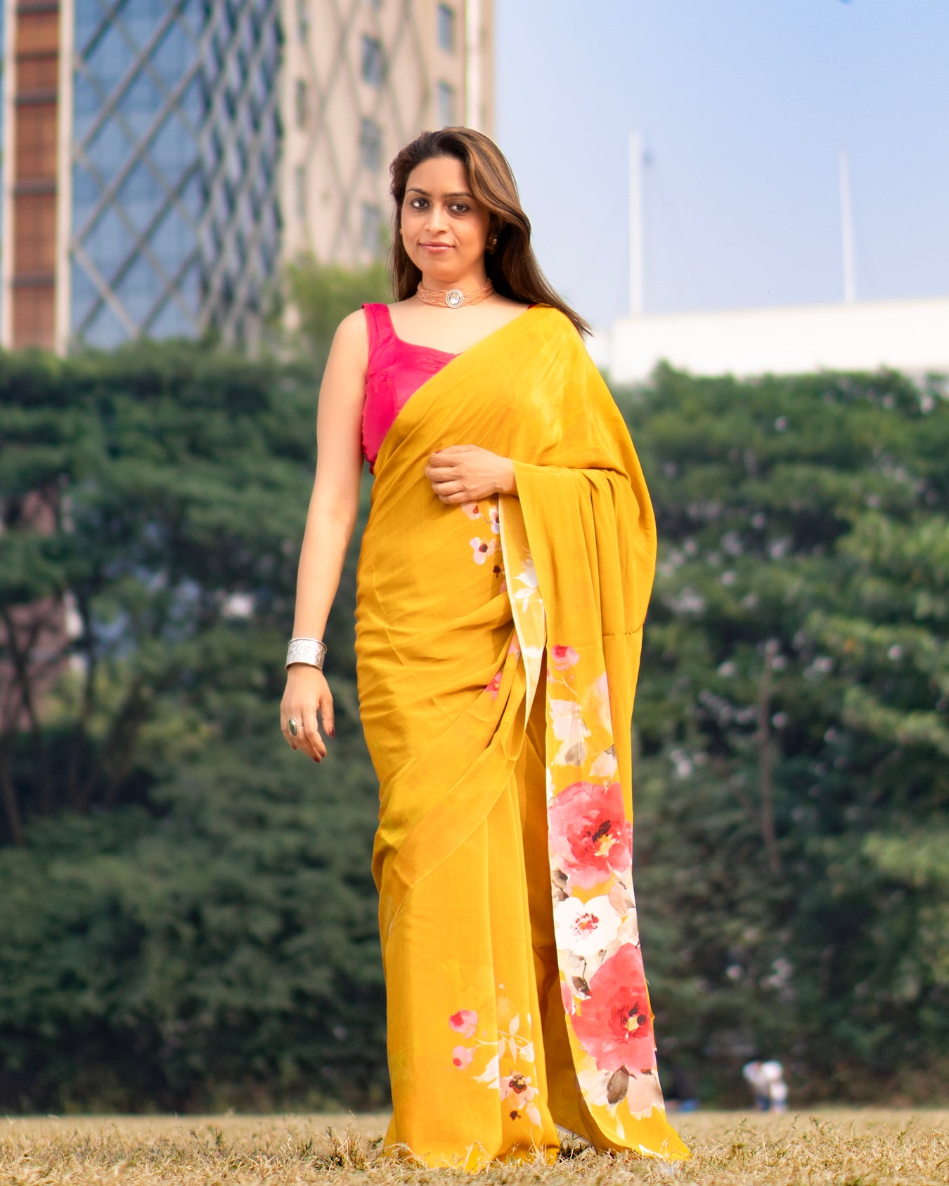 Size:Â S: 5.50Mtr B: 0.80MtrColor: yellowFabric: Crepe ViscousPattern and print: The mustard yellow saree adorned with a captivating design featuring floral motifs throughout the fabric. The crepe material lends a lightweight and flowing quality to the saree, making it both elegant and comfortable to wear. The vibrant yellow color serves as a cheerful backdrop, while the intricate floral pattern adds a touch of femininity and grace.Care instructions:Â Dry wash