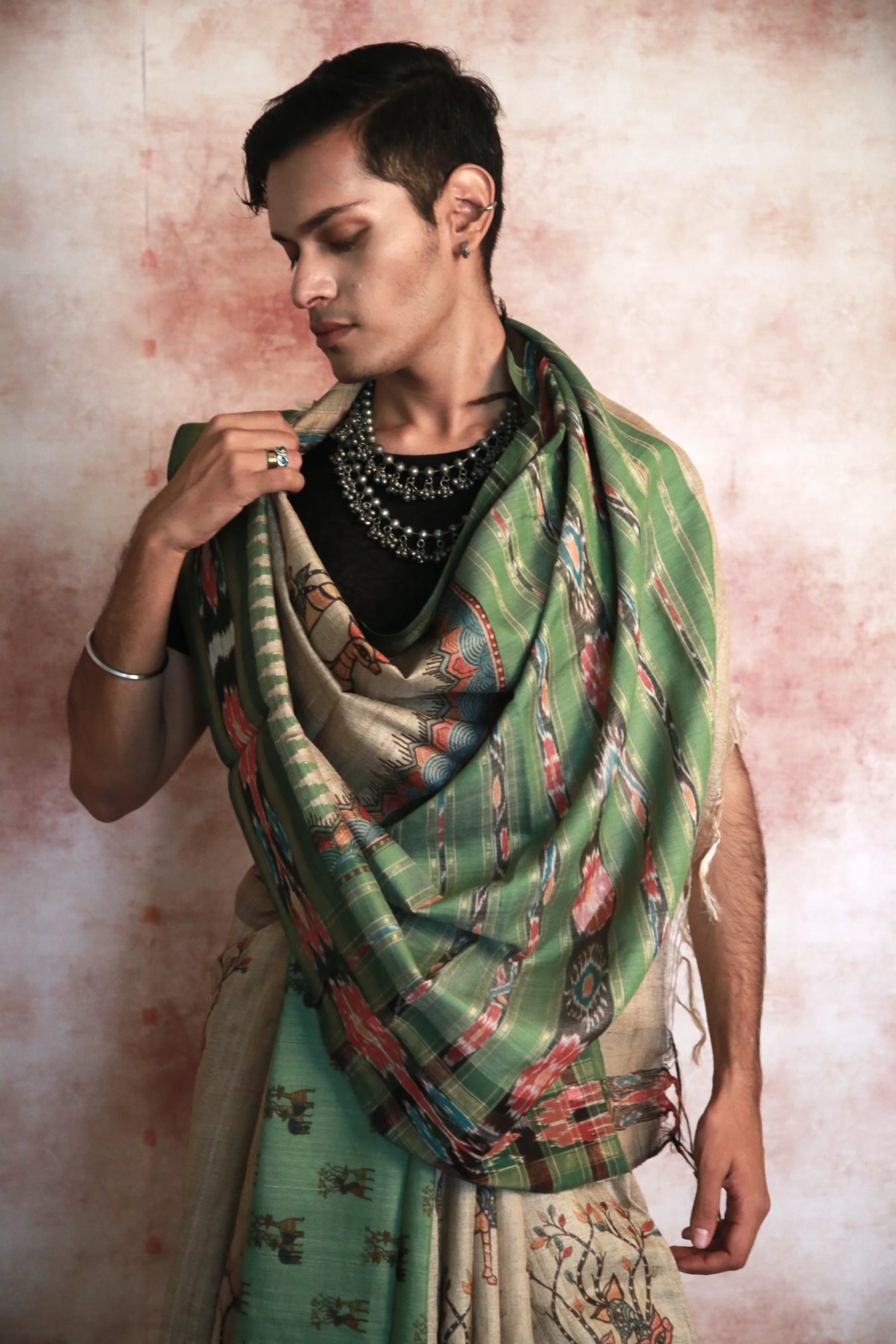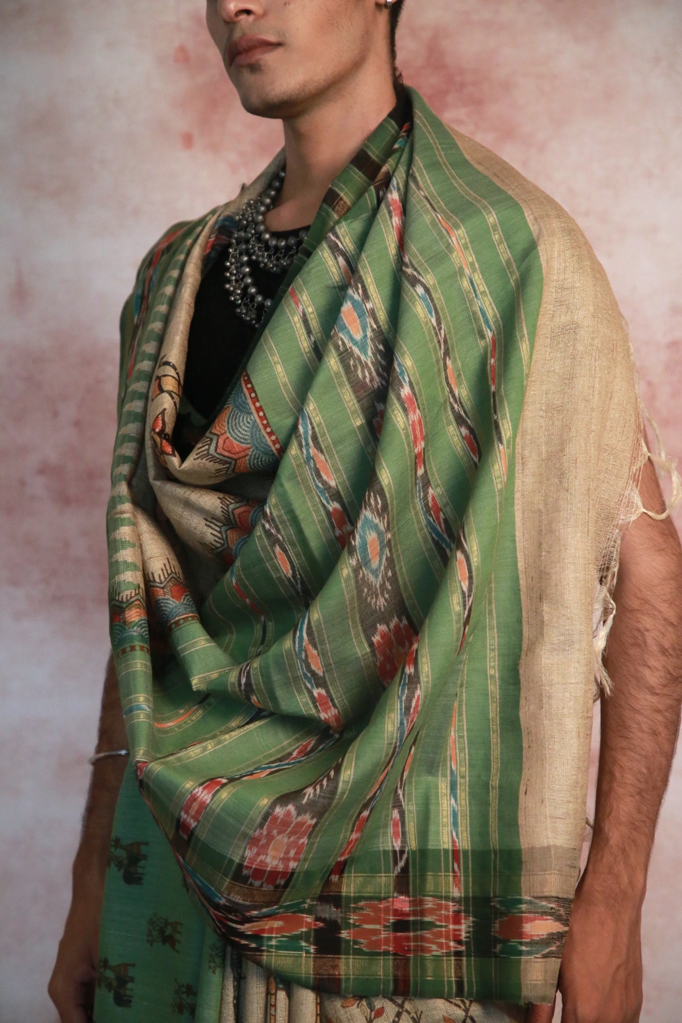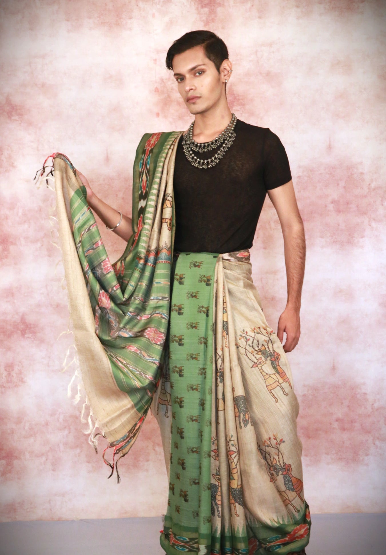 Made from pure Tussar silk, this handloom saree features a soothing beige green base complemented by a vibrant green border, Gond deer prints and ikat designs, it showcases the rich cultural heritage of India.