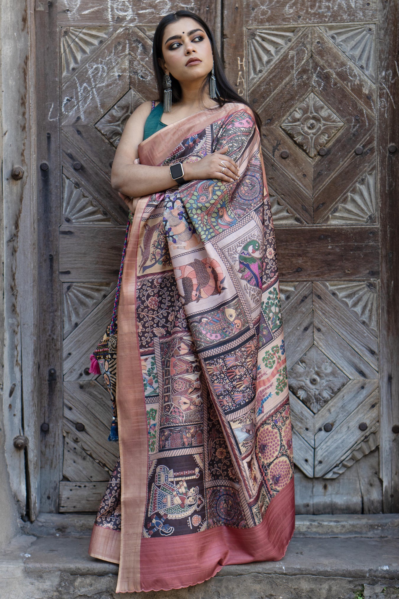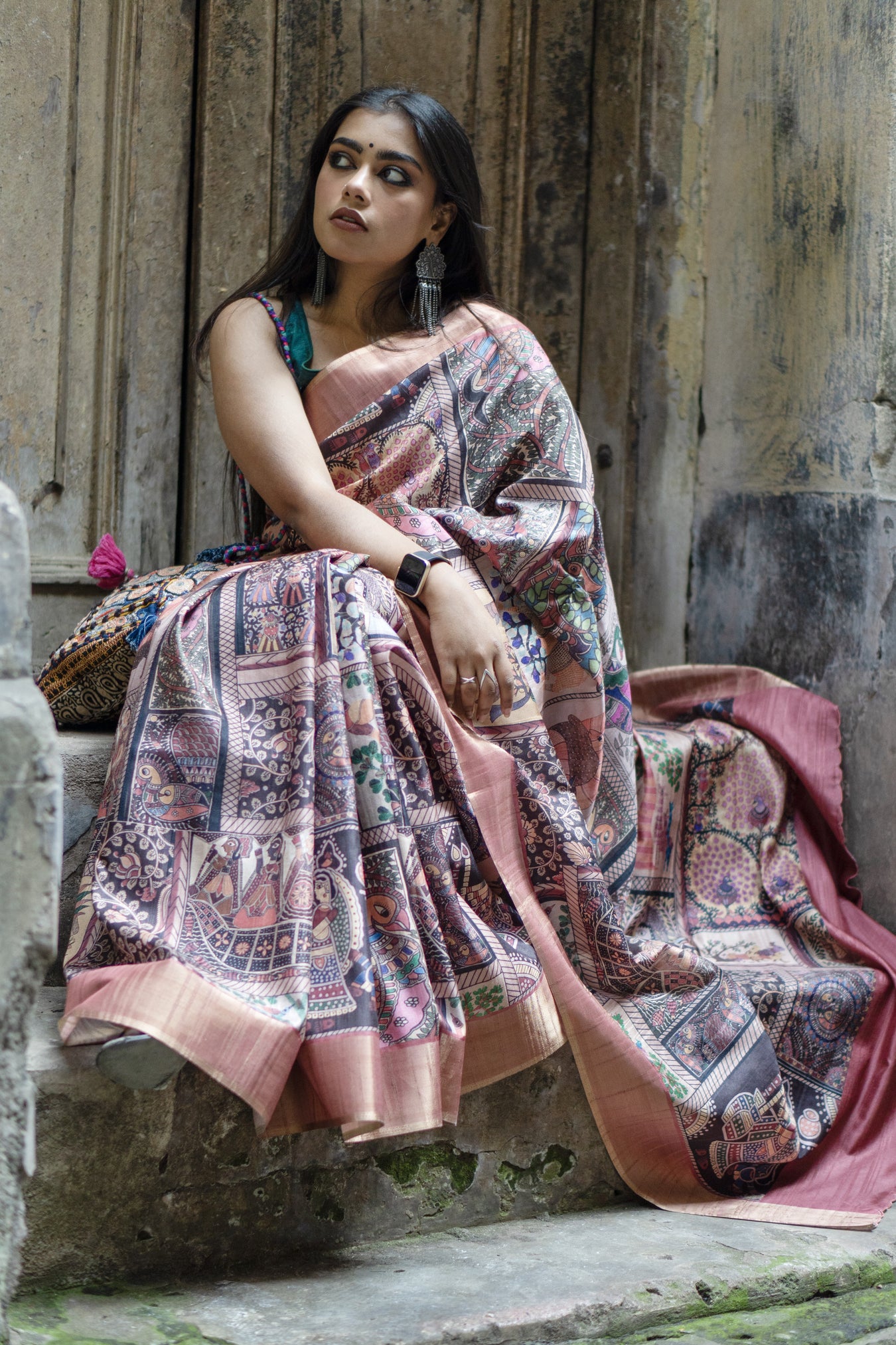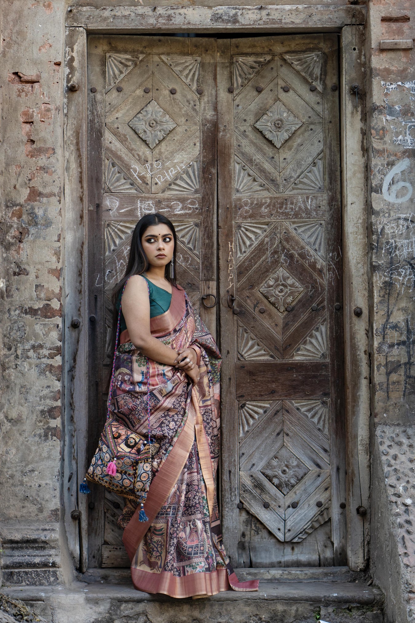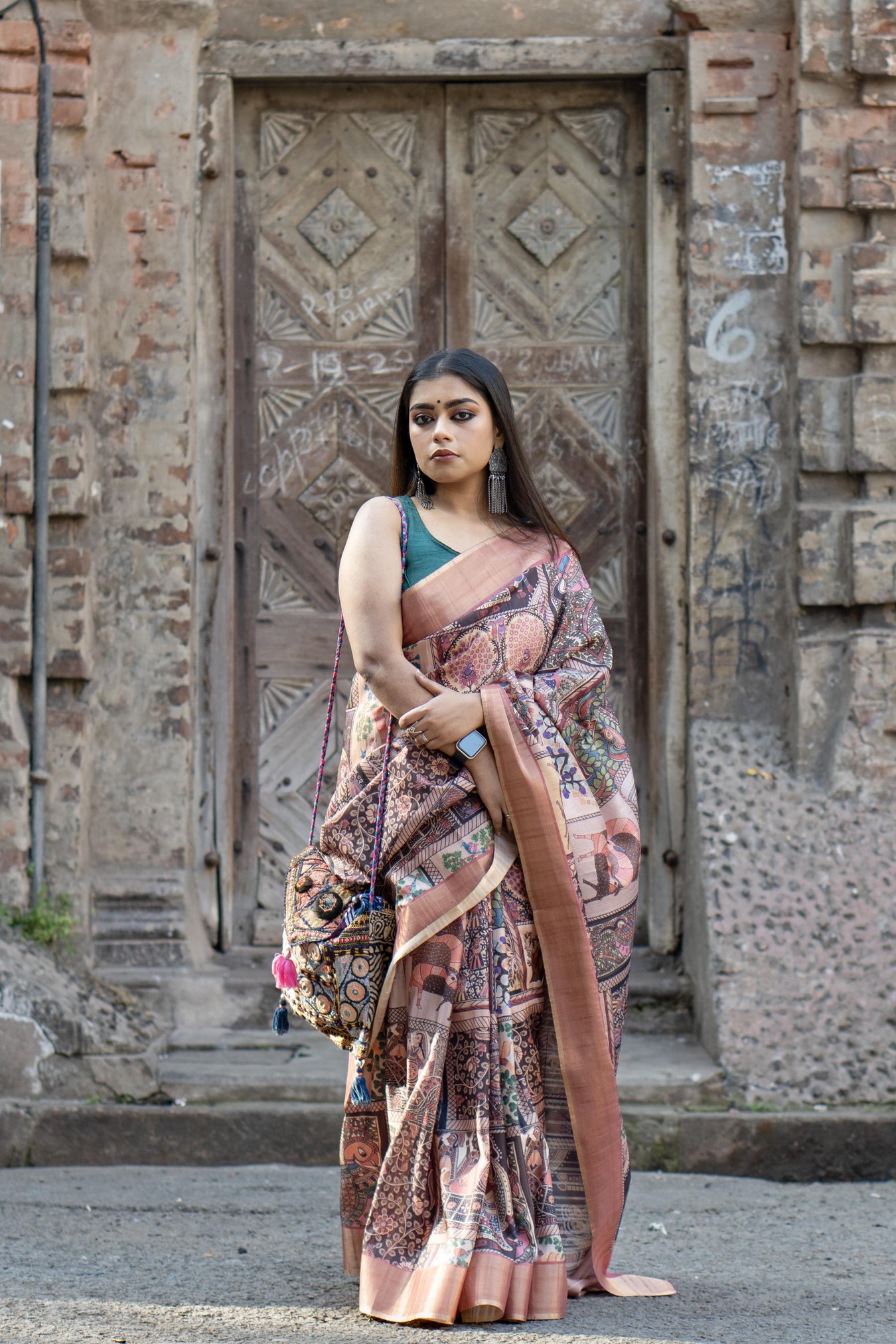 Size:Â 5.50Mtr B: 0.80MtrColour: BeigeFabric: Semi Tussar zari weavedPattern and print: The saree in beige color with an elegant zari border, complemented by intricate kalamkari prints. The fusion of traditional zari work and artistic kalamkari designs adds a touch of sophistication to this beautiful saree.Care instructions:Â Dry wash