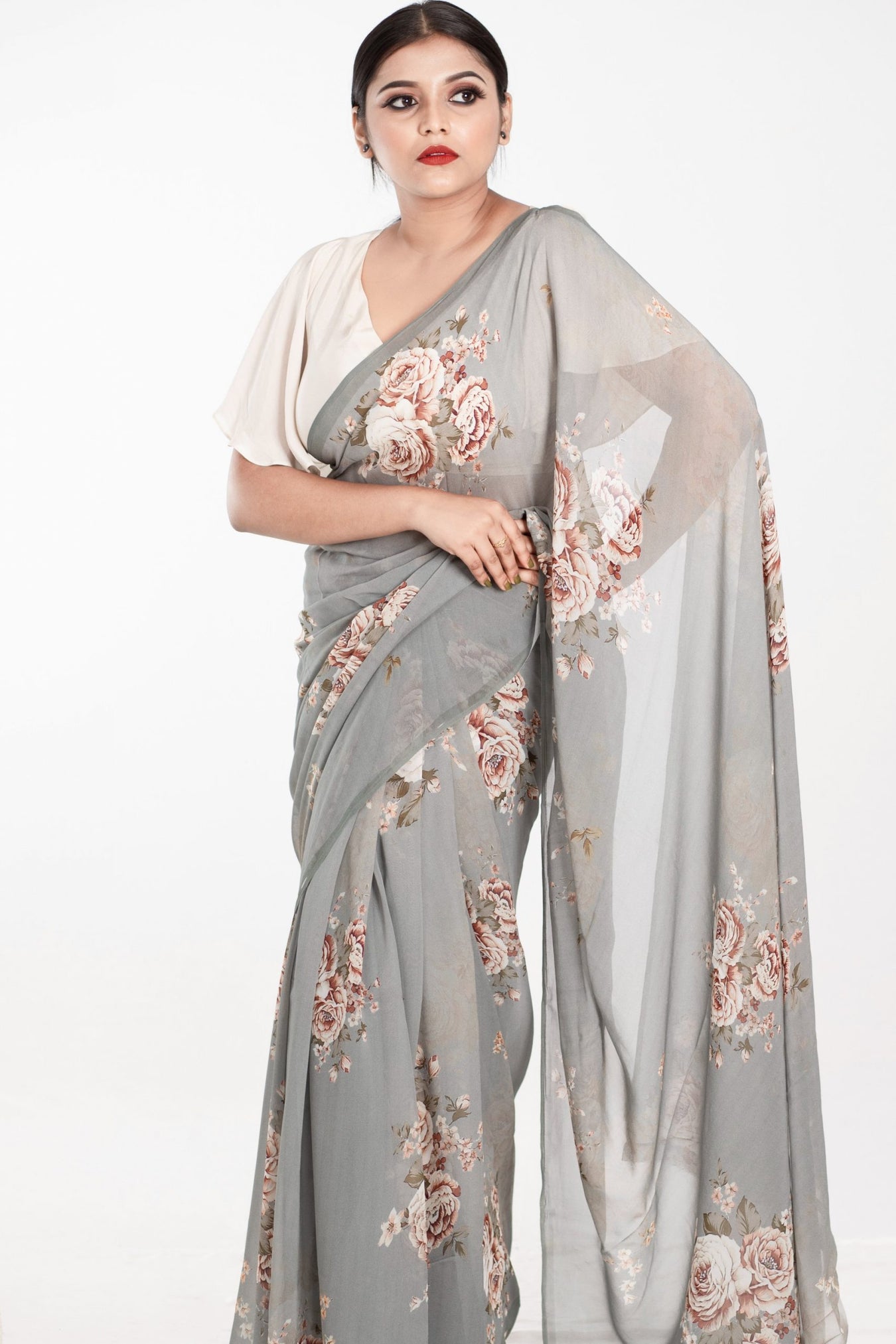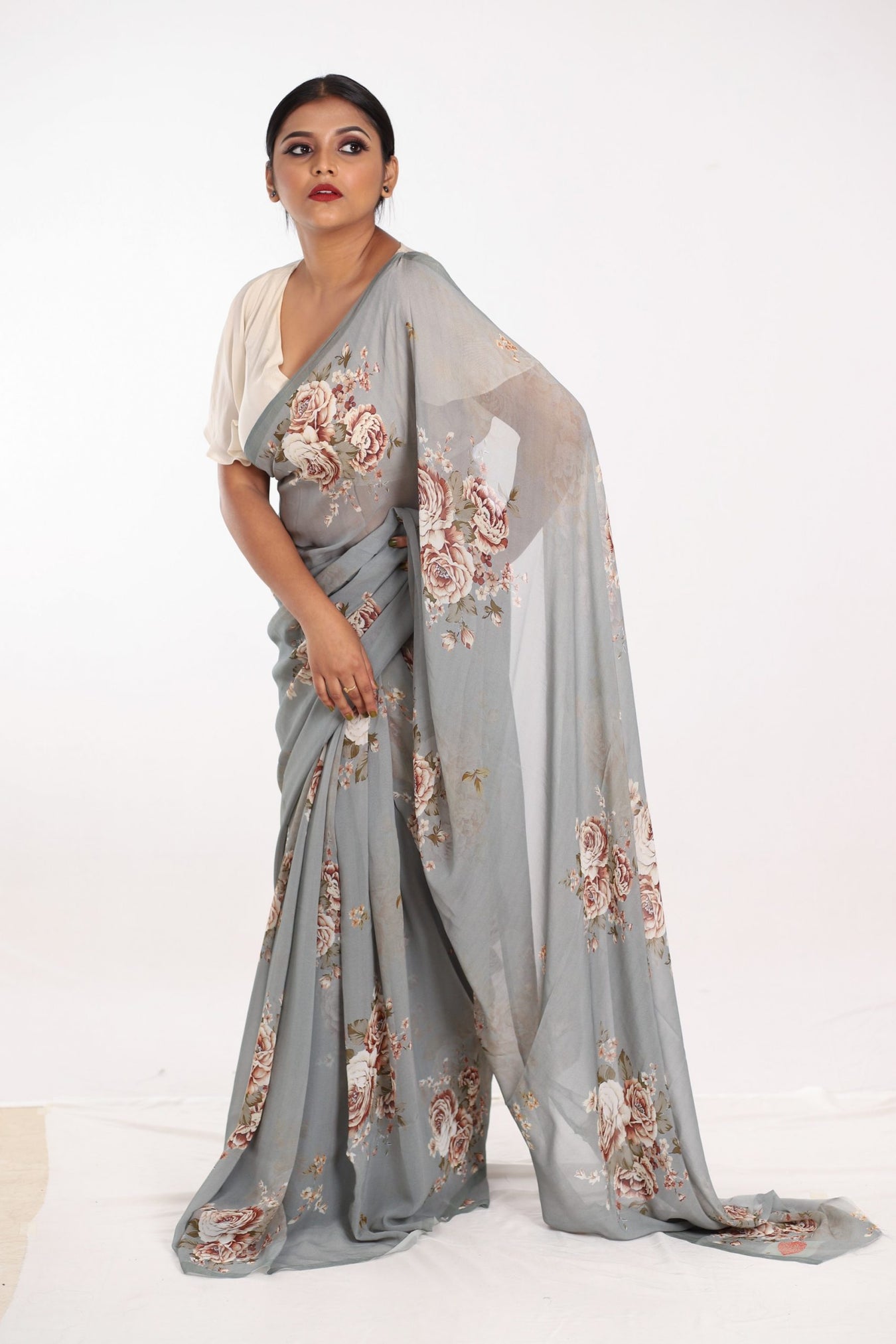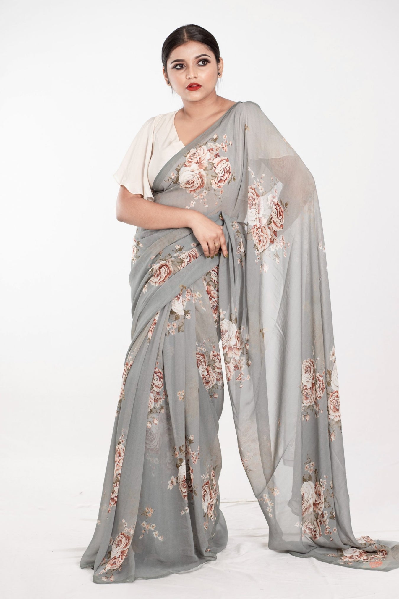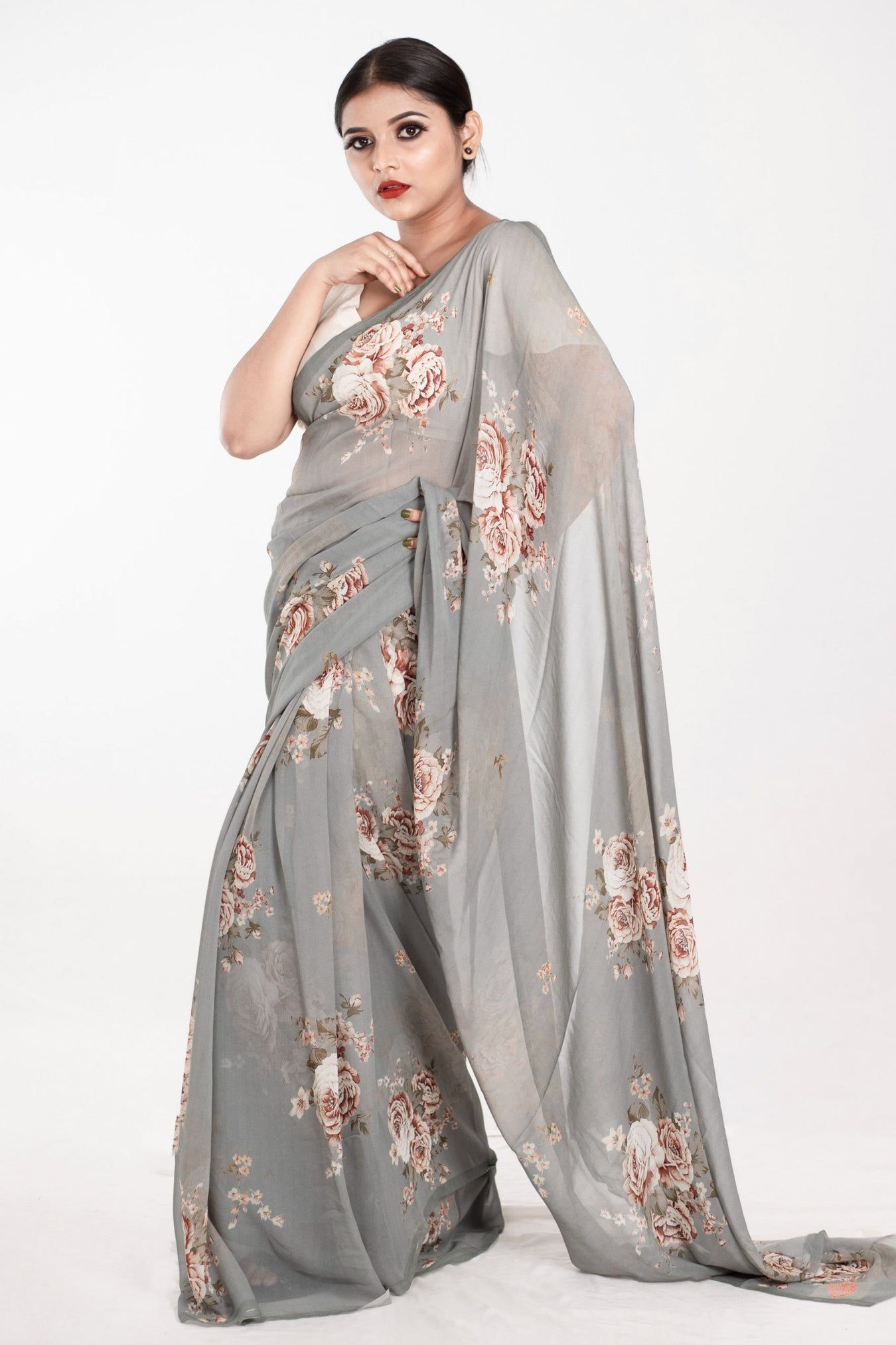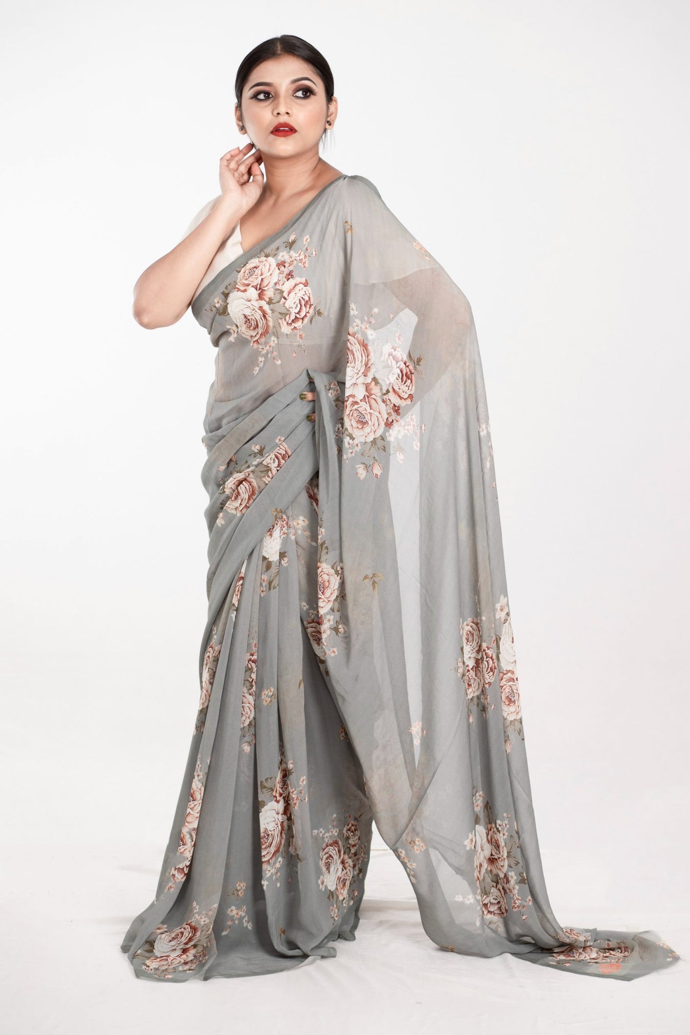 Size:Â S: 5.50Mtr B: 0.80MtrColour: GreyFabric: GeorgettePattern and print: Rose bunches in flowing Grey eclectic Georgette. On grey and white tone with a touch of nude pinks the Saree drapes softly creating a soft, romantic, feminine look. The soft grey color of the saree along with the bright rose bunches resonates womanhood and beauty. Soft fabrics drape into soft falls making the saree standout.