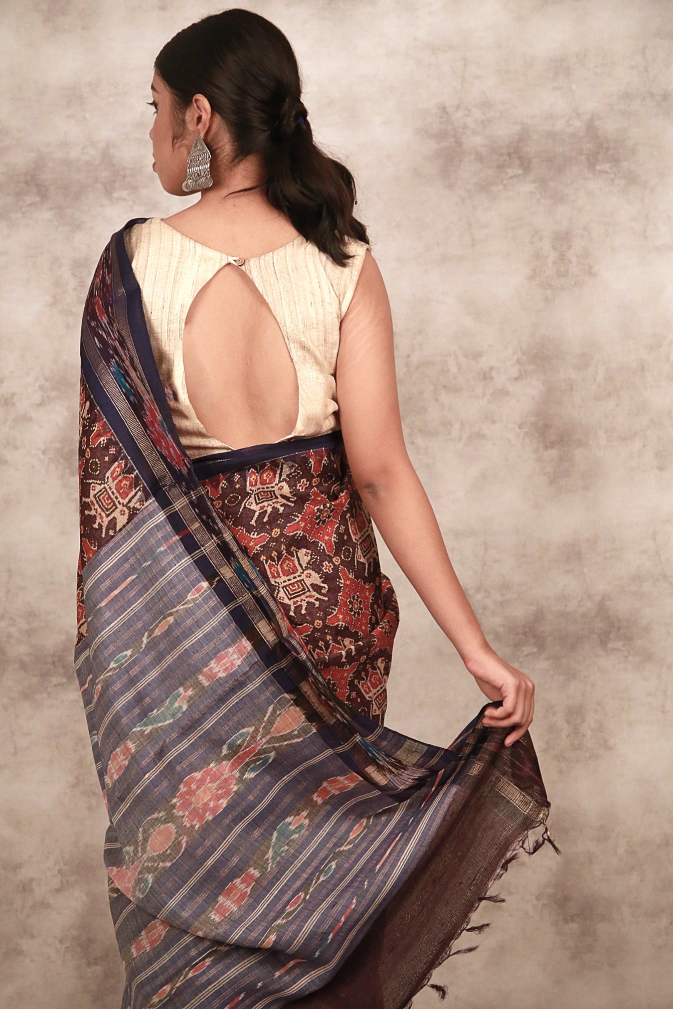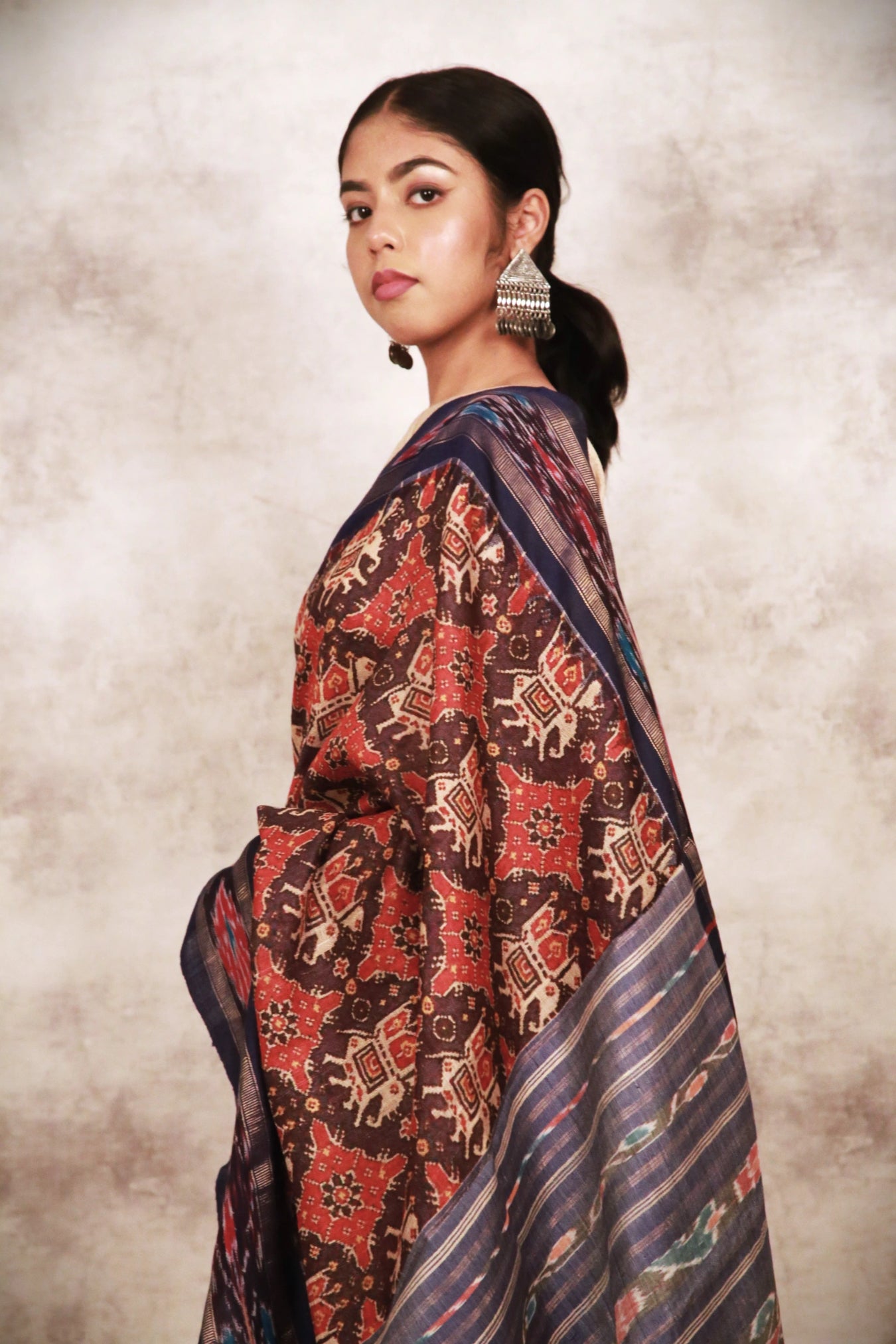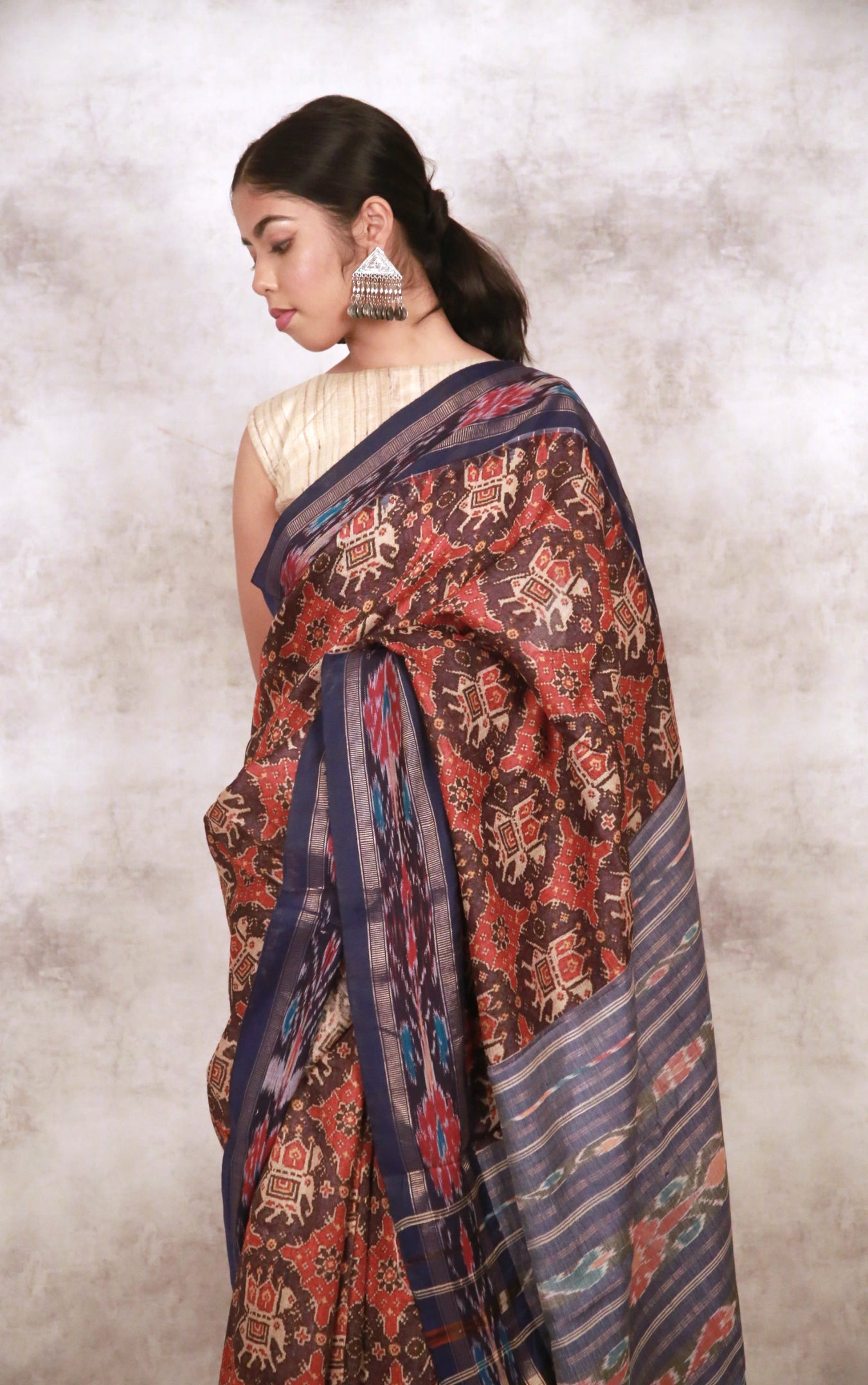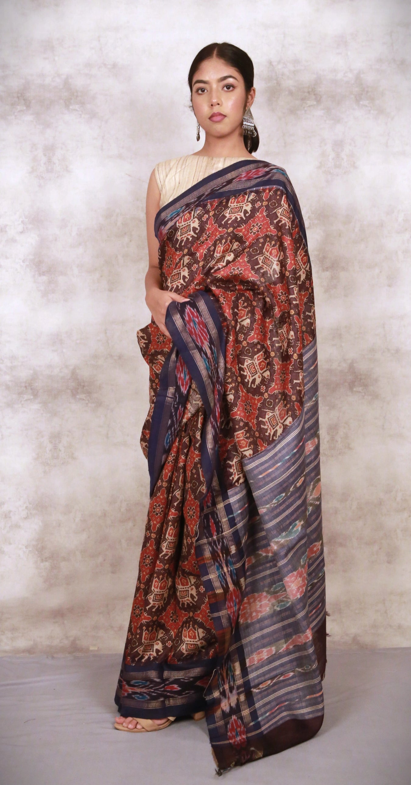 Size: 5.50Mtr B: 0.80MtrColor: Brown And Red With Navy Blue BorderFabric: Vidharbha Temple Handloom Tussar SareePattern and print: Elegance meets tradition in this Vidharbha handloom saree. Enhanced with a striking ikkat border, it exudes timeless charm. The scattered patola designs add a sophisticated touch, making it perfect for any special occasion. A testament to exquisite craftsmanship and refined style, this saree is a true masterpiece.Silk purity: Pure Tassur SilkPack contains: 1 Saree, 1 BlouseCare instructions: Dry wash