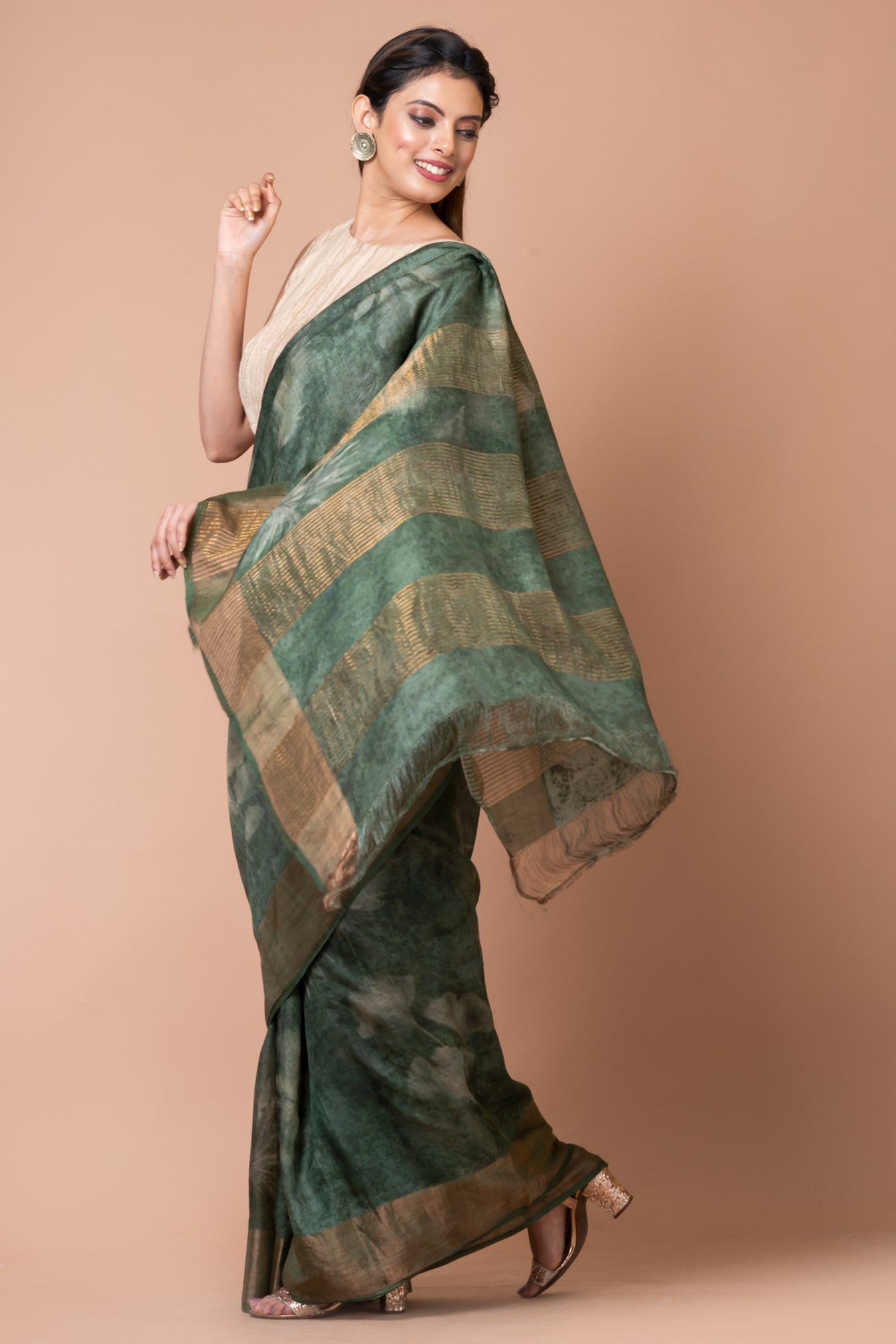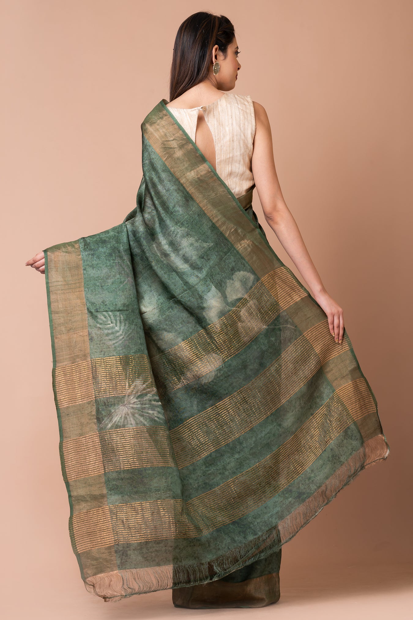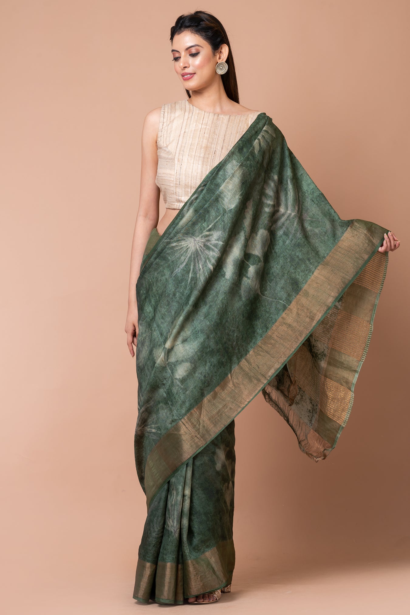 Size: S: 5.50Mtr B: 0.80MtrColour: Bottle greenFabric: Tussar silkPattern and print:Introducing our eco-print style digital print tussar silk saree, a fusion of nature-inspired elegance and modern technology. Crafted with care, this saree features intricate foliage motifs digitally rendered onto luxurious tussar silk. Earthy tones and subtle embellishments enhance its charm. Pair with a simple blouse for effortless sophistication. Flaunt sustainable style with every wear.Silk purity: Pure Tussar Silk with zari borderPack contains: 1 Saree, 1 BlouseCare instructions: Dry wash