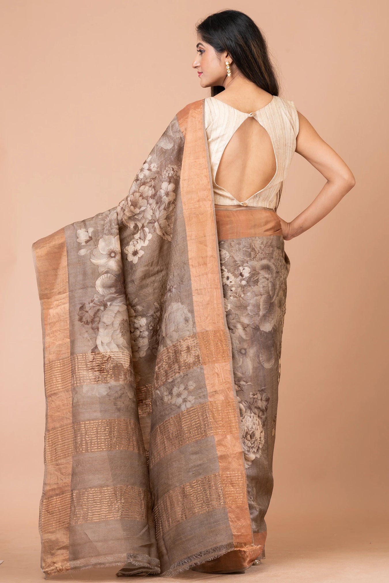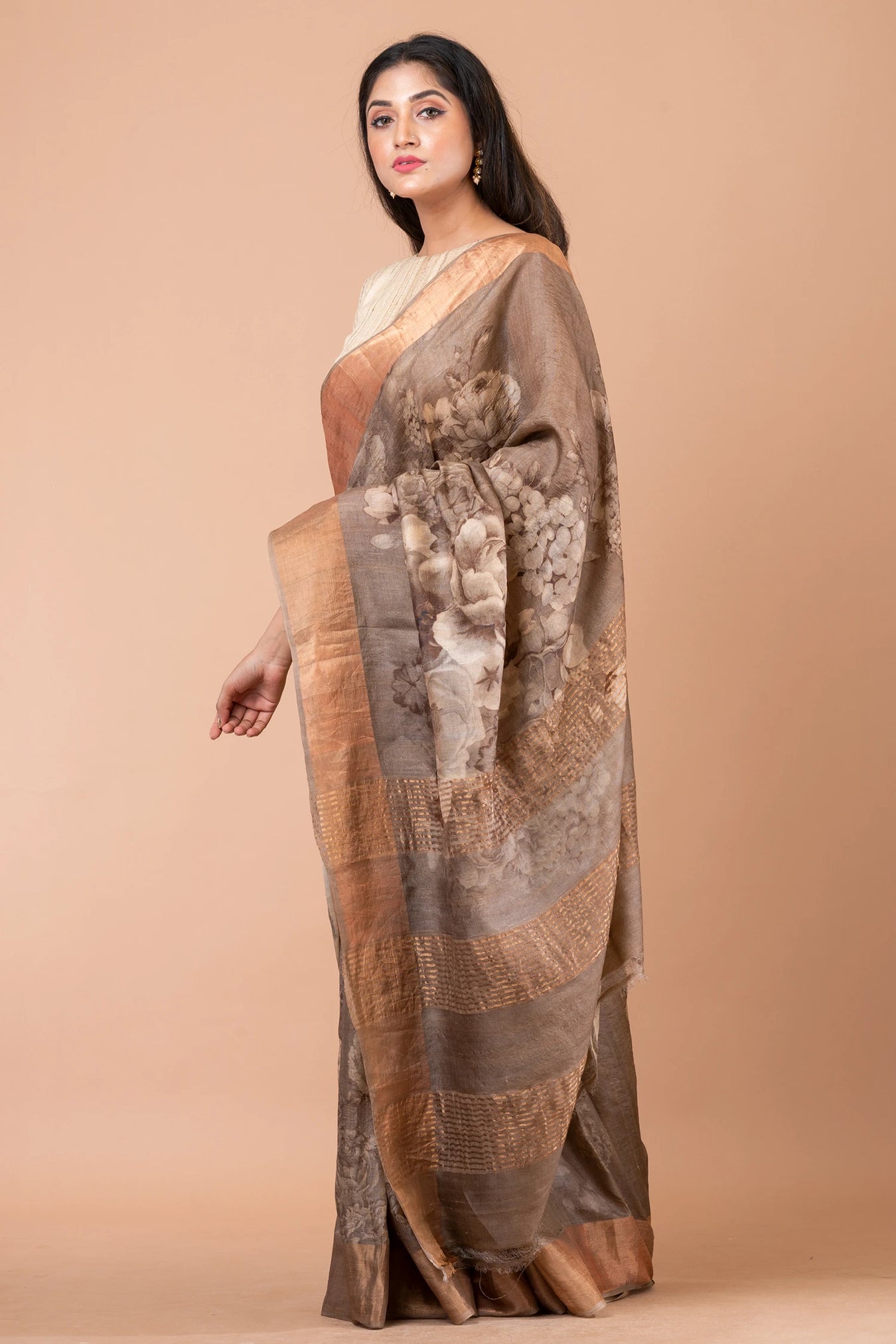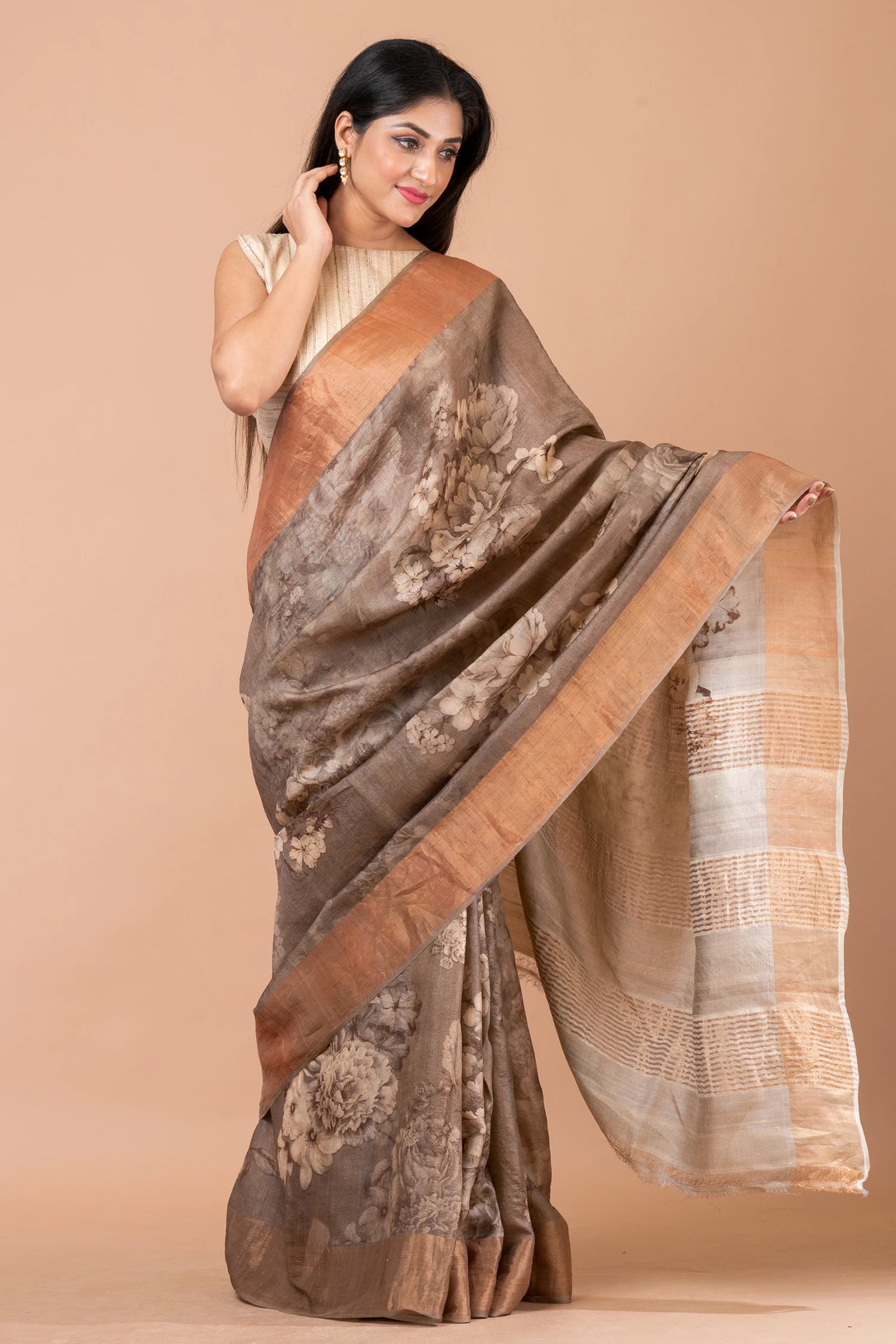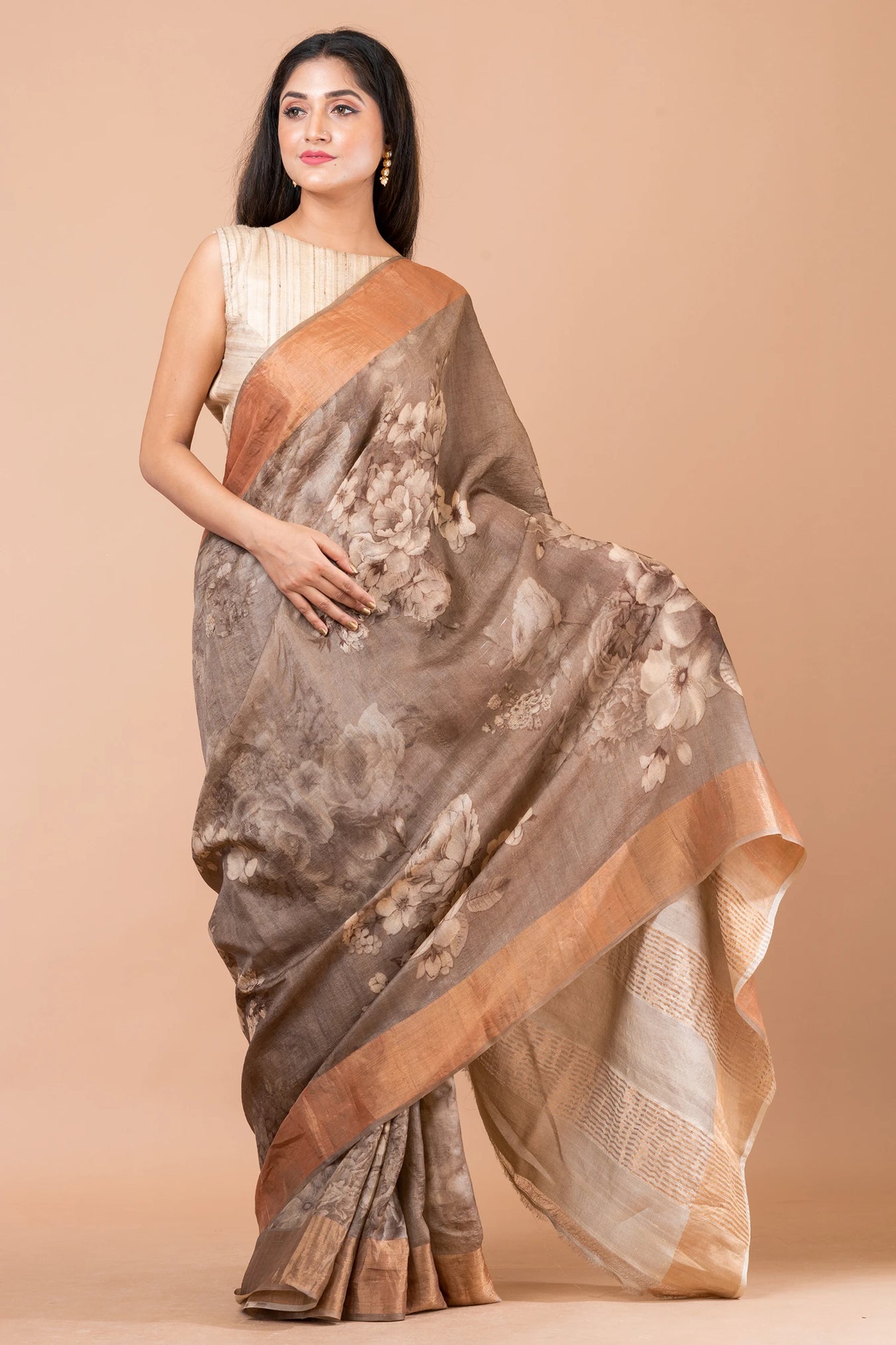 Size:Â S: 5.50Mtr B: 0.80MtrColour: BeigeFabric: Tussar Zari SilkPattern and print: Embrace the untamed beauty of nature with this enchanting Tussar saree adorned with wild dual-tone flowers printed on the fabric. The contrasting colors add depth and allure to the floral motifs, creating a captivating and unique design. Draped in this saree, you'll exude elegance and charm, making a bold fashion statement at any occasion with its exquisite blend of wilderness and grace.Silk purity: Pure Tussar SilkPack contains:Â 1 Saree, 1 BlouseCare instructions:Â Dry wash