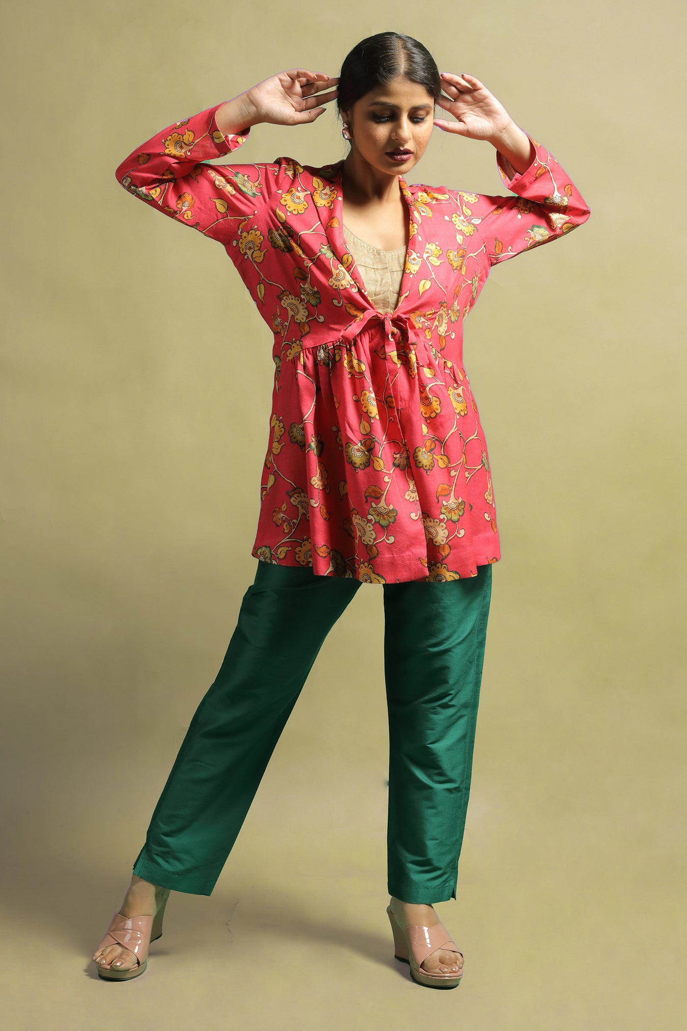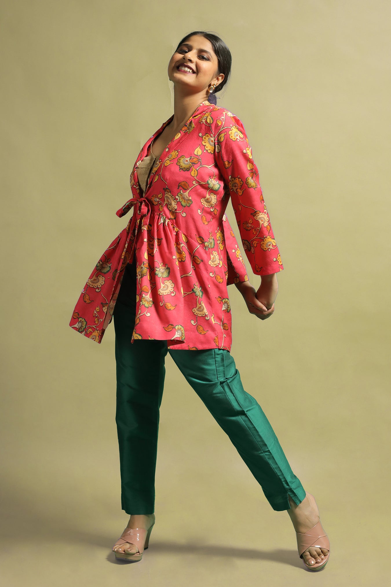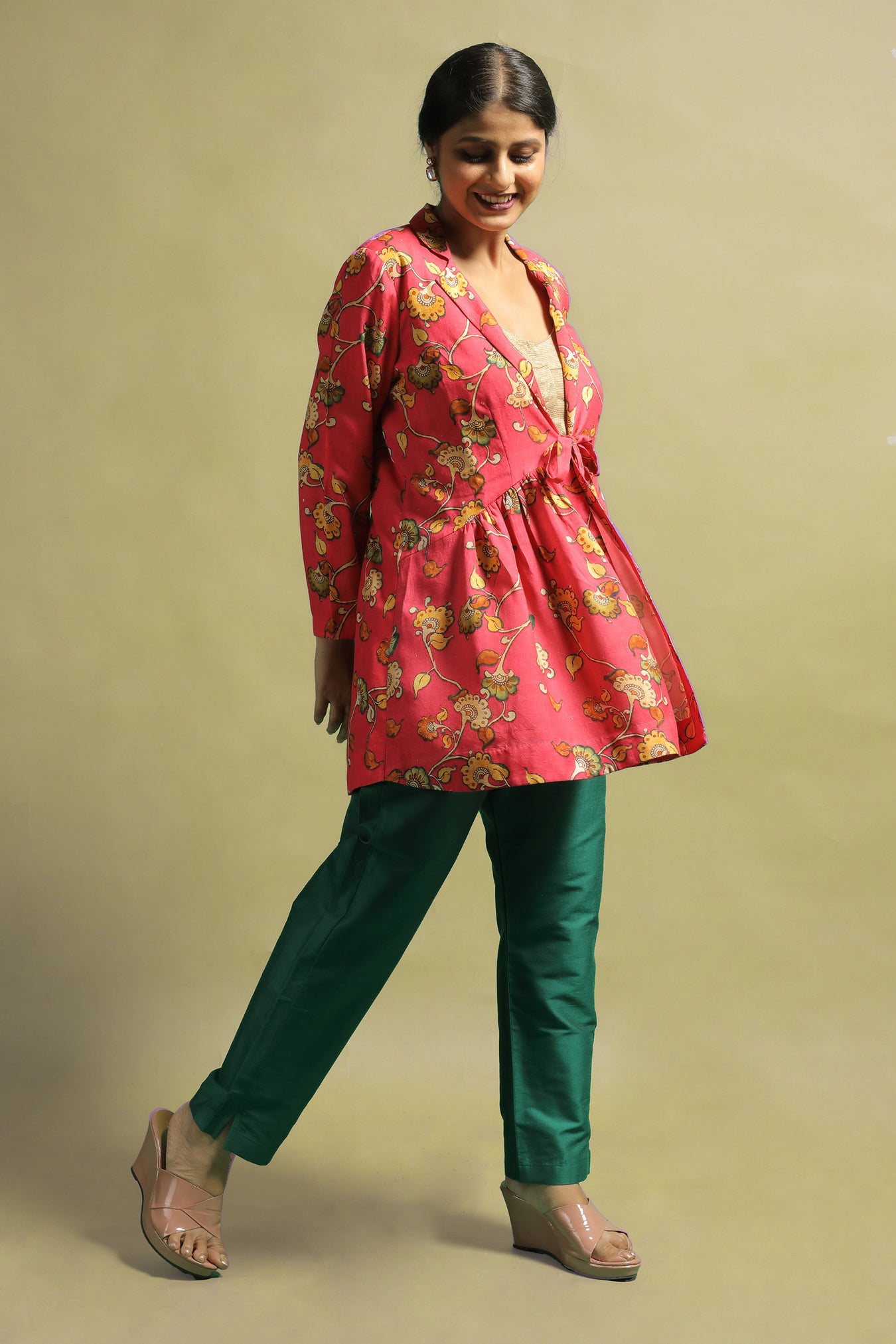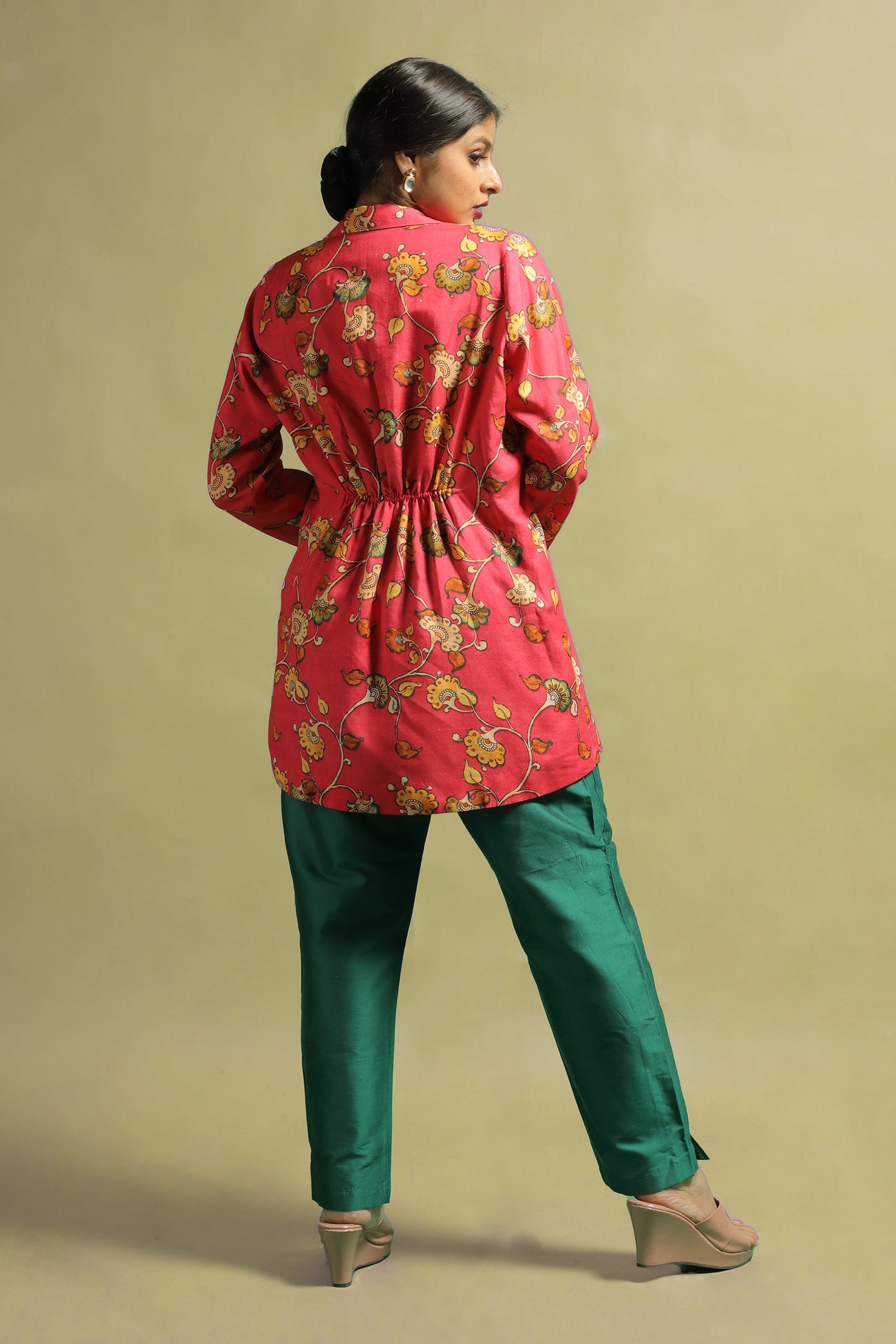 Cotton fabric was transformed into a sophisticated and fashionable jacket. The piece makes a statement while also adding a touch of elegance and authenticity with its stylized Kalamkari floral motifs printed in pastel tones on a bright vibrant base. This piece is one-of-a-kind due to the pastel toned motifs on a bold bright shade. The entire piece is highlighted by a V-shaped neckline with an open front and shirt collar. Own and style this piece to highlight your inner beauty and elegance, as well as to confidently and proudly flaunt the traditional look.