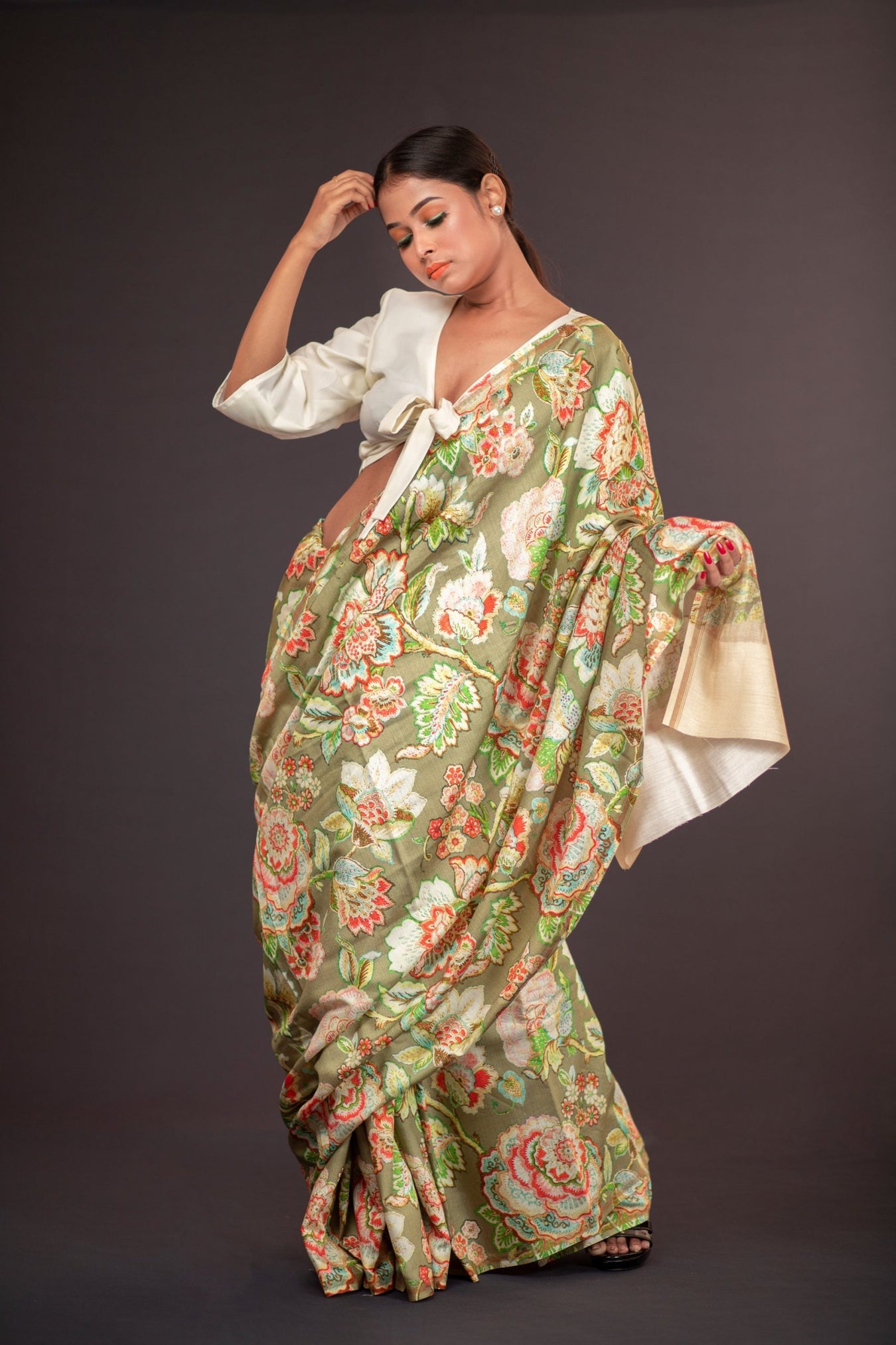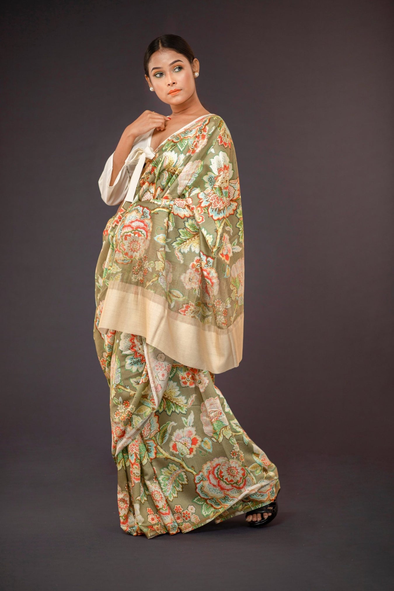 Fabric: Chanderi Zari Woven saree Color: Green Pattern and Print: Chanderi Silk Saree printed with Big floral pattern all over pale green colored base with small zari strip on the border, creating a stylish vintage look. The natural shine of the fabric, creates a beautiful aura for this piece of saree. The classic vintage look it gives, makes the wearer feel, confident, classic and sophisticated.  Silk Purity: Pure ChanderiPack Contains: 1 Saree, 1 BlouseCare Instructions: Dry wash                  Â