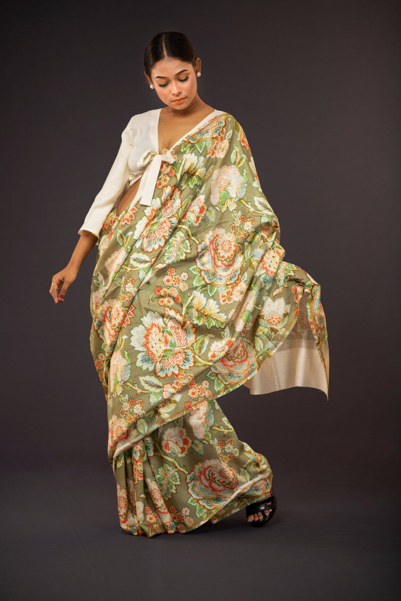 Vintage pale green Chanderi Silk saree. Pieced together with big bold floral prints make for a great addition to your trousseau.