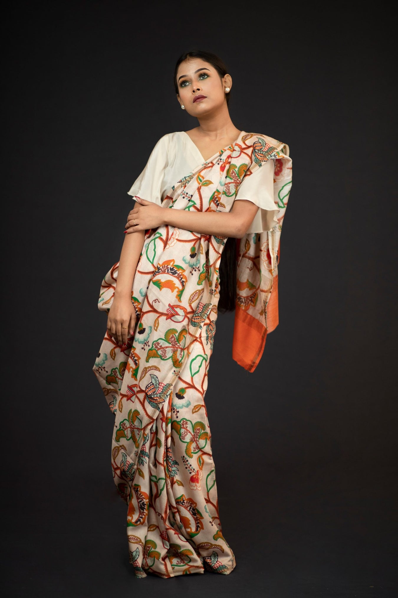 Chanderi Silk saree adorned with foilage patterns on a beautiful ivory cream-coloured saree. A perfectly dreamy saree.