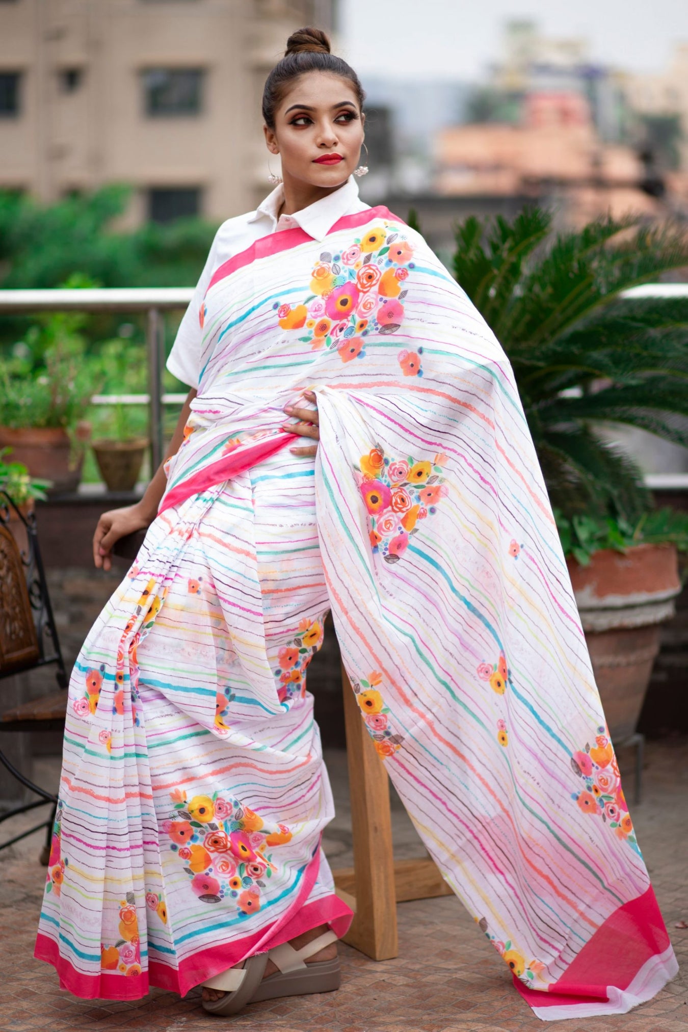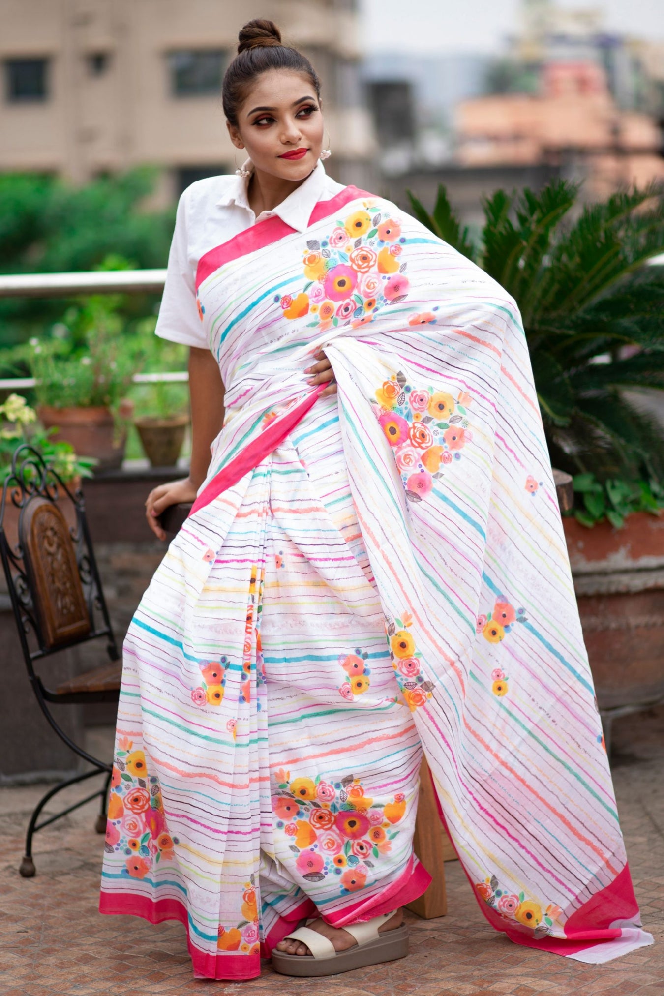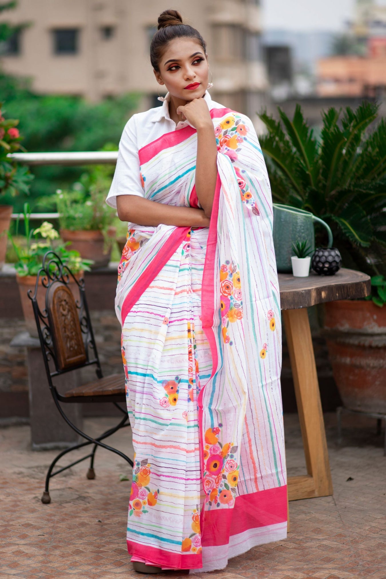Colour: whiteFabric: MulmulPattern and print: Mulmul Saree with water color stripes with floral bunch all over with a vibrant colored border. Portraits elegant, vibrancy, dream like look. It resonates soft, tenderness, making it a favorite piece for its comfort and easy drape-ability.