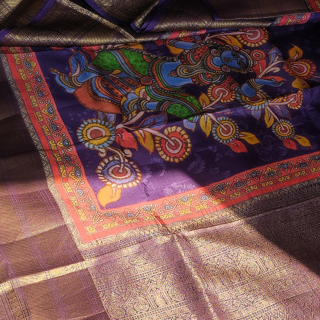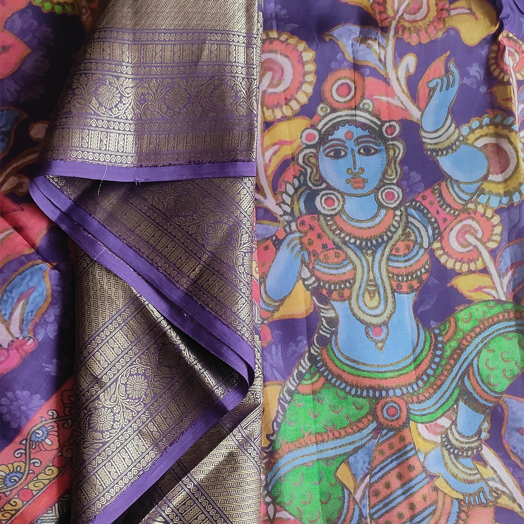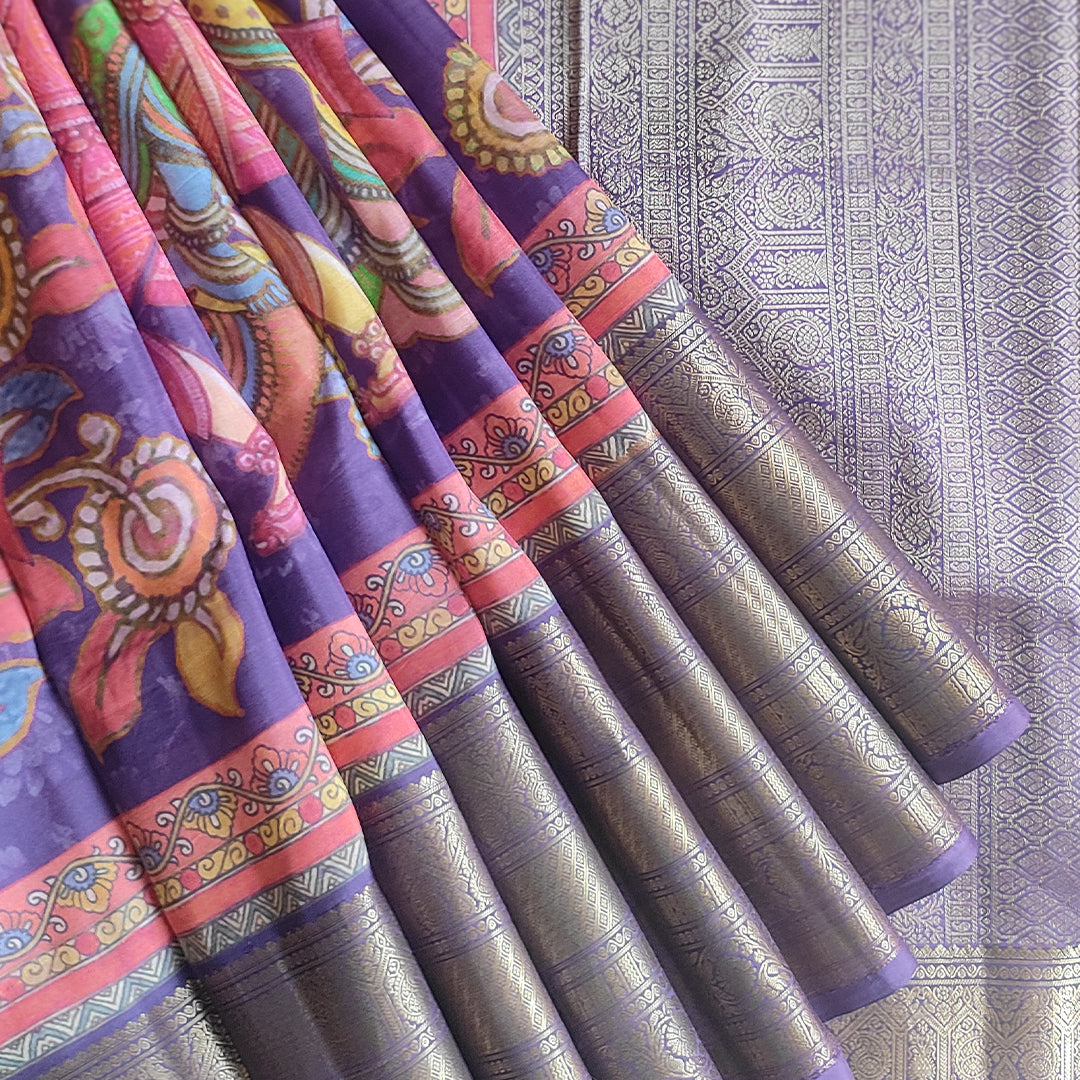 Size: 5.50Mtr B: 0.80MtrColour: violetFabric: Silk KanjivaramPattern and print: Kanjivaram saree with artworks of Kalamkari printed on all over the body. The saree has rich woven zari pallu and heavy zari woven border.This violet coloured kanjivaram saree with multi coloured motifs brings the essence of crafts through digital printing.