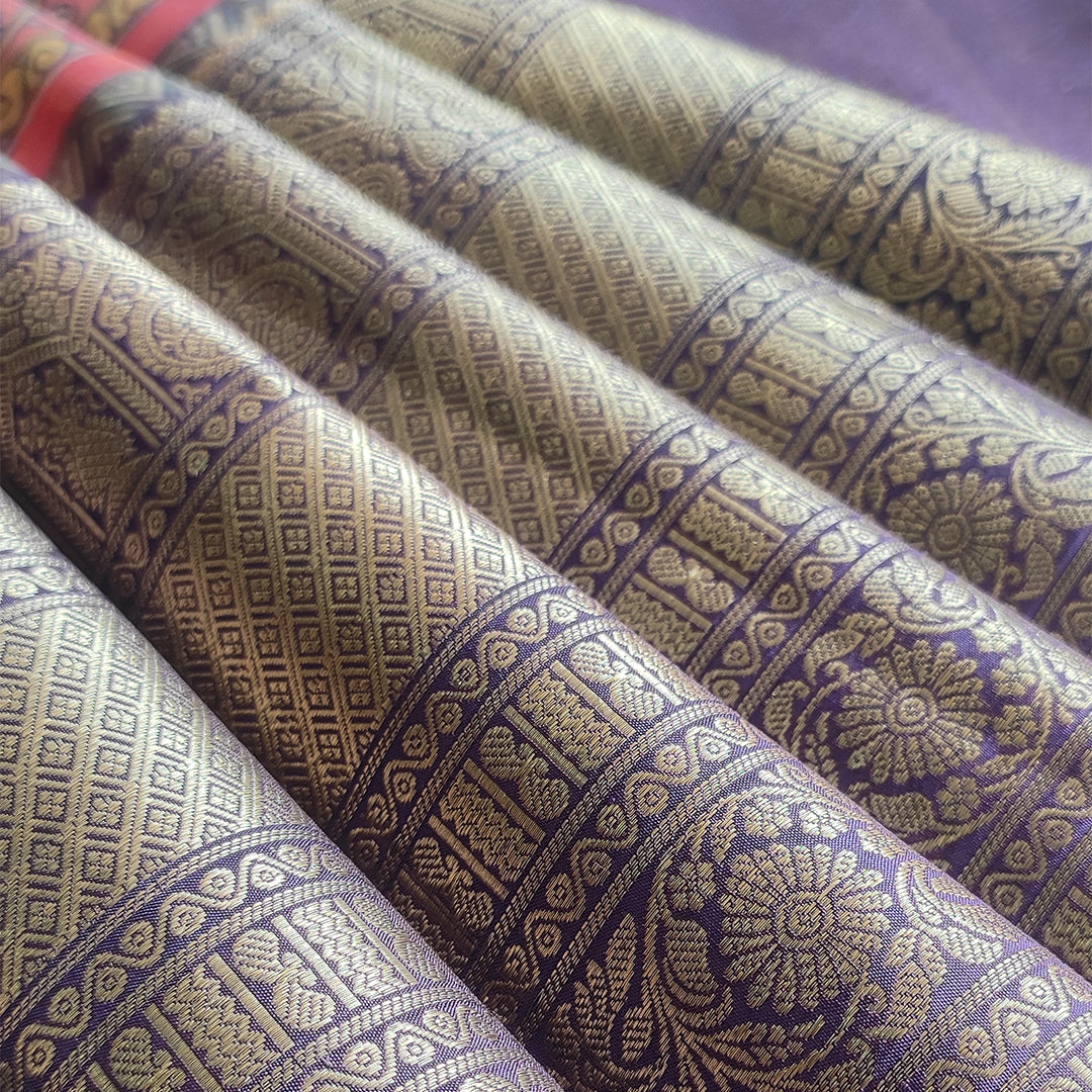 Immerse yourself in the splendor of a saree graced with a resplendent woven zari pallu and an elaborate zari border. The captivating colors and vibrant multicolored motifs showcase the beauty and intricacy of traditional artistry, masterfully showcased through the art of digital printing.