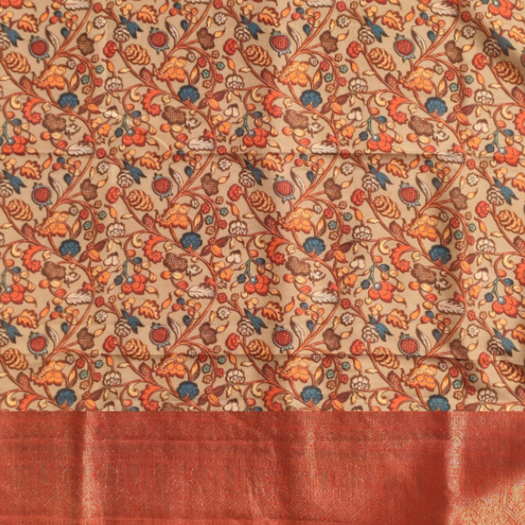 Size: 5.50Mtr B: 0.80MtrColour: BeigeFabric: Silk KanjivaramPattern and print: Kanjivaram saree with artworks of kalamkari printed on all over the body. The saree has rich woven zari pallu and heavy zari woven border.This beige color kanjivaram saree with multi color motifs brings the essence of crafts through digital printing.