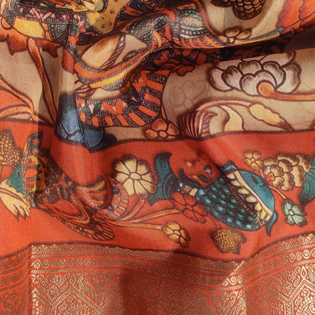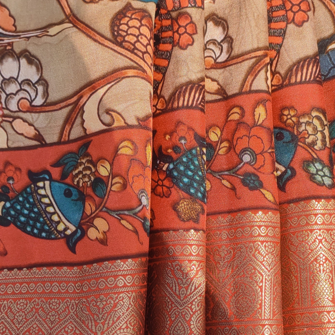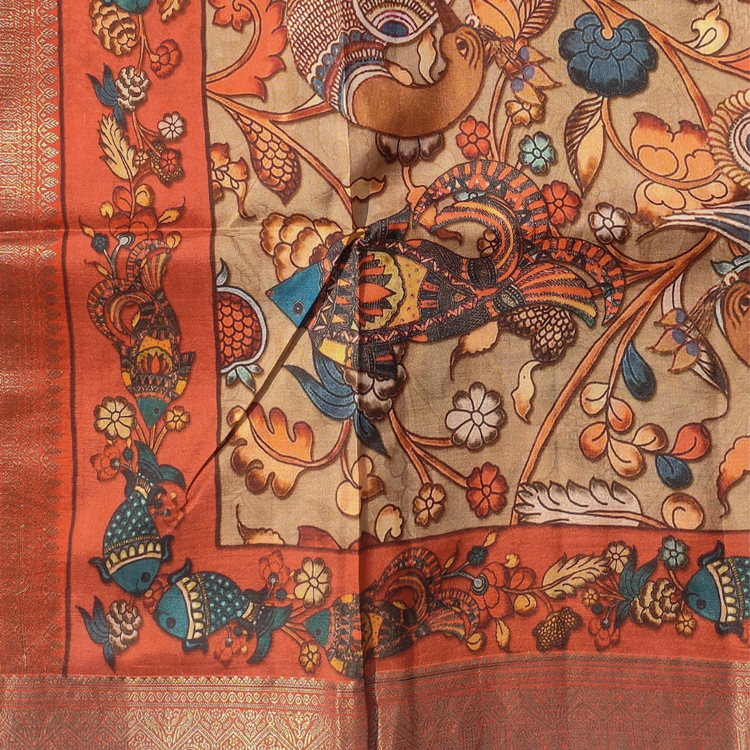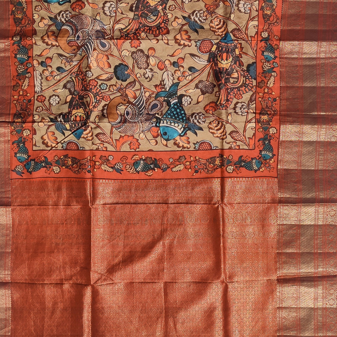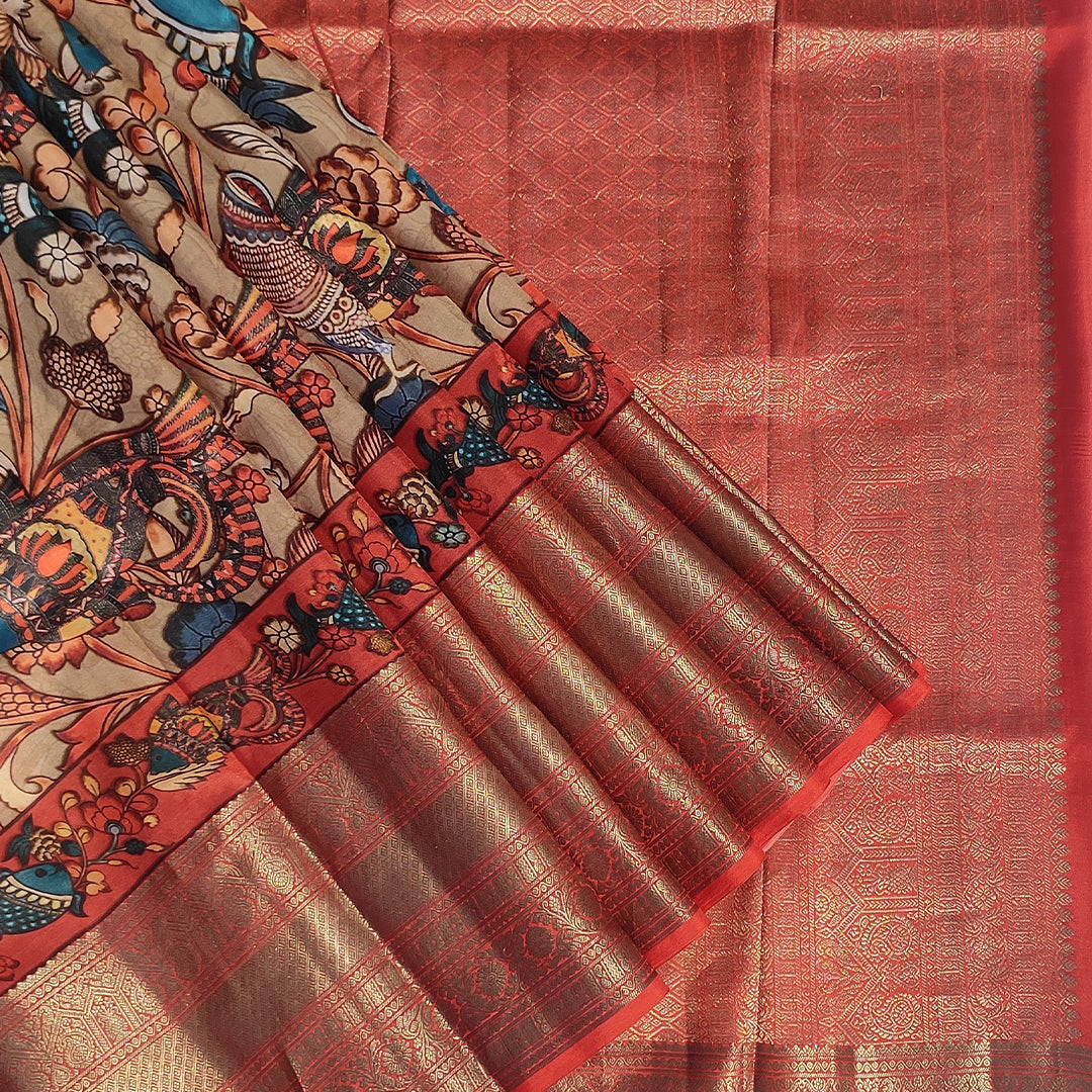 Experience the regal charm of a Kanjivaram saree adorned with intricate Kalamkari artwork. The saree features a lustrous woven zari pallu and a lavish zari border beautifully brought to life through digital printing.