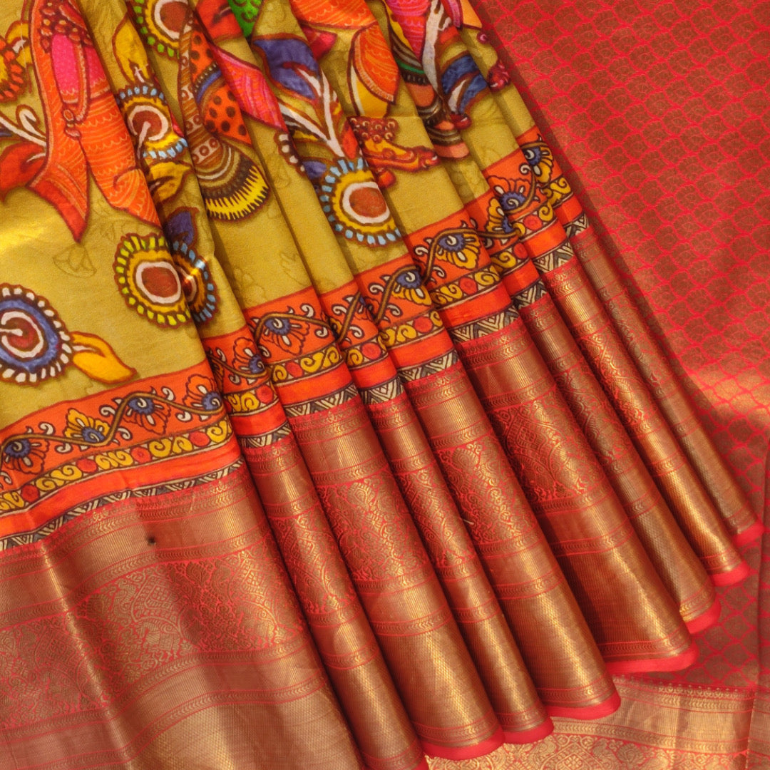 Size: 5.50Mtr B: 0.80MtrColour: MustardFabric: Silk KanjivaramPattern and print: Kanjivaram saree with artworks of Kalamkari printed on all over the body. The saree has rich woven zari pallu and heavy zari woven border.This mustard color kanjivaram saree with multi color motifs brings the essence ofcrafts through digital printing.