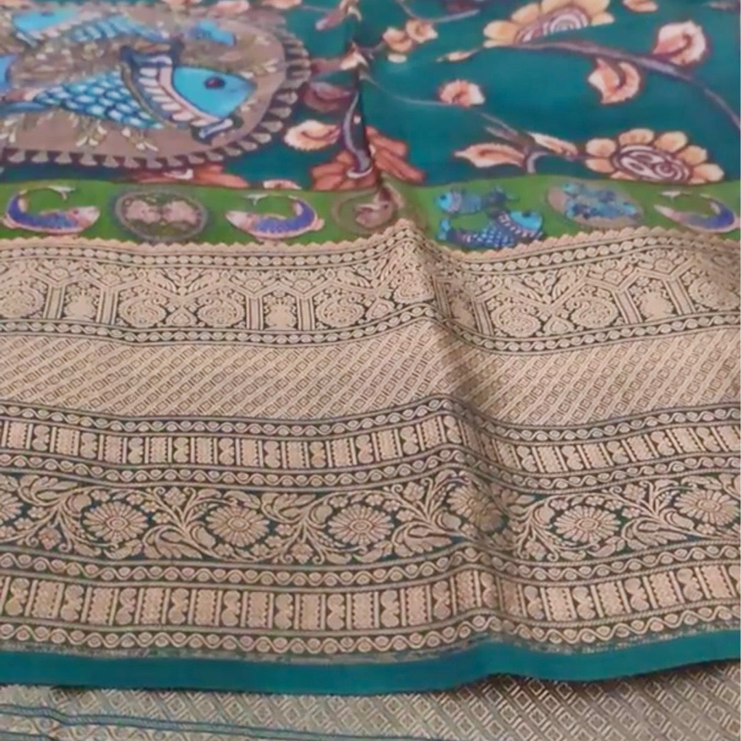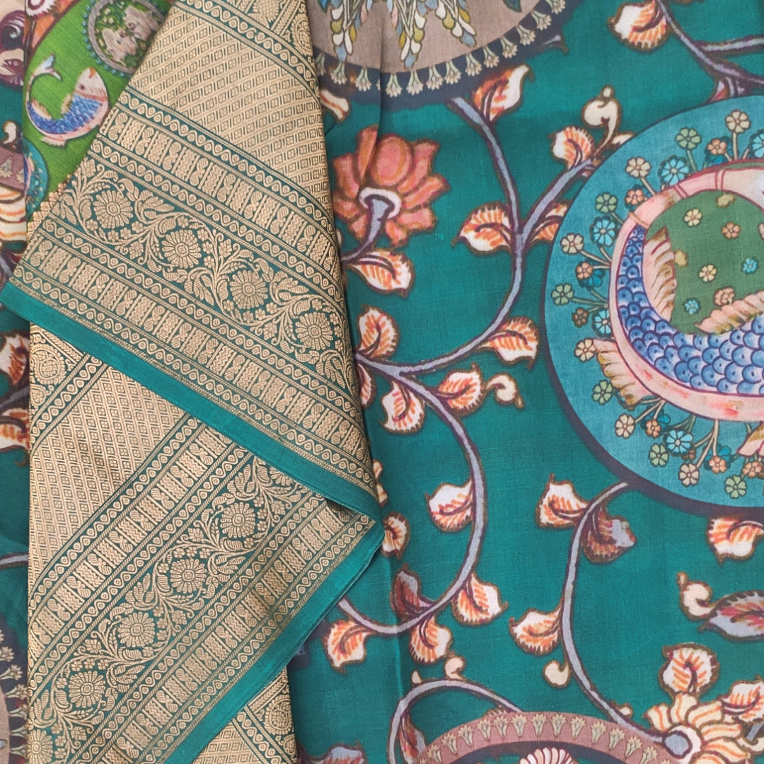 Size: 5.50Mtr B: 0.80MtrColour: Teal BlueFabric: Silk KanjivaramPattern and print: Kanjivaram saree with artworks of kalamkari printed on all over the body. The saree has rich woven zari pallu and heavy zari woven border.This teal color kanjivaram saree with multi color kalamkari motifs brings the essence of crafts through digital printing.