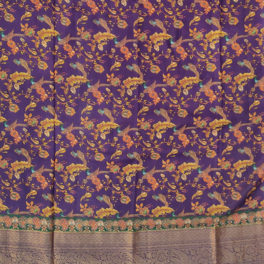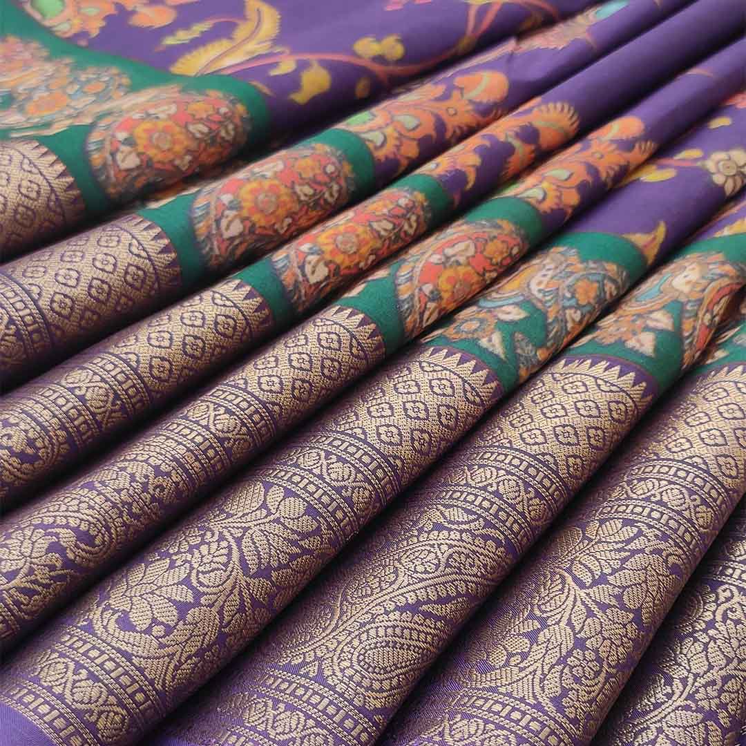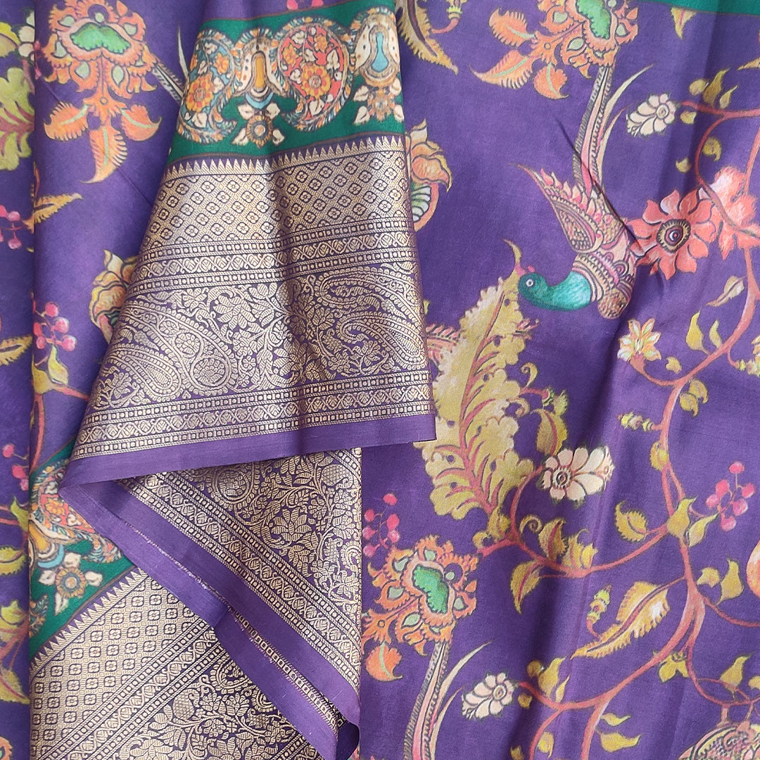 Size: 5.50Mtr B: 0.80MtrColour: violetFabric: Silk KanjivaramPattern and print: Kanjivaram saree with artworks of Kalamkari printed on all over the body. The saree has rich woven zari pallu and heavy zari woven border.This violet coloured kanjivaram saree with multi coloured motifs brings the essence of crafts through digital printing.Pack contains: 1 Saree, 1 BlouseCare instructions: Dry wash