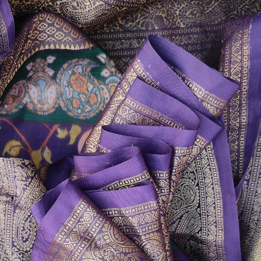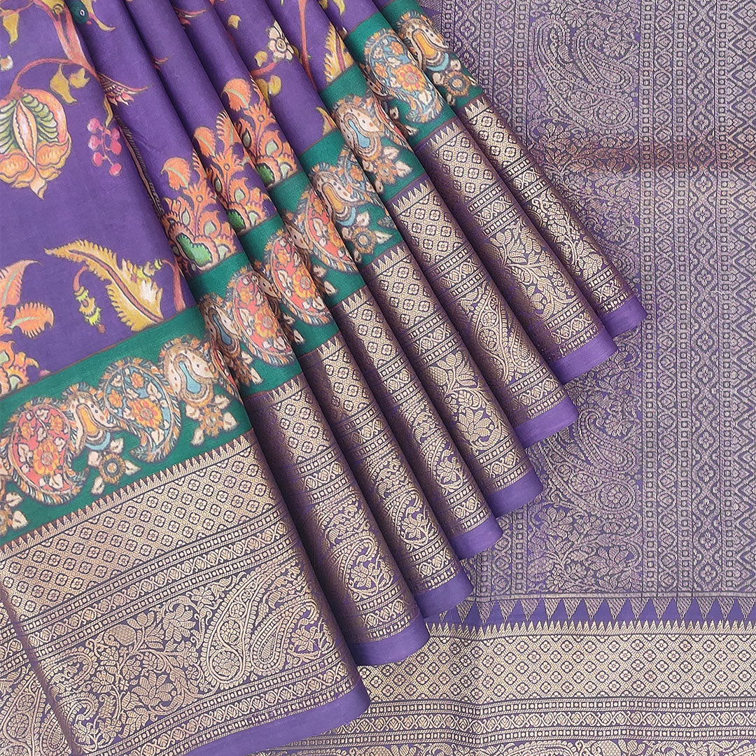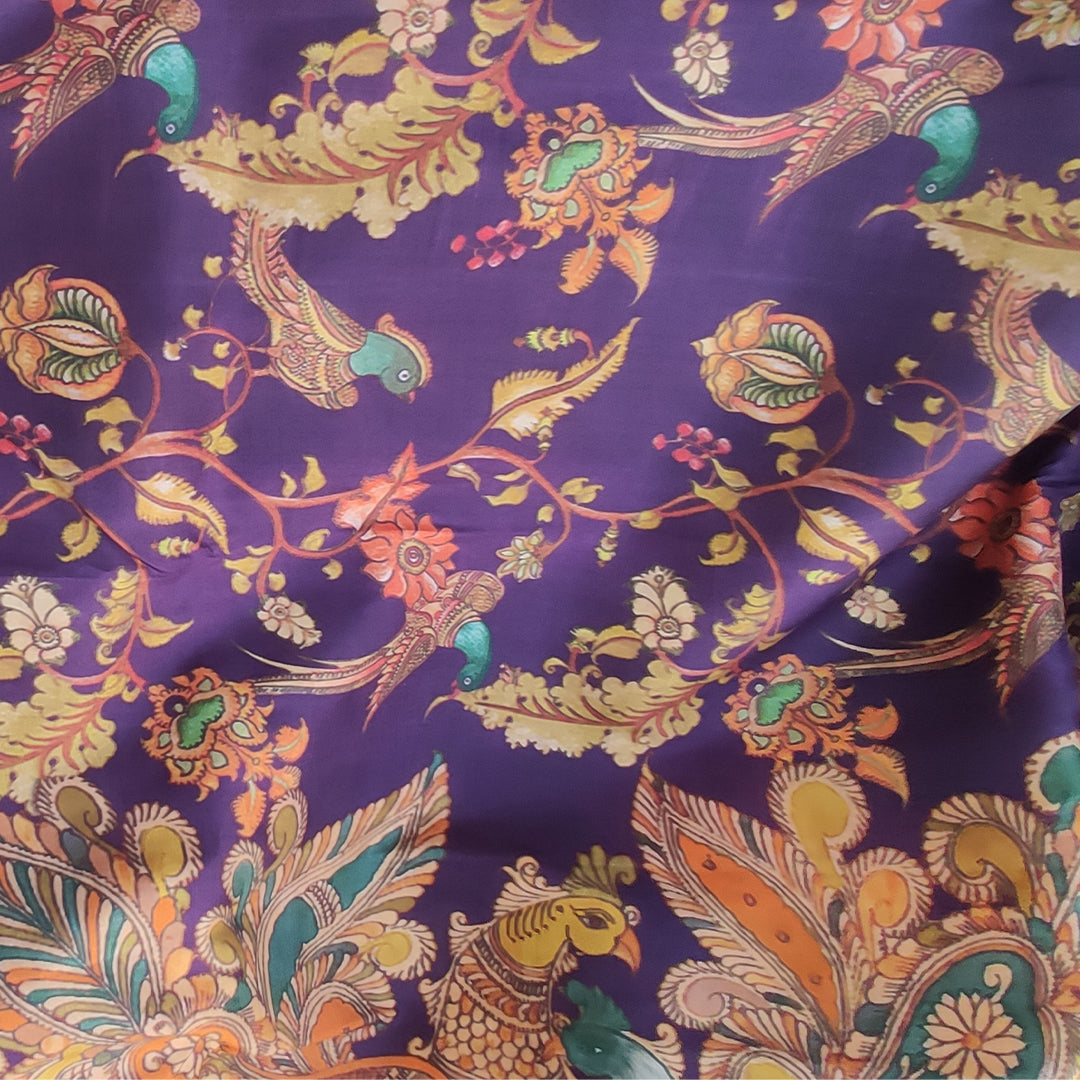 Size: 5.50Mtr B: 0.80MtrColour: violetFabric: Silk KanjivaramPattern and print: Kanjivaram saree with artworks of Kalamkari printed on all over the body. The saree has rich woven zari pallu and heavy zari woven border.This violet coloured kanjivaram saree with multi coloured motifs brings the essence of crafts through digital printing.Pack contains: 1 Saree, 1 BlouseCare instructions: Dry wash