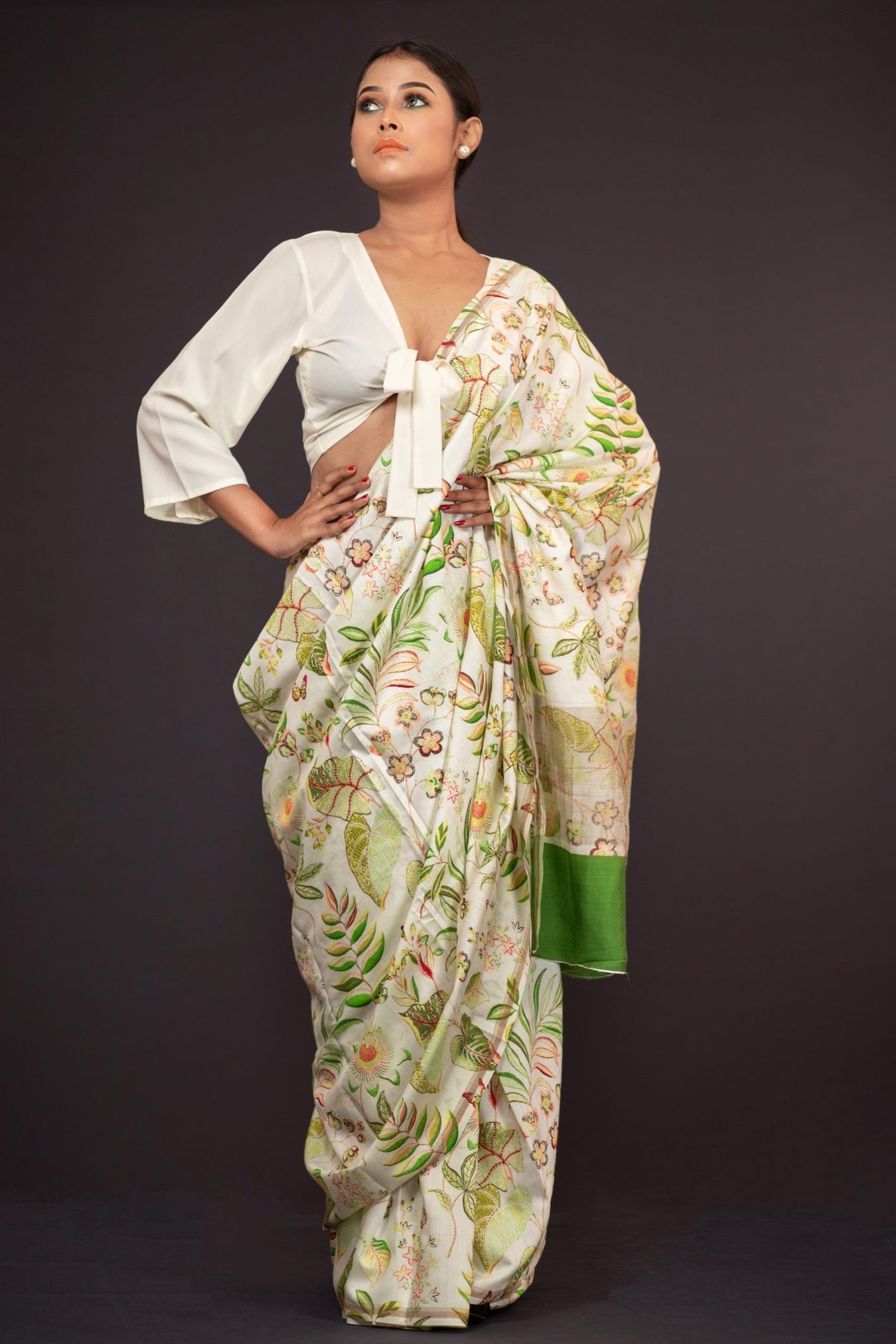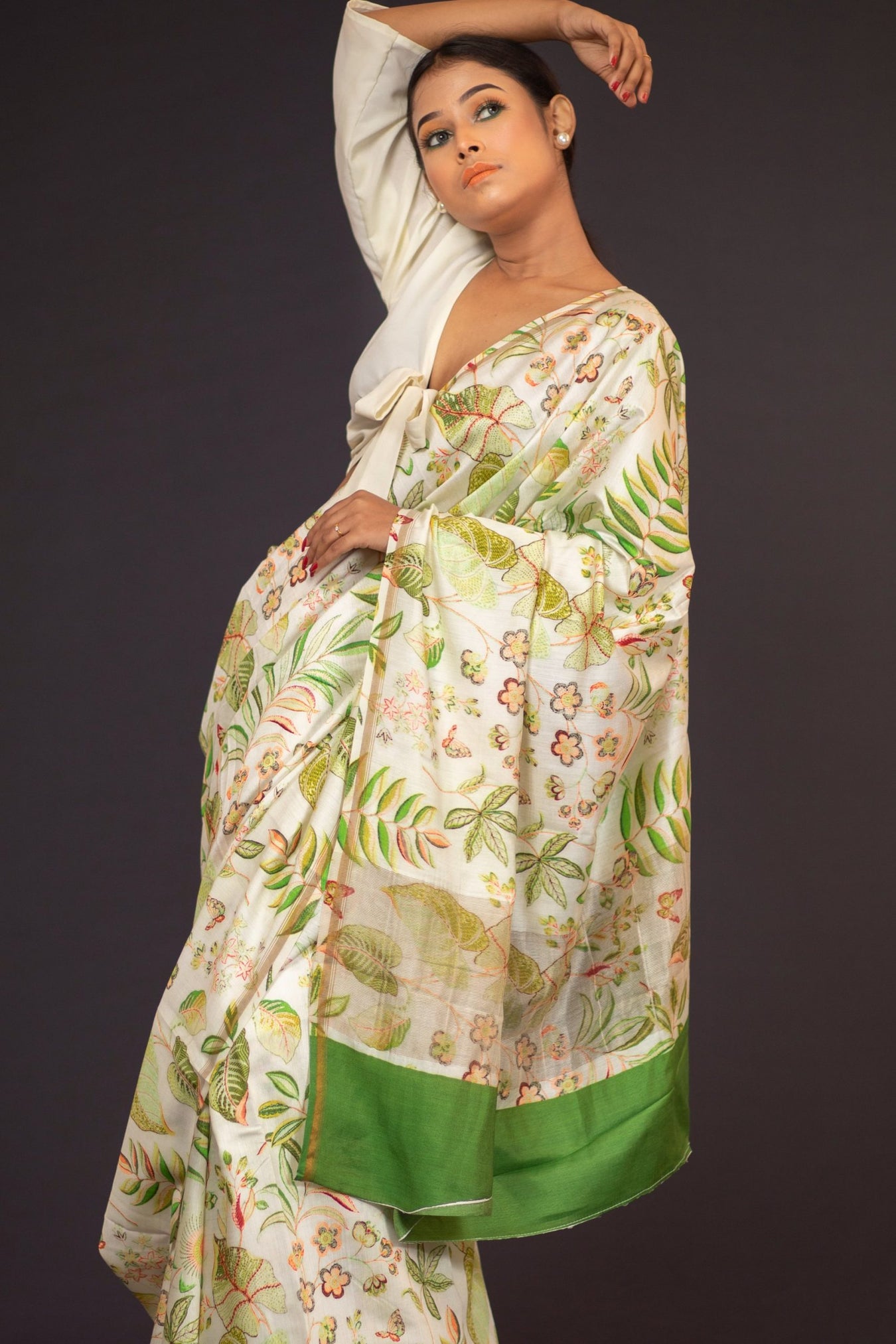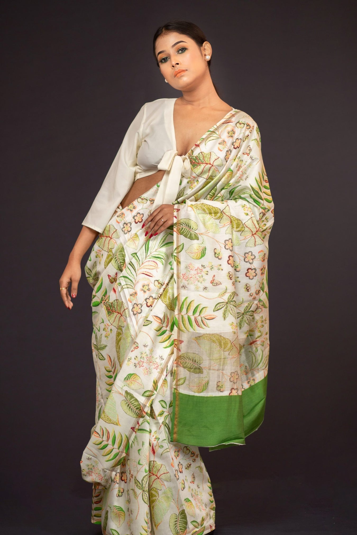Fabric: Chanderi Zari Woven saree Color: Light Beige and greenPattern and Print: Tropical vines printed on Oyster cream colored Chanderi Silk saree with added zari strip border. The shades of pastel tropical colors highlights the prints. The whole saree gives a classic look making it suitable for everyday wear. Silk Purity: Pure ChanderiPack Contains: 1 Saree, 1 BlouseCare Instructions: Dry wash