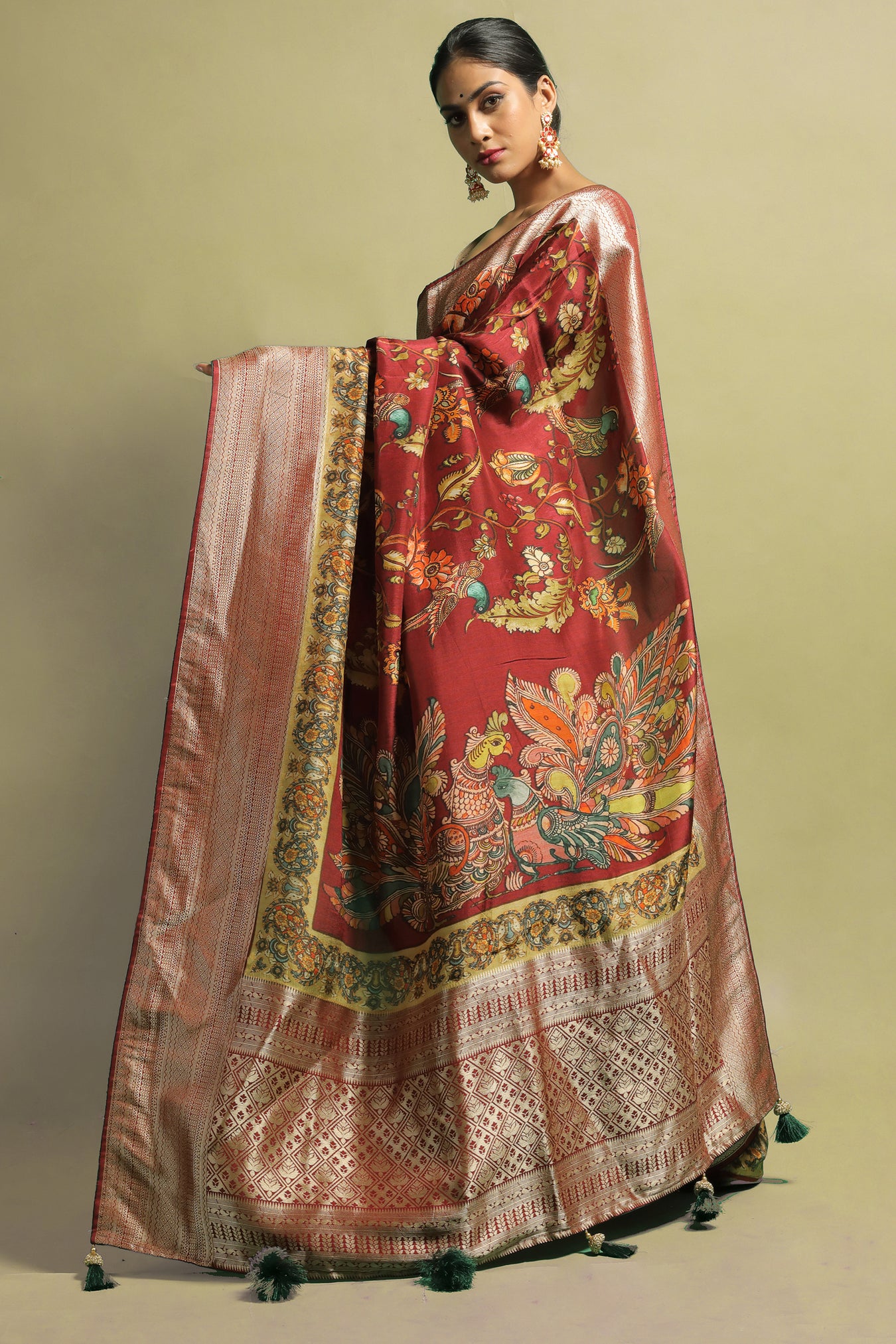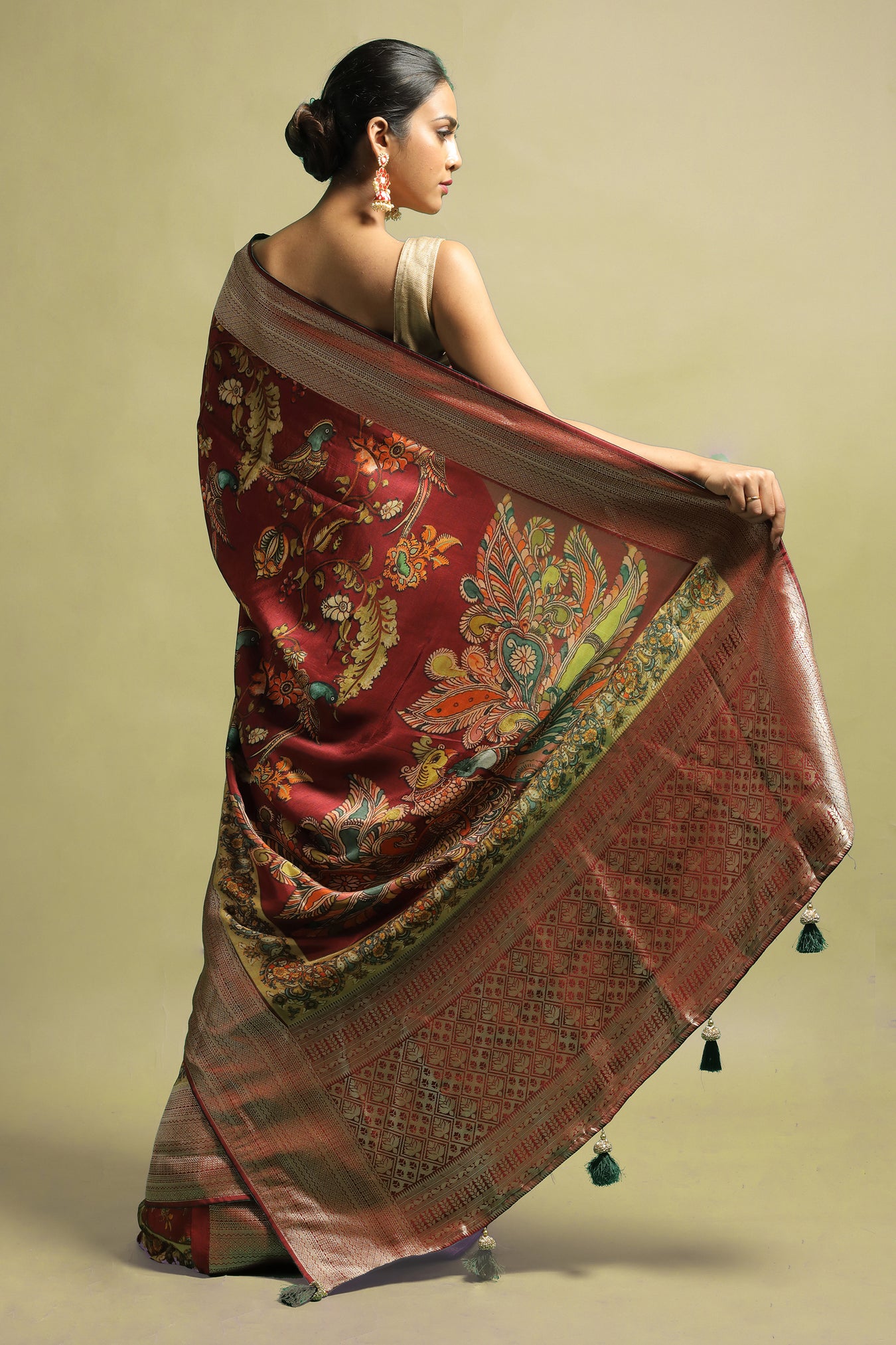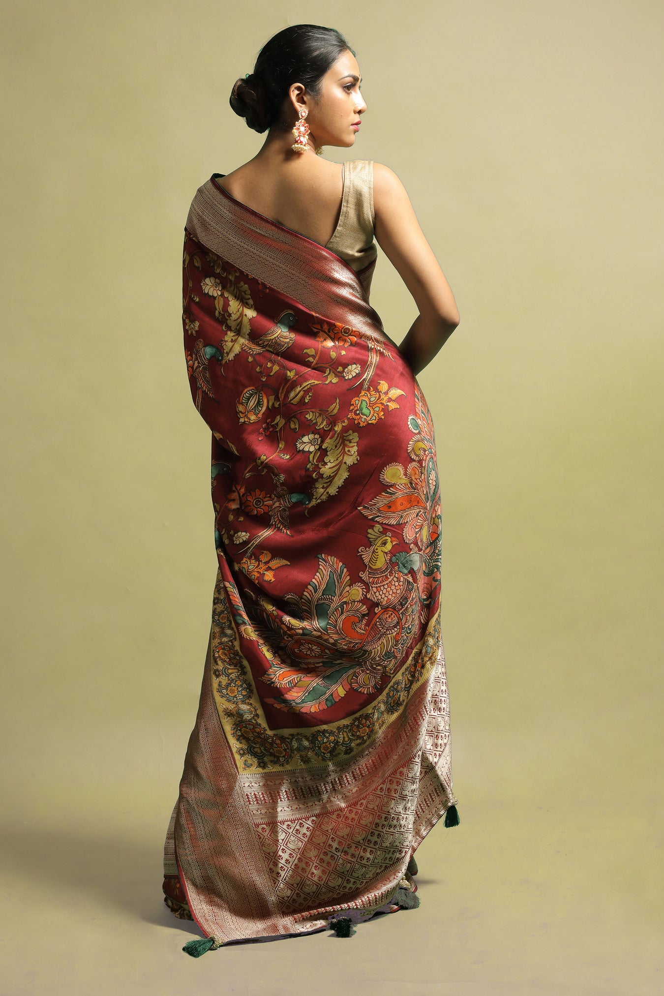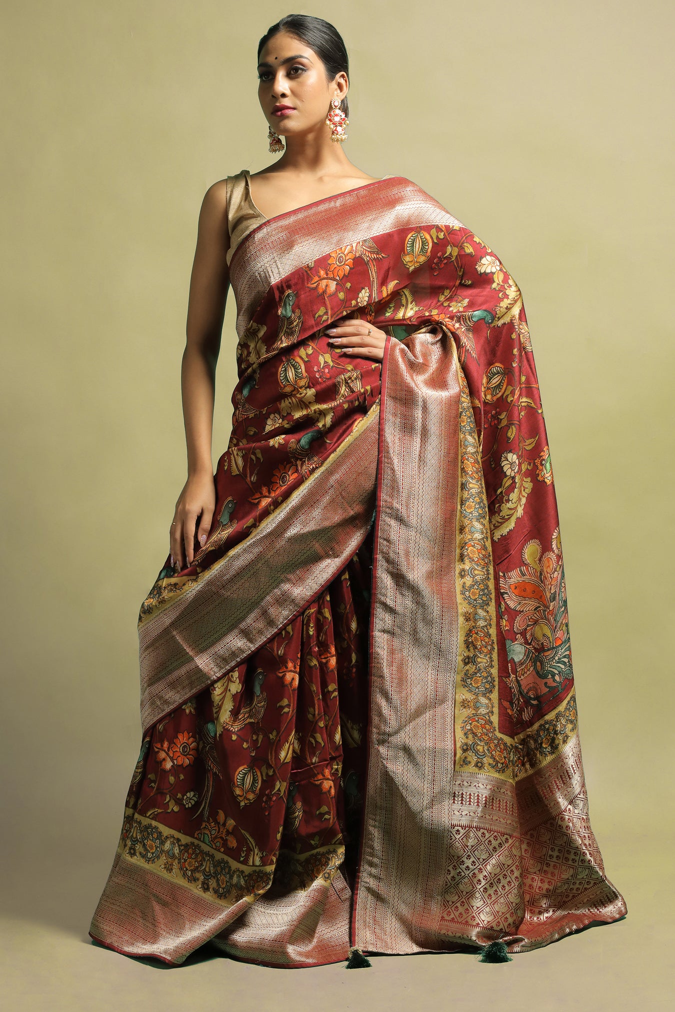Colour: MeroonFabric: KHADDI ZARI SILKPattern and print: Step into elegance with our Khaddi Silk Saree. Adorned with delicate zari work, it radiates regal charm. The soft fabric gracefully envelops feminine curves, while traditional kalamkari prints add a touch of heritage. Perfect for celebrating Indian artistry, this saree's detailed pallu and playful tassels complete the look with finesse. Embrace the beauty of tradition in every fold."Care instructions:Â Dry wash
