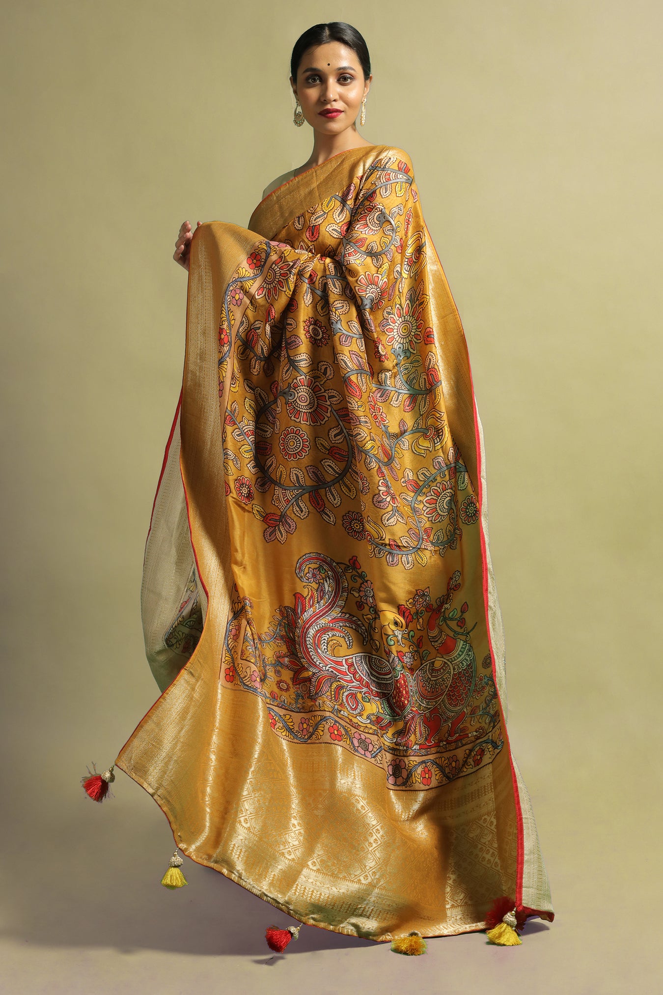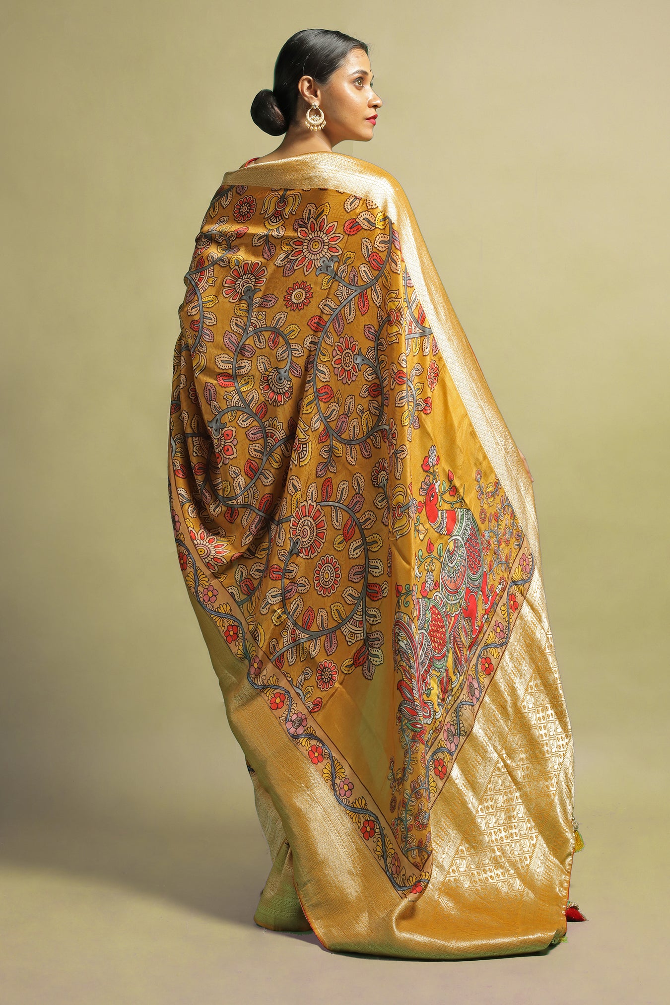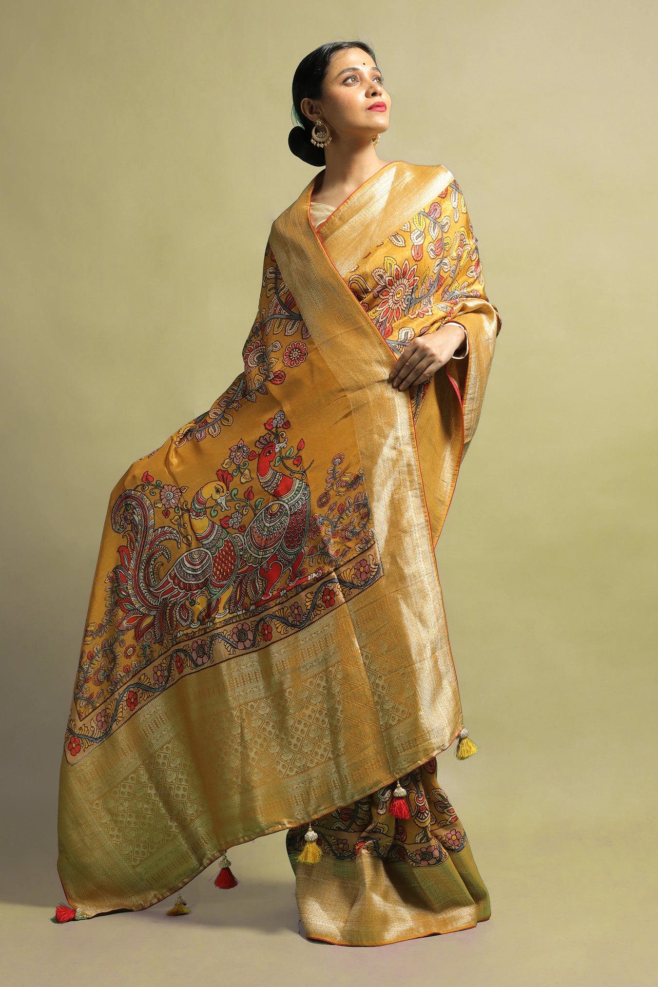 The intricate zari work and the vibrant mustard lustrous fabric create a royal allure. The eye catching kalamkari prints and detailed designs, this saree celebrates Indian artistry and tradition.